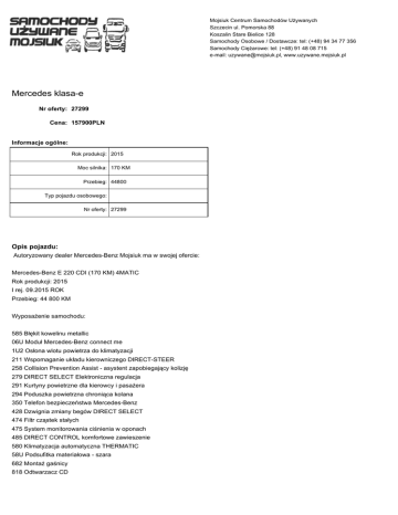 Mojsiuk Centrum Samochodów Używanych Szczecin ul. Pomorska 88 Koszalin Stare Bielice 128 Samochody Osobowe / Dostawcze: tel: (+48) 94 34 77 356 Samochody Ciężarowe: tel: (+48) 91 48 08 715 e-mail: [email protected], www.uzywane.mojsiuk.pl Mercedes klasa-e Nr oferty: 27299 Cena: 157900PLN Informacje ogólne: Rok produkcji: 2015 Moc silnika: 170 KM Przebieg: 44800 Typ pojazdu osobowego: Nr oferty: 27299 Opis pojazdu: Autoryzowany dealer Mercedes-Benz Mojsiuk ma w swojej ofercie: Mercedes-Benz E 220 CDI (170 KM) 4MATIC Rok produkcji: 2015 I rej. 09.2015 ROK Przebieg: 44 800 KM Wyposażenie samochodu: 585 Błękit kowelinu metallic 06U Moduł Mercedes-Benz connect me 1U2 Osłona wlotu powietrza do klimatyzacji 211 Wspomaganie układu kierowniczego DIRECT-STEER 258 Collision Prevention Assist - asystent zapobiegający kolizję 279 DIRECT SELECT Elektroniczna regulacja 291 Kurtyny powietrzne dla kierowcy i pasażera 294 Poduszka powietrzna chroniąca kolana 350 Telefon bezpieczeństwa Mercedes-Benz 428 Dzwignia zmiany begów DIRECT SELECT 474 Filtr cząstek stałych 475 System monitorowania ciśnienia w oponach 485 DIRECT CONTROL komfortowe zawieszenie 580 Klimatyzacja automatyczna THERMATIC 58U Podsufitka materiałowa - szara 682 Montaż gaśnicy 818 Odtwarzacz CD 927 Norma czystości spalin EU6 B03 Funkcja start/stop B16 Chromowana końcówka układu wydechowego D0A Gaśnica D0C Dokumentacja Mercedes-Benz D0D Transport do dealera DD12 Premium Pack Avantgarde 235 Aktywny asystent parkowania 522 Przygotowanie do nawigacji Garmin 642 Dynamiczne reflektory w technologii LED 954 AVANTGARDE K11 Adaptacyjne światła hamowania (migające) Oświetlenie wnętrza Ambiente z regul. natężenia P49 Pakiet lusterek 249 Pakiet lusterka 500 Elektrycznie składane lusterka zewnętrzne P54 Pakiet zabezpieczenia pojazdu 551 Alarm antywłamaniowy (EDW) 882 Zabezpieczenie wnętrza pojazdu U12 Dywaniki welurowe U77 Diesel Emission control BLUETEC (SCR) Bezwypadkowy Serwisowany Zadbany Jeden właściciel Niniejsze ogłoszenie jest wyłącznie informacją handlową i nie stanowi oferty w myśl art. 66, § 1. Kodeksu Cywilnego. Sprzedający nie odpowiada za ewentualne błędy lub nieaktualność ogłoszenia. KONTAKT HANDLOWY: TEL. 692-409-582 TEL. 795-142-622 Jeżeli w naszej ofercie nie ma samochodu który Państwa interesuje proszę o kontakt telefoniczny pod nr tel. 795-142-622 lub przybycie do siedziby naszej firmy Mercedes-Benz Mojsiuk przy ul. Pomorskiej 88. Istnieje możliwość wyszukania indywidualnej oferty na samochód używany. 795-142-622 Jest to informacja handlowa nie stanowiąca oferty w rozumieniu prawa cywilnego, kolory na zdjęciach mogą być inne niż w rzeczywistości. Oferta nie przedstawia rzeczywistych stanów magazynowych