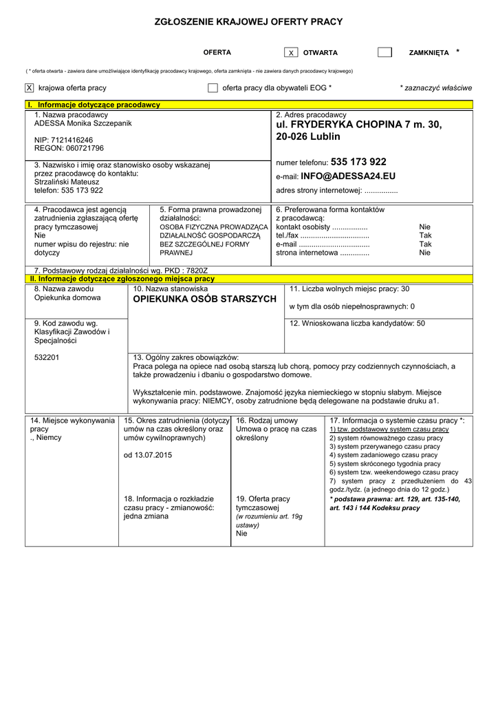 ZGŁOSZENIE KRAJOWEJ OFERTY PRACY OFERTA X OTWARTA ZAMKNIĘTA * ( * oferta otwarta - zawiera dane umożliwiające identyfikację pracodawcy krajowego, oferta zamknięta - nie zawiera danych pracodawcy krajowego) X krajowa oferta pracy I. Informacje dotyczące pracodawcy 1. Nazwa pracodawcy ADESSA Monika Szczepanik 2. Adres pracodawcy ul. FRYDERYKA CHOPINA 7 m. 30, 20-026 Lublin NIP: 7121416246 REGON: 060721796 numer telefonu: 535 3. Nazwisko i imię oraz stanowisko osoby wskazanej przez pracodawcę do kontaktu: Strzaliński Mateusz telefon: 535 173 922 4. Pracodawca jest agencją zatrudnienia zgłaszającą ofertę pracy tymczasowej Nie numer wpisu do rejestru: nie dotyczy 173 922 e-mail: [email protected] adres strony internetowej: ................ 5. Forma prawna prowadzonej działalności: OSOBA FIZYCZNA PROWADZĄCA DZIAŁALNOŚĆ GOSPODARCZĄ BEZ SZCZEGÓLNEJ FORMY PRAWNEJ 7. Podstawowy rodzaj działalności wg. PKD : 7820Z II. Informacje dotyczące zgłoszonego miejsca pracy 8. Nazwa zawodu 10. Nazwa stanowiska Opiekunka domowa OPIEKUNKA OSÓB 6. Preferowana forma kontaktów z pracodawcą: kontakt osobisty ................. tel./fax ................................. e-mail .................................. strona internetowa .............. Nie Tak Tak Nie 11. Liczba wolnych miejsc pracy: 30 STARSZYCH 9. Kod zawodu wg. Klasyfikacji Zawodów i Specjalności 532201 * zaznaczyć właściwe oferta pracy dla obywateli EOG * w tym dla osób niepełnosprawnych: 0 12. Wnioskowana liczba kandydatów: 50 13. Ogólny zakres obowiązków: Praca polega na opiece nad osobą starszą lub chorą, pomocy przy codziennych czynnościach, a także prowadzeniu i dbaniu o gospodarstwo domowe. Wykształcenie min. podstawowe. Znajomość języka niemieckiego w stopniu słabym. Miejsce wykonywania pracy: NIEMCY, osoby zatrudnione będą delegowane na podstawie druku a1. 14. Miejsce wykonywania pracy ., Niemcy 15. Okres zatrudnienia (dotyczy 16. Rodzaj umowy umów na czas określony oraz Umowa o pracę na czas umów cywilnoprawnych) określony od 13.07.2015 18. Informacja o rozkładzie czasu pracy - zmianowość: jedna zmiana 19. Oferta pracy tymczasowej (w rozumieniu art. 19g ustawy) Nie 17. Informacja o systemie czasu pracy *: 1) tzw. podstawowy system czasu pracy 2) system równoważnego czasu pracy 3) system przerywanego czasu pracy 4) system zadaniowego czasu pracy 5) system skróconego tygodnia pracy 6) system tzw. weekendowego czasu pracy 7) system pracy z przedłużeniem do 43 godz./tydz. (a jednego dnia do 12 godz.) * podstawa prawna: art. 129, art. 135-140, art. 143 i 144 Kodeksu pracy 20. Wysokość proponowanego wynagrodzenia (brutto) od 5 500,00 21. System wynagradzania (miesięczny, akordowy, prowizyjny, czasowy) Czasowy ze stawką miesięczną 22. Wymiar czasu pracy (liczba godz. w okresie rozliczeniowym): 1 ( 40.00 godzin) 23. Godziny pracy: 7-20 24. Data rozpoczęcia pracy: 13.07.2015 III. Oczekiwania pracodawcy krajowego wobec kandydatów do pracy 25. Wymagania dotyczące kandydata: rodzaj wymagania - zawód - język obcy opis staż waga Opiekunka domowa niemiecki, poziom znaj. w mowie: słaby, poziom znaj. w piśmie: słaby podstawowe, typ: brak 0.00 konieczne 0.00 konieczne - wykształcenie 0.00 konieczne - pozostałe wymagania - informacja o liczbie osób zarejestrowanych spełniających oczekiwania pracodawcy (w szczególności, gdy więcej osób zarejestrowanych spełnia wymagania określone w krajowej ofercie pracy, niż jest miejsc pracy zgłoszonych w ofercie) : Nie 26. Pracodawca jest szczególnie zainteresowany zatrudnieniem kandydata z państw EOG - Nie (jakie państwa: .............................................................................................................................................................................) W przypadku odpowiedzi twierdzącej proszę uzupełnić dane zamieszczone poniżej: 27. Informacje uzupełniające w przypadku oferty pracy dla obywateli EOG w zakresie: - Wymagania w zakresie znajomości jęz. polskiego z określeniem ..................................................................................... poziomu znajomości: - Wymagania dot. języka w jakim kandydaci z państw EOG mają ..................................................................................... przekazać dokumenty aplikacyjne: - Możliwość zapewnienia zakwaterowania lub wyżywienia wraz z ..................................................................................... informacją kto ponosi koszty: - Możliwość i warunki sfinansowania/dofinansowania kosztów ..................................................................................... podróży lub przeprowadzki: - Przyczyny wykonywania pracy w innym miejscu niż siedziba ..................................................................................... pracodawcy krajowego: - Wskazanie państw EOG, w których oferta pracy ma być dodatkowo ..................................................................................... upowszechniona: - Inne informacje niezbędne ze względu na charakter wykonywanej ..................................................................................... pracy: IV. Dane dotyczące postępowania z ofertą 28. Okres aktualności oferty 29. Częstotliwość kontaktów z pracodawcą lub pracownikiem wskazanym do kontaktów od 03.07.2015 do 31.07.2015 Częstotliwość kontaktów PUP: RAZ NA MIESIĄC 30. Upowszechnianie informacji o ofercie pracy: Tak 1) Inne powiatowe urzędy pracy (jakie?) ........................................................................................................................ Oświadczam, że oferta jest / nie jest * w tym samym czasie zgłoszona do innego powiatowego urzędu pracy na terenie kraju. Czy oferta pracy ma zostać upowszechniona w sposób umożliwiający identyfikację pracodawcy? Tak Oświadczam, że w okresie 365 dni przed dniem zgłoszenia oferty pracy zostałem / nie zostałem * ukarany lub skazany 