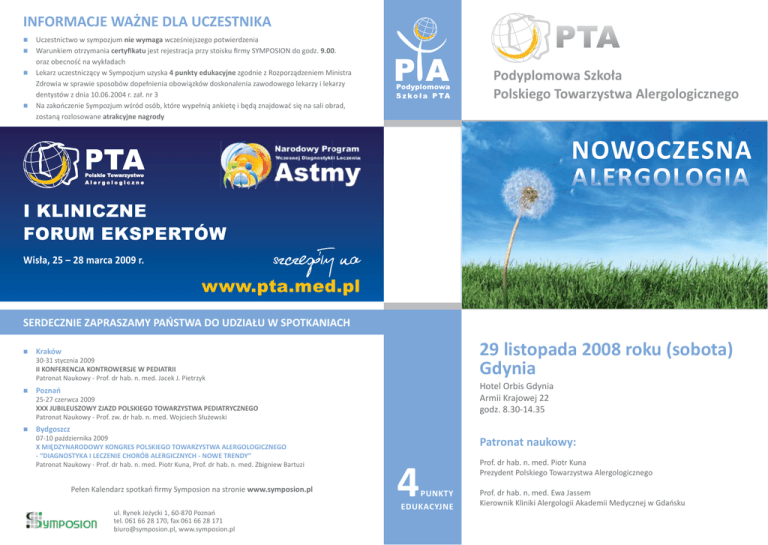 INFORMACJE WAŻNE DLA UCZESTNIKA Uczestnictwo w sympozjum nie wymaga wcześniejszego potwierdzenia Warunkiem otrzymania certyfikatu jest rejestracja przy stoisku firmy SYMPOSION do godz. 9.00. oraz obecność na wykładach Lekarz uczestniczący w Sympozjum uzyska 4 punkty edukacyjne zgodnie z Rozporządzeniem Ministra Zdrowia w sprawie sposobów dopełnienia obowiązków doskonalenia zawodowego lekarzy i lekarzy dentystów z dnia 10.06.2004 r. zał. nr 3 Na zakończenie Sympozjum wśród osób, które wypełnią ankietę i będą znajdować się na sali obrad, zostaną rozlosowane atrakcyjne nagrody Podyplomowa Szkoła Polskiego Towarzystwa Alergologicznego NOWOCZESNA ALERGOLOGIA I KLINICZNE FORUM EKSPERTÓW Wisła, 25 – 28 marca 2009 r. szczegó³y na www.pta.med.pl SERDECZNIE ZAPRASZAMY PAŃSTWA DO UDZIAŁU W SPOTKANIACH 29 listopada 2008 roku (sobota) Gdynia Kraków 30-31 stycznia 2009 II KONFERENCJA KONTROWERSJE W PEDIATRII Patronat Naukowy - Prof. dr hab. n. med. Jacek J. Pietrzyk Hotel Orbis Gdynia Armii Krajowej 22 godz. 8.30-14.35 Poznań 25-27 czerwca 2009 XXX JUBILEUSZOWY ZJAZD POLSKIEGO TOWARZYSTWA PEDIATRYCZNEGO Patronat Naukowy - Prof. zw. dr hab. n. med. Wojciech Służewski Bydgoszcz 07-10 października 2009 X MIĘDZYNARODOWY KONGRES POLSKIEGO TOWARZYSTWA ALERGOLOGICZNEGO - “DIAGNOSTYKA I LECZENIE CHORÓB ALERGICZNYCH - NOWE TRENDY” Patronat Naukowy - Prof. dr hab. n. med. Piotr Kuna, Prof. dr hab. n. med. Zbigniew Bartuzi Pełen Kalendarz spotkań firmy Symposion na stronie www.symposion.pl ul. Rynek Jeżycki 1, 60-870 Poznań tel. 061 66 28 170, fax 061 66 28 171 [email protected], www.symposion.pl Patronat naukowy: 4 PUNKTY EDUKACYJNE Prof. dr hab. n. med. Piotr Kuna Prezydent Polskiego Towarzystwa Alergologicznego Prof. dr hab. n. med. Ewa Jassem Kierownik Kliniki Alergologii Akademii Medycznej w Gdańsku PROGRAM GŁÓWNI PARTNERZY SYMPOZJUM 8.30-9.00 Rejestracja uczestników Zwiedzanie wystawy medycznej 9.00-9.05 Otwarcie konferencji 9.05-9.35 Co nowego w leczeniu AZS? Prof. dr hab. med. Roman Nowicki, Gdańsk 9.40-10.10 Nowe kierunki rozpoznawania i leczenia astmy Prof. dr hab. med. Ewa Jassem, Gdańsk 10.15-10.45 Miejsce glikokortykosteroidów w leczeniu alergicznego nieżytu nosa według wytycznych ARIA Prof. dr hab. med. Bolesław Samoliński, Warszawa PARTNERZY ALK ABELLO ASTELLAS PHARMA BAUSCH AND LOMB MEDA PERFFARMA STALLERGENES/EWOPHARMA 10.50-10.55 Avamys - nowy lek w alergicznym nieżycie nosa 10.55-11.25 Immunoterapia alergenowa – co wiemy na pewno Prof. dr hab. med. Barbara Rogala, Zabrze 11.30-12.00 Fenotypy astmy - droga do skuteczniejszej terapii Prof. dr hab. med. Piotr Kuna, Łódź 12.05-12.35 Przerwa na kawę 12.35-13.05 Aerozoloterapia: nowe leki, nowe inhalatory Prof. dr hab. med. Piotr Kuna, Łódź 13.10-13.15 Prezentacja firmy Berlin Chemie Leczenie inhalacyjne – czego nie można lekceważyć? 13.15-13.45 Leki antyhistaminowe - co nowego w 2007/2008? Prof. dr hab. med. Jerzy Kruszewski, Warszawa 13.50-13.55 Prezentacja firmy UCB Pharma XYZAL – od farmakokinetyki do skuteczności klinicznej 13.55-14.25 Aktualne zasady postępowania diagnostyczno-leczniczego w pokrzywce Prof. dr hab. med. Magdalena Czarnecka-Operacz, Poznań 14.30-14.35 Zamknięcie Sympozjum Losowanie nagród. Wręczanie certyfikatów uczestnictwa. Po każdym z wykładów przewidziana jest 5 min. dyskusja.