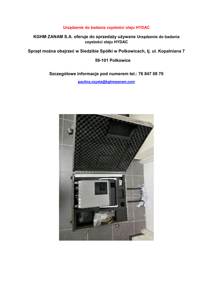 Urządzenie do badania czystości oleju HYDAC KGHM ZANAM S.A. oferuje do sprzedaży używane Urządzenie do badania czystości oleju HYDAC Sprzęt można obejrzeć w Siedzibie Spółki w Polkowicach, tj. ul. Kopalniana 7 59-101 Polkowice Szczegółowe informacje pod numerem tel.: 76 847 08 70 [email protected]