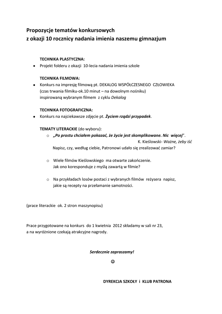 Propozycje tematów konkursowych z okazji 10 rocznicy nadania imienia naszemu gimnazjum TECHNIKA PLASTYCZNA: Projekt folderu z okazji 10-lecia nadania imienia szkole TECHNIKA FILMOWA: Konkurs na impresję filmową pt. DEKALOG WSPÓŁCZESNEGO CZŁOWIEKA (czas trwania filmiku-ok.10 minut – na dowolnym nośniku) inspirowaną wybranym filmem z cyklu Dekalog TECHNIKA FOTOGRAFICZNA: Konkurs na najciekawsze zdjęcie pt. Życiem rządzi przypadek. TEMATY LITERACKIE (do wyboru): o „Po prostu chciałem pokazać, że życie jest skomplikowane. Nic więcej”. K. Kieślowski- Ważne, żeby iść Napisz, czy, według ciebie, Patronowi udało się zrealizowad zamiar? o Wiele filmów Kieślowskiego ma otwarte zakooczenie. Jak ono koresponduje z myślą zawartą w filmie? o Na przykładach losów postaci z wybranych filmów reżysera napisz, jakie są recepty na przełamanie samotności. (prace literackie ok. 2 stron maszynopisu) Prace przygotowane na konkurs do 1 kwietnia 2012 składamy w sali nr 23, a na wyróżnione czekają atrakcyjne nagrody. Serdecznie zapraszamy! DYREKCJA SZKOŁY i KLUB PATRONA