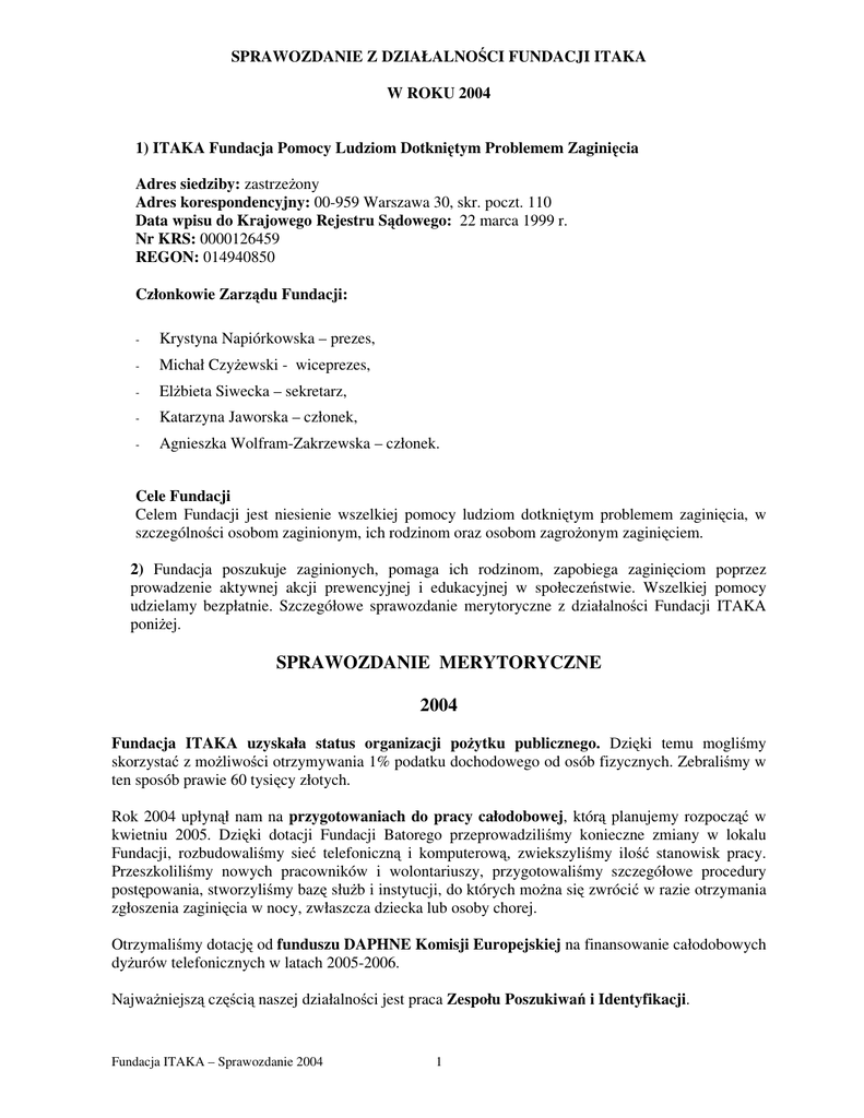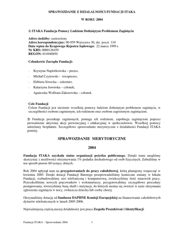 SPRAWOZDANIE Z DZIAŁALNO CI FUNDACJI ITAKA W ROKU 2004 1) ITAKA Fundacja Pomocy Ludziom Dotkni tym Problemem Zagini cia Adres siedziby: zastrze ony Adres korespondencyjny: 00-959 Warszawa 30, skr. poczt. 110 Data wpisu do Krajowego Rejestru S dowego: 22 marca 1999 r. Nr KRS: 0000126459 REGON: 014940850 Członkowie Zarz du Fundacji: - Krystyna Napiórkowska – prezes, - Michał Czy ewski - wiceprezes, - El bieta Siwecka – sekretarz, - Katarzyna Jaworska – członek, - Agnieszka Wolfram-Zakrzewska – członek. Cele Fundacji Celem Fundacji jest niesienie wszelkiej pomocy ludziom dotkni tym problemem zagini cia, w szczególno ci osobom zaginionym, ich rodzinom oraz osobom zagro onym zagini ciem. 2) Fundacja poszukuje zaginionych, pomaga ich rodzinom, zapobiega zagini ciom poprzez prowadzenie aktywnej akcji prewencyjnej i edukacyjnej w społecze stwie. Wszelkiej pomocy udzielamy bezpłatnie. Szczegółowe sprawozdanie merytoryczne z działalno ci Fundacji ITAKA poni ej. SPRAWOZDANIE MERYTORYCZNE 2004 Fundacja ITAKA uzyskała status organizacji po ytku publicznego. Dzi ki temu mogli my skorzysta z mo liwo ci otrzymywania 1% podatku dochodowego od osób fizycznych. Zebrali my w ten sposób prawie 60 tysi cy złotych. Rok 2004 upłyn ł nam na przygotowaniach do pracy całodobowej, któr planujemy rozpocz w kwietniu 2005. Dzi ki dotacji Fundacji Batorego przeprowadzili my konieczne zmiany w lokalu Fundacji, rozbudowali my sie telefoniczn i komputerow , zwiekszyli my ilo stanowisk pracy. Przeszkolili my nowych pracowników i wolontariuszy, przygotowali my szczegółowe procedury post powania, stworzyli my baz słu b i instytucji, do których mo na si zwróci w razie otrzymania zgłoszenia zagini cia w nocy, zwłaszcza dziecka lub osoby chorej. Otrzymali my dotacj od funduszu DAPHNE Komisji Europejskiej na finansowanie całodobowych dy urów telefonicznych w latach 2005-2006. Najwa niejsz cz ci naszej działalno ci jest praca Zespołu Poszukiwa i Identyfikacji. Fundacja ITAKA – Sprawozdanie 2004 1 W 2004 r. zgłoszono do Fundacji 800 zagini , aktualnie poszukujemy ponad tysi ca osób, próbujemy ustali to samo stu kilkudziesi ciu osób NN. Od pocz tku istnienia Fundacji zaj li my si ju ponad trzema tysi cami trzystoma przypadkami zagini , 69% z nich zostało wyja nionych. Od dwóch lat otrzymujemy mniej wi cej stał liczb zgłosze , jednak coraz wi cej jest w ród nich zgłosze zagini cia osób nieletnich, szczególnie nastolatków. Te sprawy wymagaj znacznie szybszej reakcji, wi kszej uwagi. Realizowany przez Zespół Poszukiwa i Identyfikacji projekt “Broszura” wygrał konkurs ogłoszony przez Ministerstwo Polityki Społecznej i został wpisany do Katalogu Dobrych Praktyk. Drugi najwa niejszy z projektów ITAKI to Telefon Zaufania. Psycholog jest dost pny przez cały tydzie , nie tylko w godzinach dy urów. Od jesieni 2003 prowadzimy terapie indywidualne dla rodzin zaginionych i osób w ałobie. Korzysta z nich kilkadziesi t osób. Psychologowie pomagaj zaginionym wróci do domu, przygotowuj do tego powrotu obie strony, pomagaj rozwi za konflikty, które były przyczyn odej cia, nierzadko podejmuj mediacj mi dzy członkami rodziny. Spotkania grup wsparcia dla rodzin zaginionych odbywaj si dwa razy w miesi cu – osobne spotkania dla osób w ałobie. Prawnicy dy uruj przy telefonie dwa razy w tygodniu, pracownik socjalny został zatrudniony na stałe i jest dost pny przez cały tydzie . www.zaginieni.pl – strony internetowe Fundacji ITAKA odwiedza miesi cznie 90 - 100 tysi cy internautów. To znaczny wzrost w stosunku do roku ubiegłego. Rzadko która organizacja pozarz dowa w Polsce mo e pochwali si tak ilo ci wizyt na stronie www. Zanotowali my ju półtora miliona wizyt na naszych stronach. Kontynuujemy program “Nie uciekaj” skierowany do młodzie y, nauczycieli, rodziców. Nasi trenerzy prowadz w warszawskich gimnazjach warsztaty, podczas których pokazuj młodzie y, jak rozwi zywa problemy, tak aby ucieczka nie była jedynym wyj ciem z trudnej sytuacji. Zaj cia ciesz si du ym powodzeniem, szczególnie w ród dzieci. Stale zgłaszaj si do nas nowe szkoły zainteresowane warsztatami. W ramach programu „Nie uciekaj” 25 maja 2004 obchodzili my po raz drugi Mi dzynarodowy Dzie Dziecka Zaginionego. W rezydencji Ambasady Belgii w Warszawie zorganizowali my konferencj prasow na temat problemu ucieczek nastolatków, przyczyn, skutków i sposobów zapobiegania. W konferencji wzi li udział równie przedstawiciele Komendy Głównej Policji i stowarzyszenia TADA. Efektem były liczne publikacje w mediach. Stworzyli my now , znacznie ciekawsz i zawieraj c wi cej informacji, stron internetow www.nieuciekaj.pl . Antydepresyjny Telefon Zaufania działa dwa razy w tygodniu po trzy godziny. Dy uruj cy przy telefonie lekarze psychiatrzy udzielaj porad chorym z objawami depresji i ich rodzinom, podaj adresy Poradni Zdrowia Psychicznego, namawiaj do podj cia leczenia. Lekarz odpowiada te na pytania chorych i ich rodzin przysyłane mailem na adres www.leczdepresje.pl . Jest to jedyna taka inicjatywa w Polsce. Europejskie Forum Ekonomiczne (27 kwietnia – 1 maja 2004). Fundacja ITAKA współpracowała ze Sztabem Medycznym Mazowieckiego Centrum Zarz dzania Kryzysowego przy zabezpieczaniu Europejskiego Szczytu Gospodarczego. W tym czasie uruchomili my (działaj ce 24 godziny na dob ) Centrum Informacji o Poszkodowanych i Zaginionych, którego celem było gromadzenie informacji o osobach zaginionych i poszkodowanych w wyniku zamieszek antyglobalistów lub ewentualnego zamachu terrorystycznego. Współpracowali my na bie co z policj i sztabem medycznym. W razie konieczno ci byli my gotowi do uruchomienia Punktu Informacji i Wsparcia, w którym rodziny osób zaginionych lub poszkodowanych mogły zgłosi zagini cie osoby bliskiej i uzyska psychologiczne wsparcie. Na stronie internetowej www.zaginieni.pl od pocz tku szczytu działała Fundacja ITAKA – Sprawozdanie 2004 2 specjalnie w tym celu utw