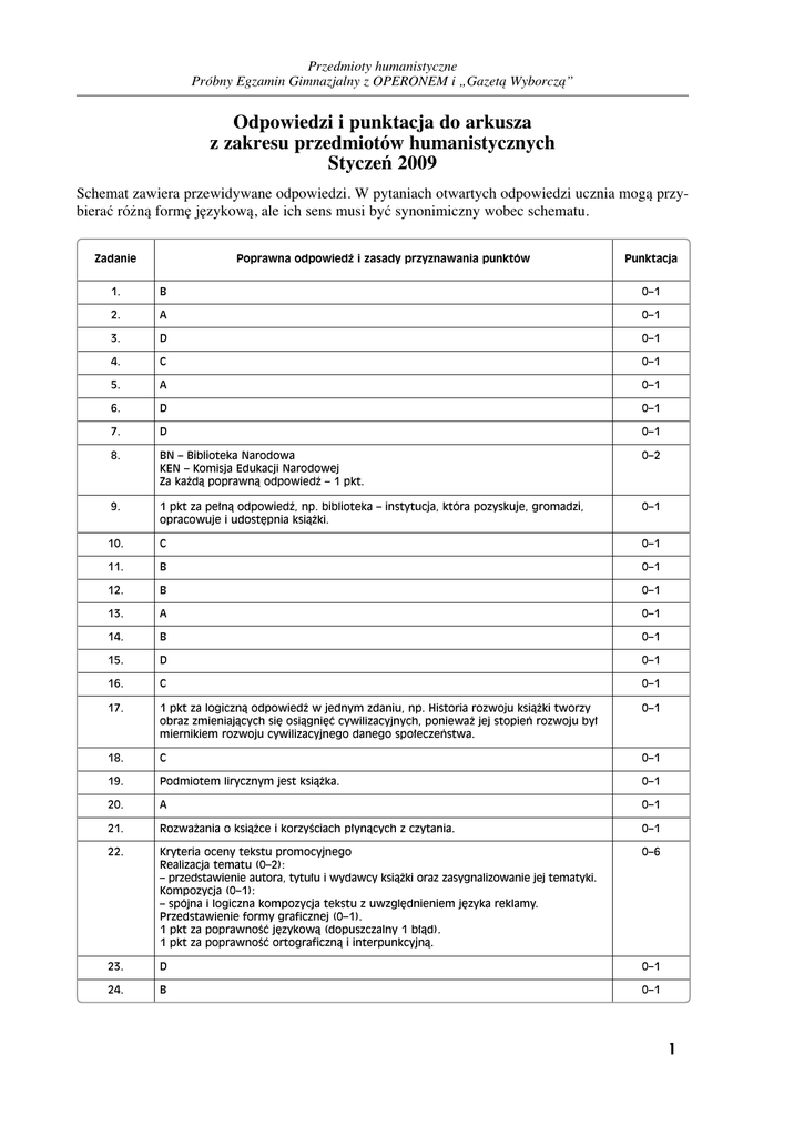 Przedmioty humanistyczne Próbny Egzamin Gimnazjalny z OPERONEM i „Gazetà Wyborczà” Odpowiedzi i punktacja do arkusza z zakresu przedmiotów humanistycznych Styczeƒ 2009 Schemat zawiera przewidywane odpowiedzi. W pytaniach otwartych odpowiedzi ucznia mogà przybieraç ró˝nà form´ j´zykowà, ale ich sens musi byç synonimiczny wobec schematu. Zadanie Poprawna odpowiedê i zasady przyznawania punktów Punktacja 1. B 0–1 2. A 0–1 3. D 0–1 4. C 0–1 5. A 0–1 6. D 0–1 7. D 0–1 8. BN – Biblioteka Narodowa KEN – Komisja Edukacji Narodowej Za ka˝dà poprawnà odpowiedê – 1 pkt. 0–2 9. 1 pkt za pe∏nà odpowiedê, np. biblioteka – instytucja, która pozyskuje, gromadzi, opracowuje i udost´pnia ksià˝ki. 0–1 10. C 0–1 11. B 0–1 12. B 0–1 13. A 0–1 14. B 0–1 15. D 0–1 16. C 0–1 17. 1 pkt za logicznà odpowiedê w jednym zdaniu, np. Historia rozwoju ksià˝ki tworzy obraz zmieniajàcych si´ osiàgni´ç cywilizacyjnych, poniewa˝ jej stopieƒ rozwoju by∏ miernikiem rozwoju cywilizacyjnego danego spo∏eczeƒstwa. 0–1 18. C 0–1 19. Podmiotem lirycznym jest ksià˝ka. 0–1 20. A 0–1 21. Rozwa˝ania o ksià˝ce i korzyÊciach p∏ynàcych z czytania. 0–1 22. Kryteria oceny tekstu promocyjnego Realizacja tematu (0–2): – przedstawienie autora, tytu∏u i wydawcy ksià˝ki oraz zasygnalizowanie jej tematyki. Kompozycja (0–1): – spójna i logiczna kompozycja tekstu z uwzgl´dnieniem j´zyka reklamy. Przedstawienie formy graficznej (0–1). 1 pkt za poprawnoÊç j´zykowà (dopuszczalny 1 b∏àd). 1 pkt za poprawnoÊç ortograficznà i interpunkcyjnà. 0–6 23. D 0–1 24. B 0–1 1 Przedmioty humanistyczne Próbny Egzamin Gimnazjalny z OPERONEM i „Gazetà Wyborczà” Zadanie Poprawna odpowiedê i zasady przyznawania punktów 25. A 0–1 26. U˝yty w tekÊcie IV termin demokracja odnosi si´ do formy ˝ycia spo∏ecznego, w której wszyscy uczestniczà w podejmowaniu decyzji, podporzàdkowujà si´ woli wi´kszoÊci i szanujà prawa i wolnoÊci innych. Jeden z powy˝szych cz∏onów uzasadnienia konieczny dla uzyskania 1 pkt. 0–1 27. 1 punkt za pe∏nà odpowiedê, czyli za podanie nazwy akcji – Ca∏a Polska Czyta Dzieciom – oraz wskazanie celu – promocja czytelnictwa. 0–1 28. C 0–1 1. TEMAT 29. 0–6 29.1.1. OkreÊlenie miejsca i czasu zdarzeƒ, wskazanie bohaterów. 0–1 29.1.2. Wprowadzenie bohaterów ze Êwiata ludzi i bogów (herosów), ukazanie zjawisk fantastycznych. 0–1 29.1.3. Zaprezentowanie historii powstania ksià˝ki (najlepiej do etapu ksià˝ki papierowej) jako mitu nale˝àcego do pewnej wspólnoty ludzi. 0–1 29.1.4. OryginalnoÊç opowieÊci, bogactwo akcji i fabu∏y. 0–1 29.1.5. Uchwycenie elementów wyjaÊniania i pouczania. 0–1 29.1.6. PonadczasowoÊç i uniwersalizm opowieÊci. 0–1 2. KOMPOZYCJA* 0–3 29.2.1. TrójdzielnoÊç kompozycji (treÊciowa i graficzna: segmentacja tekstu – stosowanie np. akapitów, interlinii, bloku; wyodr´bnienie zasadniczych cz´Êci pracy: wst´pu, rozwini´cia, zakoƒczenia). 0–1 29.2.2. SpójnoÊç tekstu. 0–1 29.2.3. Logiczne uporzàdkowanie tekstu. 0–1 3. J¢ZYK I STYL* 0–4 29.3.1. PoprawnoÊç j´zykowa (dopuszczalne trzy b∏´dy). 0–3 b∏´dy – 3 pkt 4 b∏´dy – 2 pkt 5 b∏´dów – 1 pkt 6 b∏´dów – 0 pkt 0–3 29.3.2. FunkcjonalnoÊç stylu. 0–1 4. ZAPIS* 0–3 29.4.1. PoprawnoÊç ortograficzna. 0 b∏´dów – 2 pkt 1 b∏àd – 1 pkt 2 b∏´dy – 0 pkt 0–2 29.4.2. PoprawnoÊç interpunkcyjna – dopuszczalne 3 b∏´dy. 0–1 *Punktów z tych kategorii nie przyznaje si´, jeÊli praca jest krótsza ni˝ po∏owa wyznaczonego miejsca. 2 Punktacja