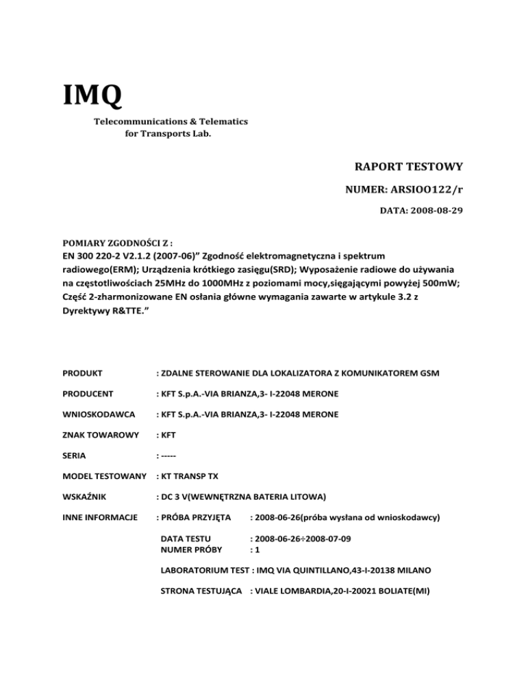 IMQ Telecommunications & Telematics for Transports Lab. RAPORT TESTOWY NUMER: ARSIOO122/r DATA: 2008-08-29 POMIARY ZGODNOŚCI Z : EN 300 220-2 V2.1.2 (2007-06)” Zgodnośd elektromagnetyczna i spektrum radiowego(ERM); Urządzenia krótkiego zasięgu(SRD); Wyposażenie radiowe do używania na częstotliwościach 25MHz do 1000MHz z poziomami mocy,sięgającymi powyżej 500mW; Częśd 2-zharmonizowane EN osłania główne wymagania zawarte w artykule 3.2 z Dyrektywy R&TTE.” PRODUKT : ZDALNE STEROWANIE DLA LOKALIZATORA Z KOMUNIKATOREM GSM PRODUCENT : KFT S.p.A.-VIA BRIANZA,3- I-22048 MERONE WNIOSKODAWCA : KFT S.p.A.-VIA BRIANZA,3- I-22048 MERONE ZNAK TOWAROWY : KFT SERIA : ----- MODEL TESTOWANY : KT TRANSP TX WSKAŹNIK : DC 3 V(WEWNĘTRZNA BATERIA LITOWA) INNE INFORMACJE : PRÓBA PRZYJĘTA DATA TESTU NUMER PRÓBY : 2008-06-26(próba wysłana od wnioskodawcy) : 2008-06-26÷2008-07-09 :1 LABORATORIUM TEST : IMQ VIA QUINTILLANO,43-I-20138 MILANO STRONA TESTUJĄCA : VIALE LOMBARDIA,20-I-20021 BOLIATE(MI) SPIS TREŚCI 1 SPECYFIKACJA TESTOWA, METODY I PROCEDURY 3 1.1 DEFINICJE, SYMBOLE, SKRÓTY 3 1.1.1 DEFINICJE 3 1.1.2 SYMBOLE 5 1.1.3 SKRÓTY 5 1.2 KLASYFIKACJA TESTOWANEGO SPRZĘTU 6 1.2.1 KLASA ODBIORNIKA 6 1.2.2 KLASA ZASILANIA 6 1.2.3 KLASA CYKLU PRACY 6 1.3 PRÓBNE PAKIETY RADIOWE 7 1.4 WARUNKI ŚRODOWISKA 7 1.5 WARUNKI TESTOWE 8 1.5.1 NORMALNE WARUNKI TESTU 8 1.5.2 EKSTREMALNE WARUNKI TESTU 8 2 PODSUMOWANIE WYNIKÓW TESTU 9 3 SZCZEGÓŁY TESTOWANEGO WYPOSAŻENIA 10 3.1 IDENTYFIKACJA TESTOWANEGO SPRZĘTU 10 3.2 DANE TECHNICZNE TESTOWANEGO SPRZĘTU 10 3.3 MODELE I WARIANTY 10 4 DANE TESTOWANYCH PAKIETÓW RADIOWYCH 11 5 DODATKOWE INFORMACJE TECHNICZNE 14 5.1 DANE KOMPONENTY ELEKROMAGNETYCZNE 14 5.2 STŁUMIENIE INTERFERENCJI CZĘSTOTLIWOŚCI RADIOWEJ URZĄDZENIA 14 5.3 OCHRONA INTERFERENCJI ELEKTROMAGNETYCZNEJ URZĄDZENIA 14 6 DOKUMENTACJA TECHNICZNA 14 7 DOKUMENTACJA FOTOGRAFICZNA 15 7.1 IDENTYFIKACJA WYPOSAŻENIA 15 8 TEST OPRZYRZĄDOWANIA 16 1 SPECYFIKACJA TESTOWA, METODY I PROCEDURY Zgodnie z : EN 300 220-2 V2.1.2 (2007-06): ” Zgodnośd elektromagnetyczna i spektrum radiowego(ERM); Urządzenia krótkiego zasięgu(SRD); Wyposażenie radiowe do używania na częstotliwościach 25MHz do 1000MHz z poziomami mocy,sięgającymi powyżej 500mW; Częśd 2-zharmonizowane EN osłania główne wymagania zawarte w artykule 3.2 z Dyrektywy R&TTE.” Standardowe EN 300 220-2 V2.1.2 (2007-06) tworzy referencje do EN 300 220-1 V2.1.1 (2006-04) „Zgodnośd elektromagnetyczna i spektrum radiowego(ERM); Urządzenia krótkiego zasięgu(SRD); Wyposażenie radiowe do używania na częstotliwościach 25MHz do 1000MHz z poziomami mocy,sięgającymi powyżej 500mW; Częśd 1: charakterystyka techniczna i metody testowe”. 1.1 DEFINICJE, SYMBOLE I SKRÓTY 1.1.1 DEFINICJE Do celów raportu testowego są stosowane następujące terminy i definicje : INTELIGENTNA ZMIENNOŚD CZĘSTOTLIWOŚCI(AFA)-zdolnośd urządzenia do dynamicznej zmiany kanału z dostępnymi częstotliwościami do działania GWARANTOWANY ZAKRES CZĘSTOTLIWOŚCI-wewnętrzny zakres częstotliwości, w którym urządzenie upoważnione jest działad PROWADZONE POMIARY-pomiary są dokonywane przy użyciu bezpośredniego podłączenia 50Ω do testowanego sprzętu ANTENA DEDYKOWANA-dołączona usuwalna antena, testowana ze sprzętem radiowym, zaprojektowana jako niezbędny element wyposażenia STAŁA STACJA-wyposażenie przeznaczone do użytku w niezmiennej lokalizacji ZMIENNOŚD CZĘSTOTLIWOŚCI-umiejętnośd określania nie zajętych pod-zakresów lub kanałów działania , służąca zminimalizowaniu interferencji z innymi użytkownikami tego samego zakresu INTEGRALNA ANTENA-całkowicie stabilna antena, która może byd wbudowana, zaprojektowana jako niezbędny element wyposażenia TRYB NASŁUCHU-działanie polega na nasłuchiwaniu w celu wykrycia nie zajętych pod-zakresów lub wcześniejszych kanałów nadawania SŁUCHANIE PRZED MÓWIENIEM-kombinacja trybu nasłuchu następującego przed trybem rozmowy MOBILNA STACJA-urządzenie zamocowane w pojeździe WĄSKIE PASMO-sprzęt używany w ciągłych, nieskanalizowanych zakresach częstotliwości równych lub mniejszych niż 200kHz albo wykorzystywany w skanalizowanym paśmie częstotliwości z oddzielonym kanałem równym lub mniejszym niż 200kHz NIE ZACHODZĄCE KANAŁY-przeskakujące pozycje oddzielone przez przepustowośd kanału z 90% lub więcej poniżej maksimum Moc jako wymiar z analizatorem spektrum PRZENOŚNA STACJA-sprzęt przeznaczony do przenoszenia, załączania lub wszczepiania POMIARY PROMIENIOWANE-pomiary, które dotyczą całkowitego pomiaru z pola promieniowanego TRYB ROZMOWY-transmisja celowego promieniowania z nadajnika TRANSPONDER- urządzenie, odpowiedzialne za „przesłuchiwanie” sygnału TELEKOMENDA- użycie komunikacji radiowej dla transmisji sygnałów rozpoczęcia, zmiany lub zakooczenia funkcji urządzenia z dystansu, z odległości SZEROKIE PASMO- sprzęt używany w ciągłych, nieskanalizowanych zakresach częstotliwości przykrytych większych niż 200kHz albo wykorzystywany w skanalizowanym paśmie częstotliwości z oddzielonym kanałem większym niż 200kHz 1.1.2 SYMBOLE Do celów raportu testowego są stosowane następujące terminy i definicje : AR0, AR1, etc. dB E FRC FRH FRL FT NaCl S tL tF tPS λ kategorie zakresu wyrównywania decybele siła pola elektrycznego centrum zakresu częstotliwości górna granica zakresu częstotliwości dolna granica zakresu częstotliwości pełny test(punkt 3.1) chlorek sodu wrażliwośd odbiornika czas całkowitego nasłuchu stałe części czasu nasłuchu przypadkowe części czasu nasłuchu długośd fali 1.1.3 SKRÓTY Do celów raportu testowego są stosowane następujące terminy i definicje : ac/AC AFA BW CH dc/DC DSSS EMC Emf e.r.p. EUT FHSS IF LBT OFR RBW RF RX SINAD SND/ND SR SRD SWT TX VBW VSWR prąd zmienny inteligentna zmiennośd częstotliwości szerokośd pasma częstotliwości, przepustowośd kanał prąd stały 