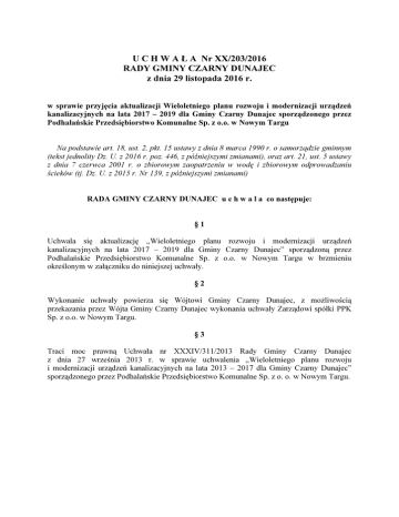 U C H W A Ł A Nr XX/203/2016 RADY GMINY CZARNY DUNAJEC z dnia 29 listopada 2016 r. w sprawie przyjęcia aktualizacji Wieloletniego planu rozwoju i modernizacji urządzeń kanalizacyjnych na lata 2017 – 2019 dla Gminy Czarny Dunajec sporządzonego przez Podhalańskie Przedsiębiorstwo Komunalne Sp. z o.o. w Nowym Targu Na podstawie art. 18, ust. 2, pkt. 15 ustawy z dnia 8 marca 1990 r. o samorządzie gminnym (tekst jednolity Dz. U. z 2016 r. poz. 446, z późniejszymi zmianami), oraz art. 21, ust. 5 ustawy z dnia 7 czerwca 2001 r. o zbiorowym zaopatrzeniu w wodę i zbiorowym odprowadzaniu ścieków (tj. Dz. U. z 2015 r. Nr 139, z późniejszymi zmianami) RADA GMINY CZARNY DUNAJEC u c h w a l a co następuje: §1 Uchwala się aktualizację „Wieloletniego planu rozwoju i modernizacji urządzeń kanalizacyjnych na lata 2017 – 2019 dla Gminy Czarny Dunajec” sporządzoną przez Podhalańskie Przedsiębiorstwo Komunalne Sp. z o.o. w Nowym Targu w brzmieniu określonym w załączniku do niniejszej uchwały. §2 Wykonanie uchwały powierza się Wójtowi Gminy Czarny Dunajec, z możliwością przekazania przez Wójta Gminy Czarny Dunajec wykonania uchwały Zarządowi spółki PPK Sp. z o.o. w Nowym Targu. §3 Traci moc prawną Uchwała nr XXXIV/311/2013 Rady Gminy Czarny Dunajec z dnia 27 września 2013 r. w sprawie uchwalenia „Wieloletniego planu rozwoju i modernizacji urządzeń kanalizacyjnych na lata 2013 – 2017 dla Gminy Czarny Dunajec” sporządzonego przez Podhalańskie Przedsiębiorstwo Komunalne Sp. z o. o. w Nowym Targu. WIELOLETNI PLAN ROZWOJU I MODERNIZACJI URZĄDZEŃ KANALIZACYJNYCH NA LATA 2017-2019 dla Gminy Czarny Dunajec sporządzony przez: Podhalańskie Przedsiębiorstwo Komunalne Spółka z o.o. w Nowym Targu Nowy Targ, wrzesień 2016 1 Zakres usług Podhalańskie Przedsiębiorstwo Komunalne Sp. z o.o. z siedzibą w Nowym Targu, wpisana do Rejestru przedsiębiorców Krajowego Rejestru Sądowego pod numerem 0000172849, prowadzi statutową działalność na obszarze dziesięciu gmin powiatów nowotarskiego i tatrzańskiego od dnia 1 stycznia 2005 roku w oparciu o ustawę z dnia 7 czerwca 2001r. o zbiorowym zaopatrzeniu w wodę i zbiorowym odprowadzaniu ścieków (Dz.U. z 2015r. poz. 139). Spółka uzyskała wymagane ustawą (art. 16 pkt. 1) zezwolenie Wójta Gminy Czarny Dunajec w formie decyzji nr GK 7620-1/2004 z dnia 16.12.2004r. na prowadzenie działalności w przedmiotowym zakresie na jej obszarze na czas nieokreślony począwszy od dnia 01.01.2005 r. Bieżąca działalność Spółki polega na świadczeniu stałego odbioru ścieków i ich oczyszczaniu na obszarze gmin – udziałowców zgodnie z warunkami określonymi w pozwoleniach wodno-prawnych eksploatacji oczyszczalni ścieków stanowiących własność przedsiębiorstwa. Na terenie Gminy Czarny Dunajec Spółka realizuje usługi zbiorowego odprowadzania ścieków przesyłając ścieki rurociągami grawitacyjnymi do oczyszczalni zlokalizowanej w Czarnym Dunajcu. Ponadto Spółka świadczy usługi na rzecz ludności i podmiotów gospodarczych w zakresie: − budowy sieci kanalizacyjnych i niektórych przyłączy, − wywozu nieczystości płynnych, − przyjmowania w oczyszczalni (stacji zlewczej) ścieków dowożonych, − usług kontroli, czyszczenia i konserwacji (drobnych napraw) przyłączy i sieci kanalizacyjnych nie będących własnością Spółki. Eksploatując posiadany majątek Spółka utrzymuje sieci i oczyszczalnie ścieków w stanie zapewniającym ciągłość ich prawidłowego funkcjonowania. Prace nad poprawą funkcjonowania posiadanej infrastruktury realizowane są tak pilnie, jak pozwalają na to możliwości operacyjne i inwestycyjne spółki w szczególności poziom środków finansowych, wypracowanych w wyniku prowadzonej działalności. 2 Przedsięwzięcia rozwojowo-modernizacyjne. W okresie obowiązywania Wieloletniego planu rozwoju i modernizacji urządzeń kanalizacyjnych zwanym dalej „Planem”, nie przewiduje się zmian rodzajowych w zakresie świadczonych usług zbiorowego odprowadzania ścieków. Niniejszy Plan został opracowany na podstawie art. 21 ust. 1 – 3 ustawy i obejmuje okres trzech najbliższych lat tj. od 2017 do 2019 roku. Celem Planu jest osiągnięcie standardów wyznaczonych przez stosowne dyrektywy UE oraz spełnienie krajowych wymogów w zakresie gospodarki wodno-ściekowej. W planie uwzględniono inwestycje stanowiące część zgłaszanych przez gminy, udziałowców spółki, potrzeb w zakresie rozbudowy sieci kanalizacji sanitarnej na swoim obszarze. Wybór inwestycji oparty został na kryteriach ekonomiczno-technicznych i społecznych oraz został skonsultowany z pracownikami samorządów. Plan ma charakter otwarty i może być sukcesywnie uzupełniany i korygowany. Dotyczy to zwłaszcza zmian rzeczowych, wielkości planowanych nakładów finansowych i czasu planowanych przedsięwzięć oraz kierunków pozyskiwania środków na ich realizację, których wcześniej nie można było przewidzieć. Na podstawie Planu będą opracowywane roczne plany inwestycyjne Spółki, które uwzględniać będą w/w korekty. Łączna planowana wartość nakładów inwestycyjnych na urządzenia kanalizacyjne na lata 2017-2019 w całej Spółce wynosi 38 220 000,00 zł. Kwota ta obejmuje inwestycje na terenie wszystkich gmin – wspólników spółki oraz inwestycje nieprzypisane do poszczególnych gmin, stanowiące ogólne inwestycje Podhalańskiego Przedsiębiorstwa Komunalnego służące wszystkim wspólnikom w kwocie 390 000 zł. Przewiduje się, że w okresie objętym planem, część środków zostanie także wydatkowana w celu zakupu sprzętu specjalistycznego, niezbędnego w Spółce w procesie prowadzonej działalności operacyjnej. Konstrukcja i opis planu zawiera ogólne informacje dotyczące proponowanych inwestycji w poszczególnych gminach i sołectwach. Szczegóły lokalizacyjne (ulice, szczegółowe zakresy) będą podawane w rocznych planach inwestycyjny