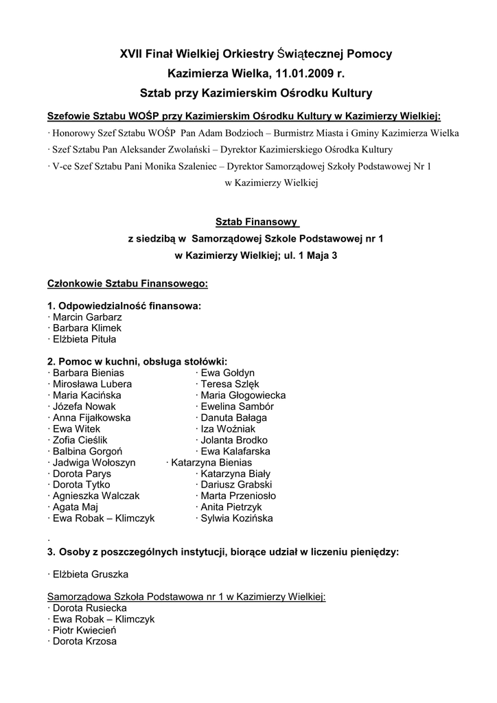 XVII Finał Wielkiej Orkiestry Świątecznej Pomocy Kazimierza Wielka, 11.01.2009 r. Sztab przy Kazimierskim Ośrodku Kultury Szefowie Sztabu WOŚP przy Kazimierskim Ośrodku Kultury w Kazimierzy Wielkiej: · Honorowy Szef Sztabu WOŚP Pan Adam Bodzioch – Burmistrz Miasta i Gminy Kazimierza Wielka · Szef Sztabu Pan Aleksander Zwolański – Dyrektor Kazimierskiego Ośrodka Kultury · V-ce Szef Sztabu Pani Monika Szaleniec – Dyrektor Samorządowej Szkoły Podstawowej Nr 1 w Kazimierzy Wielkiej Sztab Finansowy z siedzibą w Samorządowej Szkole Podstawowej nr 1 w Kazimierzy Wielkiej; ul. 1 Maja 3 Członkowie Sztabu Finansowego: 1. Odpowiedzialność finansowa: · Marcin Garbarz · Barbara Klimek · ElŜbieta Pituła 2. Pomoc w kuchni, obsługa stołówki: · Barbara Bienias · Ewa Gołdyn · Mirosława Lubera · Teresa Szlęk · Maria Kacińska · Maria Głogowiecka · Józefa Nowak · Ewelina Sambór · Anna Fijałkowska · Danuta Bałaga · Ewa Witek · Iza Woźniak · Zofia Cieślik · Jolanta Brodko · Balbina Gorgoń · Ewa Kalafarska · Jadwiga Wołoszyn · Katarzyna Bienias · Dorota Parys · Katarzyna Biały · Dorota Tytko · Dariusz Grabski · Agnieszka Walczak · Marta Przeniosło · Agata Maj · Anita Pietrzyk · Ewa Robak – Klimczyk · Sylwia Kozińska · 3. Osoby z poszczególnych instytucji, biorące udział w liczeniu pieniędzy: · ElŜbieta Gruszka Samorządowa Szkoła Podstawowa nr 1 w Kazimierzy Wielkiej: · Dorota Rusiecka · Ewa Robak – Klimczyk · Piotr Kwiecień · Dorota Krzosa · Dorota Sydoryk · Sylwia Kozińska · Maria MoŜdŜeń · Beata Kuchnecka Samorządowa Szkoła Podstawowa nr 3 w Kazimierzy Wielkiej: · Ilona Franasik · Jolanta Rogala · RóŜa Chat · Monika Olejarska · Beata Marzec · Anna Kozioł · Anna Bijak · Krzysztof Kuchnecki Samorządowa Szkoła Podstawowa w Cudzynowicach: · Maria Tracz · Katarzyna Bienias · Ewelina Adamska · Jadwiga Szczygieł · Jolanta Jędraska Samorządowa Szkoła Podstawowa w Zięblicach: · Dorota Noszczyk Samorządowa Szkoła Podstawowa w Gorzkowie: · Mirosława Szczerba · Grzegorz Klimczyk Publiczne Gimnazjum Samorządowe w Kazimierzy Wielkiej: · Jolanta Michałowska · Wioletta Wójcik · Jacek Koral · Angelika Cichopek · BoŜena Malara · Anna Gącik · Agnieszka Lipka Zespół Szkół Samorządowych w Wielgusie: · Wilhelm Włusek · ElŜbieta Wojtasik · Joanna Chuchmacz · Hanna Kubik Starostwo Powiatowe w Kazimierzy Wielkiej: · Izabela Sroka Urząd Miasta i Gminy w Kazimierzy Wielkiej: · Marcin Garbarz Miejsko – Gminny Ośrodek Pomocy Społecznej w Kazimierzy Wielkiej: · ElŜbieta Patro · Beata Adamusik · Urszula Sadowska · GraŜyna Tomczak Zespół Obsługi Ekonomiczno – Administracyjnej Szkół w Kazimierzy Wielkiej: · ElŜbieta Pituła · Aneta Sierakowska Sztab Artystyczny z siedzibą w Kazimierskim Ośrodku Kultury ul. 1 Maja 16 4. Członkowie Sztabu Artystycznego: · Alicja Czajka · Ewa Wojciechowska · Dorota Jaros-Pilarska · Ireneusz Górski · Andrzej Wojtasik