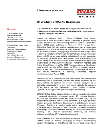 Informacja prasowa 50. urodziny STRABAG Real Estate Kontakt STRABAG Real Estate Mariusz Skowronek Tel. +48 22 8333502 Kom. +48 698 612 866 [email protected] STRABAG Real Estate GmbH Timo Haep Press and Public Relations Siegburger Str. 229c 50679 Köln Tel. +49 221 824-2137 [email protected] www.strabag-real-estate.com STRABAG Real Estate został założony w Kolonii w 1965 r. Od momentu powstania firma zrealizowała 450 projektów na łączną kwotę ok. 6 mld euro Kolonia, 24 czerwca 2015 r. Firma STRABAG Real Estate, wchodząca w skład koncernu STRABAG, obchodzi w tym roku swoje 50-lecie działalności na rynku deweloperskim. STRABAG Real Estate GmbH (SRE) został założony w Kolonii w 1965 r. przez firmę STRABAG BAU AG jako spółka, specjalizująca się w działaniach deweloperskich koncernu. Obecnie SRE stanowi część STRABAG SE z siedzibą w Austrii, europejskiego koncernu budowlanego, lidera w zakresie wdrażania innowacyjnych technologii z silnym kapitałem własnym. SRE ma za sobą wiele lat doświadczeń pełnych sukcesów: od momentu założenia firmy zrealizowano około 450 inwestycji na łączną kwotę około 6 miliardów euro, w tym wielokrotnie nagradzane projekty takie jak MILANEO w Stuttgarcie, wyróżniony nagrodą Best Futura Mega Project na MIPIM 2013, Tańczące Wieże w Hamburgu, który zdobył nagrody MIPIM Award w 2014, immobilienmanager Award, FIABCI Prix d’Excellence Germany i World Prix d’Excellence, oraz Forum Mittelrhein w Koblencji, zdobywca nagrody immobilienmanager Award 2013. „Jesteśmy jedną z najstarszych firm zajmujących się inwestycjami deweloperskimi w Niemczech, niewiele firm może pochwalić się tak długą historią. To sprawia, że jeszcze bardziej cieszymy się z obchodów naszej rocznicy w tym roku. Mamy nadzieję, że następne 50 lat będzie tak samo pomyślne” - mówi Thomas Hohwieler, Dyrektor Zarządzający SRE, podsumowując historię firmy. STRABAG Real Estate posiada silną pozycję na rynku nieruchomości i rozpoczął ekspansję na polskim rynku. 10. piętrowy budynek ASTORII jest pierwszym projektem Spółki w Polsce. Jego łączna powierzchnia użytkowa wynosi około 28.000 m². Inwestycja powstaje między głównymi dzielnicami biznesowymi a zabytkowym centrum Warszawy. Położona w pobliżu stacja metra zapewnia optymalne połączenia komunikacyjne z wykorzystaniem środków transportu publicznego. ASTORIA oferować będzie ok. 16.800 m² powierzchni biurowej i ok. 1.400 m² powierzchni handlowej, jak również podziemny parking z 87 miejscami parkingowymi. Poza projektem ASTORIA firma realizuje obecnie również budynek UPPER WEST w Berlinie, inwestycję w miejscu wcześniejszej siedziby Rundschau we Frankfurcie nad Menem oraz projekt IQ w 1 Hamburgu. Firma działa w najważniejszych centrach gospodarczych w Niemczech, Austrii i Szwecji, a obecnie poszerza obszar działania o Polskę, zapewniając kompleksowe usługi począwszy od opracowywania koncepcji, poprzez planowanie, realizację i zarządzenie projektem. STRABAG Real Estate GmbH STRABAG Real Estate GmbH (SRE) należy do wiodących spółek zajmujących się realizacją projektów deweloperskich w Niemczechi Europie. Jest częścią STRABAG SE, europejskiego koncernu technologicznego z branży budowlanej, lidera w zakresie wdrażania innowacyjnych technologii o silnej pozycji finansowej. Główna siedziba SRE mieści się w Kolonii, ale spółka posiada również liczne biura w najważniejszych pod względem gospodarczym miejscowościach w Niemczech, Austrii i Szwecji. Firma oferuje pełen zakres usług: od opracowywania koncepcji, poprzez planowanie, realizację i zarządzenie projektem. Kluczowym obszarem działalności firmy jest realizacja projektów deweloperskich, wielkopowierzchniowych obiektów handlowych i organizacja modelu partnerstwa publiczno-prywatnego. Do dnia dzisiejszego firma zrealizowała projekty na łączną kwotę przekraczającą 6 miliardów euro. Poza budynkami UPPER WEST w Berlinie i ASTORIA w Warszawie, Rundschau-Area we Frankfurcie na Menem i IQ w Hamburgu stanowią największe inwestycje spółki. ASTORIA Premium Offices, Warszawa Intelligent Quarters, Hamburg UPPER WEST, Berlin Rundschau Areal, Frankfurt 2