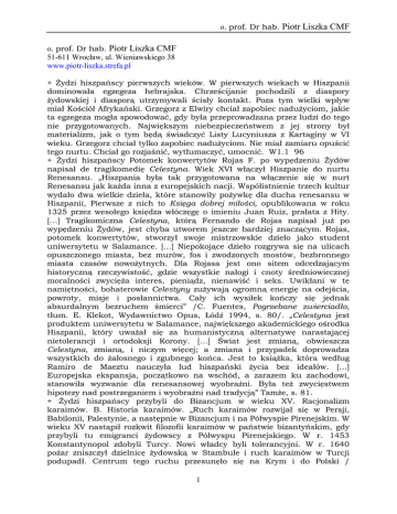 o. prof. Dr hab. Piotr Liszka CMF o. prof. Dr hab. Piotr Liszka CMF 51-611 Wrocław, ul. Wieniawskiego 38 www.piotr-liszka.strefa.pl + Żydzi hiszpańscy pierwszych wieków. W pierwszych wiekach w Hiszpanii dominowała egzegeza hebrajska. Chrześcijanie pochodzili z diaspory żydowskiej i diasporą utrzymywali ścisły kontakt. Poza tym wielki wpływ miał Kościół Afrykański. Grzegorz z Elwiry chciał zapobiec nadużyciom, jakie ta egzegeza mogła spowodować, gdy była przeprowadzana przez ludzi do tego nie przygotowanych. Największym niebezpieczeństwem z jej strony był materializm, jak o tym będą świadczyć Listy Lucyniusza z Kartaginy w VI wieku. Grzegorz chciał tylko zapobiec nadużyciom. Nie miał zamiaru opuścić tego nurtu. Chciał go rozjaśnić, wytłumaczyć, umocnić. W1.1 96 + Żydzi hiszpańscy Potomek konwertytów Rojas F. po wypędzeniu Żydów napisał de tragikomedię Celestyna. Wiek XVI włączył Hiszpanię do nurtu Renesansu. „Hiszpania była tak przygotowana na włączenie się w nurt Renesansu jak każda inna z europejskich nacji. Współistnienie trzech kultur wydało dwa wielkie dzieła, które stanowiły pożywkę dla ducha renesansu w Hiszpanii, Pierwsze z nich to Księga dobrej miłości, opublikowana w roku 1325 przez wesołego księdza włóczęgę o imieniu Juan Ruiz, prałata z Hity. […] Tragikomiczna Celestyna, którą Fernando de Rojas napisał już po wypędzeniu Żydów, jest chyba utworem jeszcze bardziej znaczącym. Rojas, potomek konwertytów, stworzył swoje mistrzowskie dzieło jako student uniwersytetu w Salamance. […] Niepokojące dzieło rozgrywa się na ulicach opuszczonego miasta, bez murów, fos i zwodzonych mostów, bezbronnego miasta czasów nowożytnych. Dla Rojasa jest ono sitem odcedzającym historyczną rzeczywistość, gdzie wszystkie nałogi i cnoty średniowiecznej moralności zwycięża interes, pieniądz, nienawiść i seks. Uwikłani w te namiętności, bohaterowie Celestyny zużywają ogromną energię na odejścia, powroty, misje i posłannictwa. Cały ich wysiłek kończy się jednak absurdalnym bezruchem śmierci” /C. Fuentes, Pogrzebane zwierciadło, tłum. E. Klekot, Wydawnictwo Opus, Łódź 1994, s. 80/. „Celestyna jest produktem uniwersytetu w Salamance, największego akademickiego ośrodka Hiszpanii, który uważał się za humanistyczną alternatywę narastającej nietolerancji i ortodoksji Korony. […] Świat jest zmianą, obwieszcza Celestyna, zmianą, i niczym więcej; a zmiana i przypadek doprowadza wszystkich do żałosnego i zgubnego końca. Jest to książka, która według Ramiro de Maeztu nauczyła lud hiszpański życia bez ideałów. […] Europejska ekspansja, początkowo na wschód, a zarazem ku zachodowi, stanowiła wyzwanie dla renesansowej wyobraźni. Była też zwycięstwem hipotezy nad postrzeganiem i wyobraźni nad tradycją” Tamże, s. 81. + Żydzi hiszpańscy przybyli do Bizancjum w wieku XV. Racjonalizm karaimów. B. Historia karaimów. „Ruch karaimów rozwijał się w Persji, Babilonii, Palestynie, a następnie w Bizancjum i na Półwyspie Pirenejskim. W wieku XV nastąpił rozkwit filozofii karaimów w państwie bizantyńskim, gdy przybyli tu emigranci żydowscy z Półwyspu Pirenejskiego. W r. 1453 Konstantynopol zdobyli Turcy. Nowi władcy byli tolerancyjni. W r. 1640 pożar zniszczył dzielnicę żydowską w Stambule i ruch karaimów w Turcji podupadł. Centrum tego ruchu przesunęło się na Krym i do Polski / 1 o. prof. Dr hab. Piotr Liszka CMF Głównymi ośrodkami karaimów były w następnych wiekach: Hit nad Eufratem, Kair, Jerozolima, Konstantynopol, Krym oraz Polska (Troki)/. C. Przedstawiciele / Poglądy teologiczne i filozoficzne karaimów rozwijały się stopniowo i niesystematycznie. Świadczy o tym fakt, że Anan ben Dawid (VIII w.) postulował tylko dwie zasady: indywidualizm w interpretacji Biblii oraz ascezy. Rychło odrzucono autorytet rabinów i tradycję rabiniczną. Beniamin ben Mojżesz Nahawendi (IX w.) ustanowił podwaliny karaimskiej hermeneutyki biblijnej i głosił koncepcję „stworzenia przez pośrednika” /napisał Księgę praw oraz Księgę przykazań; głosił poglądy w wielu sprawach zbieżne z poglądami Filona z Aleksandrii, wiadomo jednak, że nie czerpał z Filona/. Jafet ben Ali Halewi z Basry napisał racjonalistyczny komentarz do Księgi Rodzaju /ponadto przetłumaczył Torę na język arabski i był autorem Księgi przykazań/, a Jakub al-Kirkisani (X w.) opracował podwaliny karaimskiej hermeneutyki biblijnej /zwany również Jakub Chasdaj ben Izaak, napisał dzieło Księga świateł i wież zegarowych, uważane za kodeks prawa karaimów. Mowa w niej o potrzebie korzystania z rozumu w sprawach religii oraz uznania rozumu jako kryterium religii; zawiera również bogaty materiał na temat różnych religii i sekt. Ponadto al-Kirkisani napisał Księgę ogrodów i parków, Księgę o jedności Boga oraz komentarze do Księgi Rodzaju, do Księgi Hioba i do Eklezjastesa/” /J. Ochman, Średniowieczna filozofia żydowska, (Historia filozofii żydowskiej, t. 2), Universitas, Kraków 1995, s. 32/ (informacje w nawiasach z przypisów na s. 333 i 334). + Żydzi hiszpańscy średniowieczni Awicebron wpłynął na scholastykę chrześcijańską. Źródło filozofii muzułmańskiej w Hiszpanii to Abenmasarra i jego szkoła, nurt zwany masarríes, system heretycki wewnątrz islamu, neoplatoński, mistyczny, panteistyczny. Tendencje te zawsze tkwiły w duszy hiszpańskiej. Poprzez żydowskiego filozofa – Awicebron i muzułmańskiego Abenarabi, nurt ten stał się znany w scholastyce chrześcijańskiej. Do dzisiaj tkwi w spekulacjach teozoficznych sufíes i heterodoksyjnych mistyków islamskich, od Afryki aż po Indie. Menendéz y Pelayo umieścił na linii myśli panteistycznej gnozy Pryscyliana, chrześcijańskiego myśliciela IV wieku /Miguel Asín Palacios, Abenmasarra y su escuela. Origenes de la filosofia hispano-musulmana, Imp