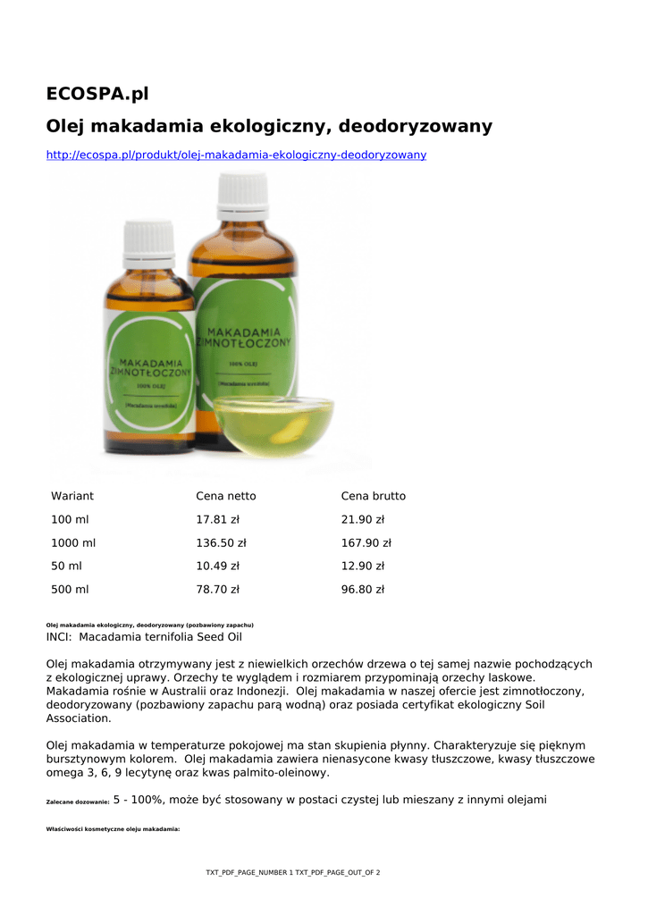 ECOSPA.pl Olej makadamia ekologiczny, deodoryzowany http://ecospa.pl/produkt/olej-makadamia-ekologiczny-deodoryzowany Wariant Cena netto Cena brutto 100 ml 17.81 zł 21.90 zł 1000 ml 136.50 zł 167.90 zł 50 ml 10.49 zł 12.90 zł 500 ml 78.70 zł 96.80 zł Olej makadamia ekologiczny, deodoryzowany (pozbawiony zapachu) INCI: Macadamia ternifolia Seed Oil Olej makadamia otrzymywany jest z niewielkich orzechów drzewa o tej samej nazwie pochodzących z ekologicznej uprawy. Orzechy te wyglądem i rozmiarem przypominają orzechy laskowe. Makadamia rośnie w Australii oraz Indonezji. Olej makadamia w naszej ofercie jest zimnotłoczony, deodoryzowany (pozbawiony zapachu parą wodną) oraz posiada certyfikat ekologiczny Soil Association. Olej makadamia w temperaturze pokojowej ma stan skupienia płynny. Charakteryzuje się pięknym bursztynowym kolorem. Olej makadamia zawiera nienasycone kwasy tłuszczowe, kwasy tłuszczowe omega 3, 6, 9 lecytynę oraz kwas palmito-oleinowy. Zalecane dozowanie: 5 - 100%, może być stosowany w postaci czystej lub mieszany z innymi olejami Właściwości kosmetyczne oleju makadamia: TXT_PDF_PAGE_NUMBER 1 TXT_PDF_PAGE_OUT_OF 2 Olej makadamia posiada wyjątkowe właściwości regeneracyjne. Zawarty w nim olej palmito-oleinowy to również składnik ludzkiej skóry. Z tego względu olej makadamia jest doskonale wchłaniany i tolerowany przez skórę. Olej makadamia chroni komórki skóry przed zniszczeniem (działaniem wolnych rodników czyli utlenianiem). Makadamia doskonale nadaje się do pielęgnacji skóry starzejącej się, znajduje również zastosowanie w zwalczaniu cellulitu. Ponadto doskonale zmiękcza i wygładza naskórek, leczy niewielkie uszkodzenia skóry oraz podrażnienia po opalaniu. Zastosowanie: Ojej makadamia jest bezpieczny dla skóry delikatnej i wrażliwej. Polecany również dla skóry dojrzałej. Polecany do kremów, lotionów i olejków antiagingowych, antycellulitowych. Będzie doskonałym emolientem do masażu. TXT_PDF_PAGE_NUMBER 2 TXT_PDF_PAGE_OUT_OF 2