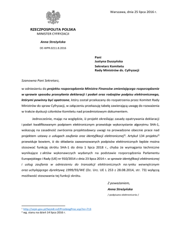 Warszawa, dnia 25 lipca 2016 r. RZECZPOSPOLITA POLSKA MINISTER CYFRYZACJI Anna Streżyńska DE-WPR.0211.8.2016 Pani Justyna Duszyńska Sekretarz Komitetu Rady Ministrów ds. Cyfryzacji Szanowna Pani Sekretarz, w odniesieniu do projektu rozporządzenia Ministra Finansów zmieniającego rozporządzenie w sprawie sposobu przesyłania deklaracji i podań oraz rodzajów podpisu elektronicznego, którymi powinny być opatrzone, który został przekazany do rozpatrzenia przez Komitet Rady Ministrów do spraw Cyfryzacji, w załączeniu przekazuję tabelę zawierającą uwagę do rozważenia w trakcie dyskusji członków Komitetu nad przedmiotowym dokumentem. Jednocześnie, mając na względzie, iż projekt określając zasady opatrywania deklaracji i podań kwalifikowanym podpisem elektronicznym przewiduje wykorzystanie algorytmu SHA-1, wskazuję na zasadność zwrócenia projektodawcy uwagi na prowadzone obecnie prace nad projektem ustawy o usługach zaufania oraz identyfikacji elektronicznej1). Artykuł 134 projektu2) przewiduje bowiem, iż do składania zaawansowanych podpisów elektronicznych będzie można stosować funkcję skrótu SHA-1 do dnia 1 lipca 2018 r., chyba że wymagania techniczne wynikające z aktów wykonawczych wydanych na podstawie rozporządzenia Parlamentu Europejskiego i Rady (UE) nr 910/2014 z dnia 23 lipca 2014 r. w sprawie identyfikacji elektronicznej i usług zaufania w odniesieniu do transakcji elektronicznych na rynku wewnętrznym oraz uchylającego dyrektywę 1999/93/WE (Dz. Urz. UE L 253 z 28.08.2014, str. 73) wyłączą możliwość stosowania tej funkcji skrótu. Z poważaniem, Anna Streżyńska / podpisano elektronicznie / 1 2 http://sejm.gov.pl/Sejm8.nsf/PrzebiegProc.xsp?nr=713 wg. stanu na dzień 14 lipca 2016 r. Nazwa projektu dokumentu: Projekt rozporządzenia Ministra Finansów zmieniającego rozporządzenie w sprawie sposobu przesyłania deklaracji i podań oraz rodzajów podpisu elektronicznego, którymi powinny być opatrzone. L.p. Organ wnoszący uwagi 1. MC Jednostka redakcyjna, do której wnoszone są uwagi § 1 pkt 1 lit. a Treść uwagi Ponownie zgłaszam uwagę zgłoszoną uprzednio pismem z dnia 13 lipca 2016 r. znak DP-WLII.0210.489.2016. W § 1 pkt 1 lit. a projektu projektodawca wprowadza w § 4 ust. 1 pkt 1 rozporządzenia pojęcie kwalifikowanego podpisu elektronicznego, wskazując że chodzi o podpis w rozumieniu art. 3 pkt 12 rozporządzenia Parlamentu Europejskiego i Rady (UE) nr 910/2014 r. z dnia 23 lipca 2014 r. w sprawie identyfikacji elektronicznej i usług zaufania w odniesieniu do transakcji elektronicznych na rynku wewnętrznym oraz uchylającego dyrektywę 1999/93/WE (Dz. Urz. UE L 257 z 28.08.2014, str. 73). Należy wskazać, że rozporządzenia obowiązują w Rzeczpospolitej Polskiej bezpośrednio i w związku z tym, że w rozporządzeniu Parlamentu Europejskiego i Rady wprowadzone jest pojęcie kwalifikowanego podpisu elektronicznego, nie ma potrzeby odsyłania w akcie wykonawczym do tego rozporządzenia. Wystarczające jest posługiwanie się określeniem „kwalifikowany podpis elektroniczny”. Taka terminologia posługuje się procedowana w parlamencie ustaw o usługach zaufania oraz identyfikacji elektronicznej w związku czym należałoby zachować spójność systemową w tym zakresie. Ministerstwo Cyfryzacji ul. Królewska 27, 00-060 Warszawa Propozycja zmian zapisu 1) w § 4: a) w ust. 1 pkt 1 otrzymuje brzmienie: „1) kwalifikowanym podpisem elektronicznym.”