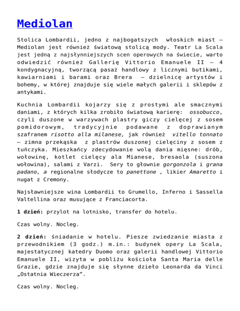 Mediolan Stolica Lombardii, jedno z najbogatszych włoskich miast – Mediolan jest również światową stolicą mody. Teatr La Scala jest jedną z najsłynniejszych scen operowych na świecie, warto odwiedzić również Gallerię Vittorio Emanuele II – 4 kondygnacyjną, tworzącą pasaż handlowy z licznymi butikami, kawiarniami i barami oraz Brera – dzielnicę artystów i bohemy, w której znajduje się wiele małych galerii i sklepów z antykami. Kuchnia Lombardii kojarzy się z prostymi ale smacznymi daniami, z których kilka zrobiło światową karierę: ossobucco, czyli duszone w warzywach plastry giczy cielęcej z sosem pomidorowym, tradycyjnie podawane z doprawianym szafranem risotto alla milanese, jak również vitello tonnato – zimna przekąska z plastrów duszonej cielęciny z sosem z tuńczyka. Mieszkańcy zdecydowanie wolą dania mięsne: drób, wołowinę, kotlet cielęcy ala Mianese, bresaola (suszona wołowina), salami z Varzi. Sery to głownie gorgonzola i grana padano, a regionalne słodycze to panettone , likier Amaretto i nugat z Cremony. Najsławniejsze wina Lombardii to Grumello, Inferno i Sassella Valtellina oraz musujące z Franciacorta. 1 dzień: przylot na lotnisko, transfer do hotelu. Czas wolny. Nocleg. 2 dzień: śniadanie w hotelu. Piesze zwiedzanie miasta z przewodnikiem (3 godz.) m.in.: budynek opery La Scala, majestatycznej katedry Duomo oraz galerii handlowej Vittorio Emanuele II, wizyta w pobliżu kościoła Santa Maria delle Grazie, gdzie znajduje się słynne dzieło Leonarda da Vinci „Ostatnia Wieczerza”. Czas wolny. Nocleg. 3 dzień: śniadanie w hotelu. Czas wolny lub proponujemy zakupy w outlecie pod miastem. Powrót do hotelu. Nocleg. 4 dzień: śniadanie w hotelu. Transfer na lotnisko. Powrót do kraju. Starhotels Rosa****S, lokalizacja: Duomo Pokój 1 osobowy Superior Pokój 2 osobowy Superior Pokój 3 osobowy Superior 01.08-31.08.2014 01.09-31.10.2014 802 Euro 980 Euro 552 Euro 636 Euro 459 Euro 525 Euro Hotel NH President****, lokalizacja: Duomo 01.08-31.10.2014 Pokój 1 osobowy 612 Euro Pokój 2 osobowy 469 Euro Hotel NH Touring****, lokalizacja: Citta 01.08-31.10.2014 degli Studi Pokój 1 osobowy 485 Euro Pokój 2 osobowy 385 Euro Pokój 3 osobowy 310 Euro Hotel Enterprice****, lokalizacja: Mac Mahon 01.09-31.10.2014 25.07-31.08.2014 Pokój 1 osobowy 623 Euro 575 Euro Pokój 2 osobowy 441 Euro 422 Euro Pokój 3 osobowy 368 Euro 347 Euro Cena obejmuje: 3 noclegi ze śniadaniem, od osoby przy min. 2 os (za wyjątkiem terminów w których odbywają się targi), transfer z i na lotnisko, zwiedzanie z przewodnikiem (2 godz.). Cena nie obejmuje: biletu lotniczego –podamy konkretny koszt po potwierdzeniu terminu, taksy klimatycznej (płatna na miejscu).