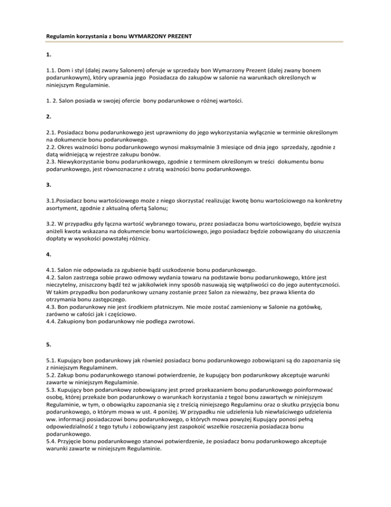 Regulamin korzystania z bonu WYMARZONY PREZENT 1. 1.1. Dom i styl (dalej zwany Salonem) oferuje w sprzedaży bon Wymarzony Prezent (dalej zwany bonem podarunkowym), który uprawnia jego Posiadacza do zakupów w salonie na warunkach określonych w niniejszym Regulaminie. 1. 2. Salon posiada w swojej ofercie bony podarunkowe o różnej wartości. 2. 2.1. Posiadacz bonu podarunkowego jest uprawniony do jego wykorzystania wyłącznie w terminie określonym na dokumencie bonu podarunkowego. 2.2. Okres ważności bonu podarunkowego wynosi maksymalnie 3 miesiące od dnia jego sprzedaży, zgodnie z datą widniejącą w rejestrze zakupu bonów. 2.3. Niewykorzystanie bonu podarunkowego, zgodnie z terminem określonym w treści dokumentu bonu podarunkowego, jest równoznaczne z utratą ważności bonu podarunkowego. 3. 3.1.Posiadacz bonu wartościowego może z niego skorzystać realizując kwotę bonu wartościowego na konkretny asortyment, zgodnie z aktualną ofertą Salonu; 3.2. W przypadku gdy łączna wartość wybranego towaru, przez posiadacza bonu wartościowego, będzie wyższa aniżeli kwota wskazana na dokumencie bonu wartościowego, jego posiadacz będzie zobowiązany do uiszczenia dopłaty w wysokości powstałej różnicy. 4. 4.1. Salon nie odpowiada za zgubienie bądź uszkodzenie bonu podarunkowego. 4.2. Salon zastrzega sobie prawo odmowy wydania towaru na podstawie bonu podarunkowego, które jest nieczytelny, zniszczony bądź też w jakikolwiek inny sposób nasuwają się wątpliwości co do jego autentyczności. W takim przypadku bon podarunkowy uznany zostanie przez Salon za nieważny, bez prawa klienta do otrzymania bonu zastępczego. 4.3. Bon podarunkowy nie jest środkiem płatniczym. Nie może zostać zamieniony w Salonie na gotówkę, zarówno w całości jak i częściowo. 4.4. Zakupiony bon podarunkowy nie podlega zwrotowi. 5. 5.1. Kupujący bon podarunkowy jak również posiadacz bonu podarunkowego zobowiązani są do zapoznania się z niniejszym Regulaminem. 5.2. Zakup bonu podarunkowego stanowi potwierdzenie, że kupujący bon podarunkowy akceptuje warunki zawarte w niniejszym Regulaminie. 5.3. Kupujący bon podarunkowy zobowiązany jest przed przekazaniem bonu podarunkowego poinformować osobę, której przekaże bon podarunkowy o warunkach korzystania z tegoż bonu zawartych w niniejszym Regulaminie, w tym, o obowiązku zapoznania się z treścią niniejszego Regulaminu oraz o skutku przyjęcia bonu podarunkowego, o którym mowa w ust. 4 poniżej. W przypadku nie udzielenia lub niewłaściwego udzielenia ww. informacji posiadaczowi bonu podarunkowego, o których mowa powyżej Kupujący ponosi pełną odpowiedzialność z tego tytułu i zobowiązany jest zaspokoić wszelkie roszczenia posiadacza bonu podarunkowego. 5.4. Przyjęcie bonu podarunkowego stanowi potwierdzenie, że posiadacz bonu podarunkowego akceptuje warunki zawarte w niniejszym Regulaminie.