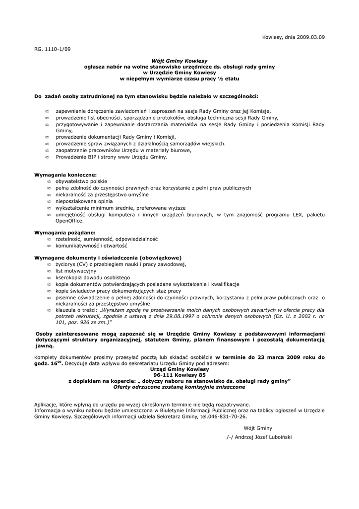 Kowiesy, dnia 2009.03.09 RG. 1110-1/09 Wójt Gminy Kowiesy ogłasza nabór na wolne stanowisko urzędnicze ds. obsługi rady gminy w Urzędzie Gminy Kowiesy w niepełnym wymiarze czasu pracy ½ etatu Do zadań osoby zatrudnionej na tym stanowisku będzie należało w szczególności: • • • • • • • zapewnianie doręczenia zawiadomień i zaproszeń na sesje Rady Gminy oraz jej Komisje, prowadzenie list obecności, sporządzanie protokołów, obsługa techniczna sesji Rady Gminy, przygotowywanie i zapewnianie dostarczania materiałów na sesje Rady Gminy i posiedzenia Komisji Rady Gminy, prowadzenie dokumentacji Rady Gminy i Komisji, prowadzenie spraw związanych z działalnością samorządów wiejskich. zaopatrzenie pracowników Urzędu w materiały biurowe, Prowadzenie BIP i strony www Urzędu Gminy. Wymagania konieczne: • obywatelstwo polskie • pełna zdolność do czynności prawnych oraz korzystanie z pełni praw publicznych • niekaralność za przestępstwo umyślne • nieposzlakowana opinia • wykształcenie minimum średnie, preferowane wyższe • umiejętność obsługi komputera i innych urządzeń biurowych, w tym znajomość programu LEX, pakietu OpenOffice. Wymagania pożądane: • rzetelność, sumienność, odpowiedzialność • komunikatywność i otwartość Wymagane dokumenty i oświadczenia (obowiązkowe) • życiorys (CV) z przebiegiem nauki i pracy zawodowej, • list motywacyjny • kserokopia dowodu osobistego • kopie dokumentów potwierdzających posiadane wykształcenie i kwalifikacje • kopie świadectw pracy dokumentujących staż pracy • pisemne oświadczenie o pełnej zdolności do czynności prawnych, korzystaniu z pełni praw publicznych oraz o niekaralności za przestępstwo umyślne • klauzula o treści: „Wyrażam zgodę na przetwarzanie moich danych osobowych zawartych w ofercie pracy dla potrzeb rekrutacji, zgodnie z ustawą z dnia 29.08.1997 o ochronie danych osobowych (Dz. U. z 2002 r. nr 101, poz. 926 ze zm.)” Osoby zainteresowane mogą zapoznać się w Urzędzie Gminy Kowiesy z podstawowymi informacjami dotyczącymi struktury organizacyjnej, statutem Gminy, planem finansowym i pozostałą dokumentacją jawną. Komplety dokumentów prosimy przesyłać pocztą lub składać osobiście w terminie do 23 marca 2009 roku do godz. 1600. Decyduje data wpływu do sekretariatu Urzędu Gminy pod adresem: Urząd Gminy Kowiesy 96-111 Kowiesy 85 z dopiskiem na kopercie: „ dotyczy naboru na stanowisko ds. obsługi rady gminy” Oferty odrzucone zostaną komisyjnie zniszczone Aplikacje, które wpłyną do urzędu po wyżej określonym terminie nie będą rozpatrywane. Informacja o wyniku naboru będzie umieszczona w Biuletynie Informacji Publicznej oraz na tablicy ogłoszeń w Urzędzie Gminy Kowiesy. Szczegółowych informacji udziela Sekretarz Gminy, tel.046-831-70-26. Wójt Gminy /-/ Andrzej Józef Luboiński