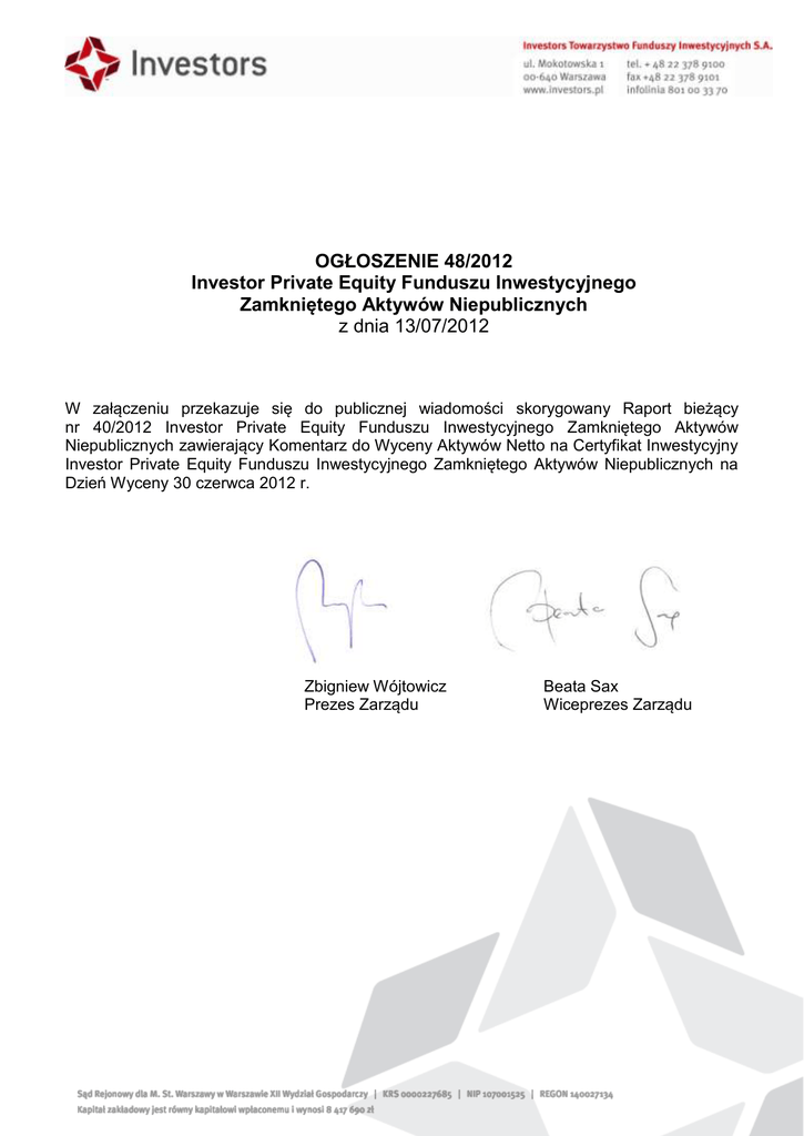 OGŁOSZENIE 48/2012 Investor Private Equity Funduszu Inwestycyjnego Zamkniętego Aktywów Niepublicznych z dnia 13/07/2012 W załączeniu przekazuje się do publicznej wiadomości skorygowany Raport bieżący nr 40/2012 Investor Private Equity Funduszu Inwestycyjnego Zamkniętego Aktywów Niepublicznych zawierający Komentarz do Wyceny Aktywów Netto na Certyfikat Inwestycyjny Investor Private Equity Funduszu Inwestycyjnego Zamkniętego Aktywów Niepublicznych na Dzień Wyceny 30 czerwca 2012 r. Zbigniew Wójtowicz Prezes Zarządu Beata Sax Wiceprezes Zarządu INVESTOR PRIVATE EQUITY FIZ AN RB_FI_E 40 2012 korekta KOMISJANADZORUFINANSOWEGO Raport bieżący funduszu inwestycyjnego nr 40 / 2012 (numer kol ejny raportu / rok) Data przekazania: 2012-07-13 Nazwa podmiotu: INVESTOR PRIVATE EQUITY FUNDUSZ INWESTYCYJNY ZAMKNIĘTY AKTYWÓW NI Temat raportu: Komentarz do Wyceny Aktywów Netto na Certyfikat Inwestycyjny Investor Private Equity Funduszu Inwestycyjnego Zamkniętego Aktywów Niepubli cznyc h na Dzień Wyceny 30 czerwca 2012 r. Podstawa prawna § 42 ust. 1 pkt 37 oie - inne zdarzenia, przewi dzi ane statutem funduszu WIADOMOŚĆ W załączeniu przekazujemy skorygowany Komentarz do Wyceny Aktywów Netto na Certyfikat Inwestycyjny Investor Private Equity Funduszu Inwestycyjnego Zamkniętego Aktywów Niepublicznych na Dzień Wyceny 30 czerwca 2012 r. Przyczyny przekazania korekty Raportu: W skutek oczywistej omyłki pisarskiej w komentarzu przekazym w dniu 4 lipca 2012 wskzanano, że Grupa Nokaut przekazała informacje o niedojściu do skutku przejęcia spółek Skąpiec.pl oraz Oponeo, podczas gdy w rzeczywsitości Grupa Nokaut przekazała informacje o niedojściu do skutku przejęcia spółek Skąpiec.pl oraz Opineo. Pli k Opi s Komentarz_06.2012_InvestorPEFIZ_kor.pdf PODPISYOSÓBREPREZENTUJĄCYCHPODMIOT Data Imię i Nazwi sko Stanowisko/Funkcja 2012-07-13 Beata Sax Wiceprezes Zarządu 2012-07-13 Dorota Winarska Prokurent Podpis Komisja Nadzoru Finansowego 1 Investor Private Equity Fundusz Inwestycyjny Zamknięty Aktywów Niepublicznych (31.03.2012 – 30.06.2012) Na dzień 30 czerwca 2012 r. dokonano kolejnej kwartalnej wyceny certyfikatów inwestycyjnych Investor Private Equity Funduszu Inwestycyjnego Zamkniętego Aktywów Niepublicznych (Fundusz), zgodnie z którą wartość jednego certyfikatu ustalono na 1531,59 zł, co oznacza spadek o 1,39 % w stosunku do wyceny z 31 marca 2012r. Spadek wyceny certyfikatów był w szczególności efektem obniżenia wyceny dwóch spółek portfelowych – Grupy Nokaut oraz CB. Szczegółowy opis przyczyn obniżenia wycen oraz najważniejsze wydarzenia w innych spółkach portfelowych prezentujemy poniżej. Grupa Nokaut opublikowała wyniki po I kwartale O niemal 20% wzrosły w pierwszych trzech miesiącach skonsolidowane przychody Grupy Nokaut, której akcje od marca tego roku notowane są na Giełdzie Papierów Wartościowych w Warszawie. Wzrost przychodów Grupy był efektem coraz większej skuteczności porównywarki Nokaut.pl. Zwiększyła się zarówno uśredniona liczba przejść jednego użytkownika Nokaut.pl do sklepu internetowego, jak i średnia cena jednego przekliku. Wzrostowi przychodów towarzyszył jednak spadek wypracowanego zysku netto, który wyniósł 220 tys. zł wobec 472 tys. zł w pierwszych trzech miesiącach 2011 r. Grupa Nokaut poinformowała również o niedojściu do skutku przejęcia spółek Skąpiec.pl oraz Opineo i związanym z tym odwołaniu prognozy wyników na 2012 r. Niekorzystne informacje przekazane przez Grupę w II kwartale zaowocowały ponad 20-procentową przecenę jej akcji na GPW, co z kolei było głównym powodem spadku wyceny certyfikatów Investor Private Equity FIZ (począwszy od 30 marca 2012 r. fundusz wycenia pakiet akcji Grupy Nokaut według wyceny giełdowej). Warto jednak podkreślić, ze giełdowa wycena internetowej porównywarki na koniec czerwca 2012 r. była nadal ponad trzykrotnie wyższa od ceny, po jakiej fundusz obejmował akcje. CB boryka się z nieuczciwą konkurencją CB, jeden z czołowych producentów i dystrybutorów specjalistycznych materiałów budowlanych, w pierwszych miesiącach 2012 roku zanotował znaczące pogorszenie osiąganej rentowności. Sytuacja ta była efektem wprowadzonych w 2011 roku na obszarze Unii Europejskiej ceł antydumpingowych na siatkę podtynkową sprowadzaną z Chin. W grupie CB znajduje się niemiecka spółka Asglatex – producent europejskiej siatki podtynkowej i teoretycznie wprowadzenie ceł powinno korzystnie wpłynąć na sytuację finansową CB. Nieuczciwa konkurencja, korzystając z pośrednictwa innych krajów (np. Malezja, Tajwan), nadal wprowadza jednak na rynek chińską siatkę podtynkową. Proceder ten pozwala to unikać ceł. CB wycofało z oferty tańsze produkty chińskie i nie uczestniczy w procederze omijania nałożonych przez UE ograniczeń. Produkty Asglatex, ze względu na wyższą jakość, są natomiast droższe. Ze względu na cały czas funkcjonującą na rynku chińską siatkę podtynkową Asglatex nie jest w stanie zwiększyć sprzedaży, natomiast CB nie może realizować zysków osiąganych do tej pory w segmencie siatki tańszej. Według informacji zarządu CB wszczęte zostały procedury zaostrzające ochronę rynku europejskiego i w dłuższym terminie wprowadzone cła antydumpingowe znajdą pozytywne odzwierciedlenie w sytuacji spółki. Pogorszenie rentowności CB w pierwszych miesiącach 2012 r. spowodowało obniżenie wyceny CB, co z kolei było drugim istotnym czynnikiem, który wpłynął na spadek wartości certyfikatów Investor Private Equity FIZ Restrukturyzacja Grupy Gwarant Grupa Gwarant, w skład której wchodzą m.in. spółki Kuźnia Jawor, FUM CHOFUM oraz Odlewnia Żeliwa, pozyskała nowego, doświadczonego prezesa zarządu. Został nim Wojciech Wrona, który w trakcie kariery zawodowej pełnił między innymi funkcje wiceprezesa i prezesa zarządu Famur, prezesa zarządu Polskiej Grupy Odlewniczej