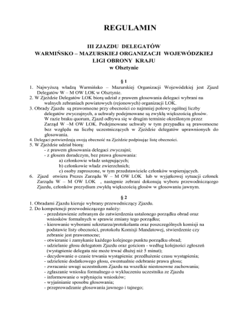 REGULAMIN III ZJAZDU DELEGATÓW WARMIŃSKO – MAZURSKIEJ ORGANIZACJI WOJEWÓDZKIEJ LIGI OBRONY KRAJU w Olsztynie §1 1. Najwyższą władzą Warmińsko – Mazurskiej Organizacji Wojewódzkiej jest Zjazd Delegatów W – M OW LOK w Olsztynie. 2. W Zjeździe Delegatów LOK biorą udział z prawem głosowania delegaci wybrani na walnych zebraniach powiatowych (rejonowych) organizacji LOK. 3. Obrady Zjazdu są prawomocne przy obecności co najmniej połowy ogólnej liczby delegatów zwyczajnych, a uchwały podejmowane są zwykłą większością głosów. W razie braku quorum, Zjazd odbywa się w drugim terminie określonym przez Zarząd W –M OW LOK. Podejmowane uchwały w tym przypadku są prawomocne bez względu na liczbę uczestniczących w Zjeździe delegatów uprawnionych do głosowania. 4. Delegaci potwierdzają swoją obecność na Zjeździe podpisując listę obecności. 5. W Zjeździe udział biorą: - z prawem głosowania delegaci zwyczajni; - z głosem doradczym, bez prawa głosowania: a) członkowie władz ustępujących; b) członkowie władz zwierzchnich; c) osoby zaproszone, w tym przedstawiciele członków wspierających. 6. Zjazd otwiera Prezes Zarządu W – M OW LOK lub w wyjątkowej sytuacji członek Zarządu W – M OW LOK , następnie zebrani dokonują wyboru przewodniczącego Zjazdu, członków prezydium zwykłą większością głosów w głosowaniu jawnym. §2 1. Obradami Zjazdu kieruje wybrany przewodniczący Zjazdu. 2. Do kompetencji przewodniczącego należy: - przedstawienie zebranym do zatwierdzenia ustalonego porządku obrad oraz wniosków formalnych w sprawie zmiany tego porządku; - kierowanie wyborami sekretarza/protokolanta oraz poszczególnych komisji na podstawie listy obecności, protokołu Komisji Mandatowej, stwierdzenie czy zebranie jest prawomocne; - otwieranie i zamykanie każdego kolejnego punktu porządku obrad; - udzielanie głosu delegatom Zjazdu oraz gościom - według kolejności zgłoszeń (wystąpienie delegata nie może trwać dłużej niż 5 minut); - decydowanie o czasie trwania wystąpienia: przedłużenie czasu wystąpienia; - udzielenie dodatkowego głosu, ewentualnie odebranie prawa głosu; - zwracanie uwagi uczestnikom Zjazdu na wszelkie niestosowne zachowania; - zgłaszanie wniosku formalnego o wykluczeniu uczestnika ze Zjazdu - informowanie o wpłynięciu wniosków; - wyjaśnianie sposobu głosowania; - przeprowadzanie głosowania jawnego i tajnego; - ustalanie kolejności głosowań; - zamknięcie Zjazdu Delegatów po wyczerpaniu spraw objętych porządkiem obrad; - podpisanie protokołu Zjazdu Delegatów; - podpisanie uchwał podjętych na Zjeździe Delegatów. 3. Przewodniczący Zjazdu kieruje wyborami komisji: Uchwał i Wniosków (3-5 osób) spośród delegatów zwyczajnych w głosowaniu jawnym, która ma za zadanie opracowanie wniosków wynikających z dyskusji na Zjeździe i przedstawienie ich w postaci projektów uchwały. Wyborczej (3-5 osób) spośród delegatów zwyczajnych w głosowaniu jawnym, która ma za zadanie zaprezentowanie kandydatów na prezesa, członków Zarządu, komisji rewizyjnej Warmińsko – Mazurskiej Organizacji Wojewódzkiej LOK i delegatów na XV Krajowy Zjazd Delegatów Ligi Obrony Kraju. Mandatowej (3-5 osób) spośród delegatów zwyczajnych w głosowaniu jawnym, która ma za zadanie sprawdzenie listy obecności i przedstawienie wniosku o uznanie prawomocności Zjazdu. Skrutacyjnej (3-5 osób) spośród delegatów zwyczajnych w głosowaniu jawnym. Po ustaleniu listy kandydatów, Zjazd Delegatów wybiera w głosowaniu jawnym Komisję Skrutacyjną. Członkowie Komisji Skrutacyjnej nie mogą kandydować do władz Warmińsko – Mazurskiej Organizacji Wojewódzkiej LOK i na delegatów na XV Krajowy Zjazd Ligi Obrony Kraju. 4. Członkowie Komisji Skrutacyjnej i Komisji Uchwał i Wniosków oraz Wyborczej i Mandatowej wybierają spośród siebie przewodniczących komisji. 5. W razie potrzeby można połączyć Komisję Mandatową i Wyborczą w jedną komisję. §3 Zjazd Delegatów obraduje według uchwalonego przez siebie regulaminu. §4 1. O przyjęciu tego regulaminu decydują delegaci w głosowaniu jawnym zwykłą większością głosów. 2. Zmiany w postanowieniach regulaminu są poddawane głosowaniu. O ich wprowadzeniu decyduje zwykła większość głosów. 3. Sprawy nieobjęte tym regulaminem rozstrzygane są zgodnie z postanowieniami Statutu Ligi Obrony Kraju i przyjętymi powszechnie zasadami obradowania. §5 Zasady Wyborcze. 1. Wszystkie władze Warmińsko – Mazurskiej Organizacji Wojewódzkiej LOK oraz delegatów na XV Krajowy Zjazd Ligi Obrony Kraju wybiera się w glosowaniu tajnym; Liczba zgłoszonych kandydatów do Zarządu, Komisji Rewizyjnej oraz na delegatów powinna przewyższać liczbę osób wybieranych. 2. Prezesa W – M OW LOK wybiera się w głosowaniu tajnym spośród zgłoszonych kandydatów. 3. Wyboru do Zarządu W – M OW LOK, w głosowaniu tajnym, dokonuje się spośród zgłoszonych kandydatów. 4. Każda kandydatura powinna być umotywowana przez zgłaszającego przed umieszczeniem na liście wyborczej. 5. Zgłoszenie kandydata na członka Zarządu, Komisji Rewizyjnej i delegata wymaga jego zgody, a spośród osób nieobecnych wymaga przedstawienia jego zgody na piśmie; 6. Jeśli w stosunku do któregokolwiek z proponowanych kandydatów wniesione zostaną sprzeciwy, delegaci po przedyskutowaniu decydują większością głosów - w jawnym glosowaniu, czy kandydaturę umieścić na liście kandydatów; 7. Kandydatury, w stosunku do których nie zgłoszono sprzeciwu umieszcza się na liście bez głosowania według alfabetu. §6 1. Z obrad Zjazdu Delegatów sporządzany jest protokół, który podpisuje przewodniczący i sekretarz protokolant. 2. Jeśli złożone są pisemne zastrzeżenia do protokołu, to zostaje on przyjęty na następnym Zjeździe delegatów. 3. Protokół przechowywany jest w Warmińsko – Mazurskiej Organizacji Wojewódzkiej LOK w Olsztynie (ko