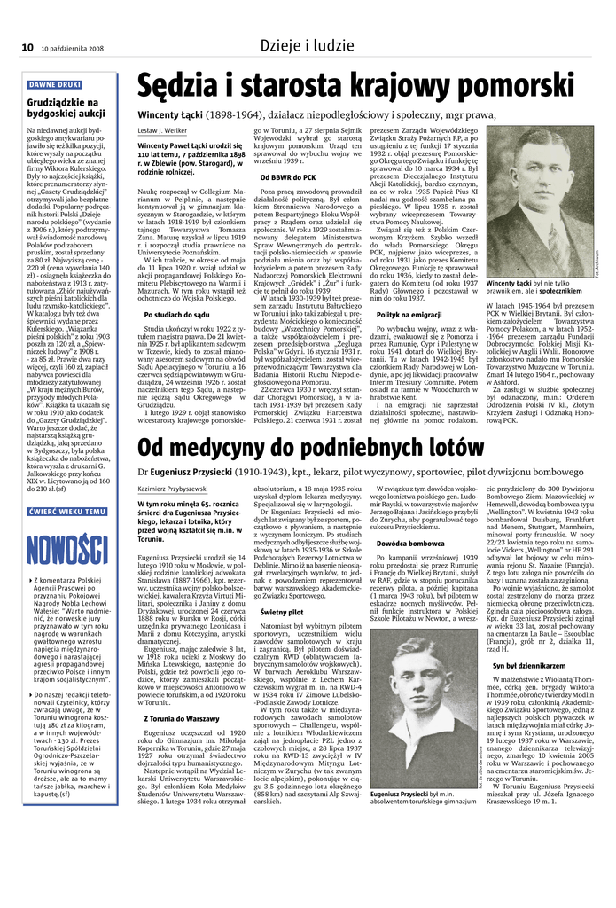 Dzieje i ludzie 10 października 2008 Grudziądzkie na bydgoskiej aukcji Na niedawnej aukcji bydgoskiego antykwariatu pojawiło się też kilka pozycji, które wyszły na początku ubiegłego wieku ze znanej firmy Wiktora Kulerskiego. Były to najczęściej książki, które prenumeratorzy słynnej „Gazety Grudziądzkiej” otrzymywali jako bezpłatne dodatki. Popularny podręcznik historii Polski „Dzieje narodu polskiego” (wydanie z 1906 r.), który podtrzymywał świadomość narodową Polaków pod zaborem pruskim, został sprzedany za 80 zł. Najwyższą cenę 220 zł (cena wywołania 140 zł) - osiągnęła książeczka do nabożeństwa z 1913 r. zatytułowana „Zbiór najużywańszych pieśni katolickich dla ludu rzymsko-katolickiego”. W katalogu były też dwa śpiewniki wydane przez Kulerskiego. „Wiązanka pieśni polskich” z roku 1903 poszła za 120 zł, a „Śpiewniczek ludowy” z 1908 r. - za 85 zł. Prawie dwa razy więcej, czyli 160 zł, zapłacił nabywca powieści dla młodzieży zatytułowanej „W kraju mężnych Burów, przygody młodych Polaków”. Książka ta ukazała się w roku 1910 jako dodatek do „Gazety Grudziądzkiej”. Warto jeszcze dodać, że najstarszą książką grudziądzką, jaką sprzedano w Bydgoszczy, była polska książeczka do nabożeństwa, która wyszła z drukarni G. Jalkowskiego przy końcu XIX w. Licytowano ją od 160 do 210 zł.(sf) ĆWIERĆ WIEKU TEMU Z komentarza Polskiej Agencji Prasowej po przyznaniu Pokojowej Nagrody Nobla Lechowi Wałęsie: ”Warto nadmienić, że norweskie jury przyznawało w tym roku nagrodę w warunkach gwałtownego wzrostu napięcia międzynarodowego i narastającej agresji propagandowej przeciwko Polsce i innym krajom socjalistycznym”. Do naszej redakcji telefonowali Czytelnicy, którzy zwracają uwagę, że w Toruniu winogrona kosztują 180 zł za kilogram, a w innych województwach - 130 zł. Prezes Toruńskiej Spółdzielni Ogrodniczo-Pszczelarskiej wyjaśnia, że w Toruniu winogrona są droższe, ale za to mamy tańsze jabłka, marchew i kapustę.(sf) Sędzia i starosta krajowy pomorski Wincenty Łącki (1898-1964), działacz niepodległościowy i społeczny, mgr prawa, Lesław J. Werlker Wincenty Paweł Łącki urodził się 110 lat temu, 7 października 1898 r. w Zblewie (pow. Starogard), w rodzinie rolniczej. Naukę rozpoczął w Collegium Marianum w Pelplinie, a następnie kontynuował ją w gimnazjum klasycznym w Starogardzie, w którym w latach 1918-1919 był członkiem tajnego Towarzystwa Tomasza Zana. Maturę uzyskał w lipcu 1919 r. i rozpoczął studia prawnicze na Uniwersytecie Poznańskim. W ich trakcie, w okresie od maja do 11 lipca 1920 r. wziął udział w akcji propagandowej Polskiego Komitetu Plebiscytowego na Warmii i Mazurach. W tym roku wstąpił też ochotniczo do Wojska Polskiego. Po studiach do sądu Studia ukończył w roku 1922 z tytułem magistra prawa. Do 21 kwietnia 1925 r. był aplikantem sądowym w Tczewie, kiedy to został mianowany asesorem sądowym na obwód Sądu Apelacyjnego w Toruniu, a 16 czerwca sędzią powiatowym w Grudziądzu, 24 września 1926 r. został naczelnikiem tego Sądu, a następnie sędzią Sądu Okręgowego w Grudziądzu. 1 lutego 1929 r. objął stanowisko wicestarosty krajowego pomorskie- go w Toruniu, a 27 sierpnia Sejmik Wojewódzki wybrał go starostą krajowym pomorskim. Urząd ten sprawował do wybuchu wojny we wrześniu 1939 r. Od BBWR do PCK Poza pracą zawodową prowadził działalność polityczną. Był członkiem Stronnictwa Narodowego a potem Bezpartyjnego Bloku Współpracy z Rządem oraz udzielał się społecznie. W roku 1929 został mianowany delegatem Ministerstwa Spraw Wewnętrznych do pertraktacji polsko-niemieckich w sprawie podziału mienia oraz był współzałożycielem a potem prezesem Rady Nadzorczej Pomorskich Elektrowni Krajowych „Gródek” i „Żur” i funkcję tę pełnił do roku 1939. W latach 1930-1939 był też prezesem zarządu Instytutu Bałtyckiego w Toruniu i jako taki zabiegał u prezydenta Mościckiego o konieczność budowy „Wszechnicy Pomorskiej”, a także współzałożycielem i prezesem przedsiębiorstwa „Żegluga Polska” w Gdyni. 16 stycznia 1931 r. był współzałożycielem i został wiceprzewodniczącym Towarzystwa dla Badania Historii Ruchu Niepodległościowego na Pomorzu. 22 czerwca 1930 r. wręczył sztandar Chorągwi Pomorskiej, a w latach 1931-1939 był prezesem Rady Pomorskiej Związku Harcerstwa Polskiego. 21 czerwca 1931 r. został prezesem Zarządu Wojewódzkiego Związku Straży Pożarnych RP, a po ustąpieniu z tej funkcji 17 stycznia 1932 r. objął prezesurę Pomorskiego Okręgu tego Związku i funkcję tę sprawował do 10 marca 1934 r. Był prezesem Diecezjalnego Instytutu Akcji Katolickiej, bardzo czynnym, za co w roku 1935 Papież Pius XI nadał mu godność szambelana papieskiego. W lipcu 1935 r. został wybrany wiceprezesem Towarzystwa Pomocy Naukowej. Związał się też z Polskim Czerwonym Krzyżem. Szybko wszedł do władz Pomorskiego Okręgu PCK, najpierw jako wiceprezes, a od roku 1931 jako prezes Komitetu Okręgowego. Funkcję tę sprawował do roku 1936, kiedy to został delegatem do Komitetu (od roku 1937 Rady) Głównego i pozostawał w nim do roku 1937. Fot. Archiwum DAWNE DRUKI Wincenty Łącki był nie tylko prawnikiem, ale i społecznikiem W latach 1945-1964 był prezesem PCK w Wielkiej Brytanii. Był członkiem-założycielem Towarzystwa Pomocy Polakom, a w latach 1952-1964 prezesem zarządu Fundacji Dobroczynności Polskiej Misji Katolickiej w Anglii i Walii. Honorowe członkostwo nadało mu Pomorskie Towarzystwo Muzyczne w Toruniu. Zmarł 14 lutego 1964 r., pochowany w Ashford. Za zasługi w służbie społecznej był odznaczony, m.in.: Orderem Odrodzenia Polski IV kl., Złotym Krzyżem Zasługi i Odznaką Honorową PCK. Polityk na emigracji Po wybuchu wojny, wraz z władzami, ewakuował się z Pomorza i przez Rumunię, Cypr i Palestynę w r