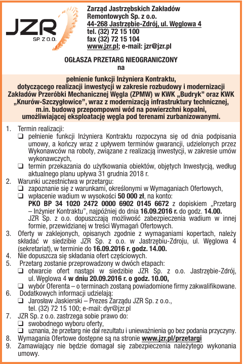 Zarząd Jastrzębskich Zakładów Remontowych Sp. z o.o. 44-268 Jastrzębie-Zdrój, ul. Węglowa 4 tel. (32) 72 15 100 fax (32) 72 15 104 www.jzr.pl; e-mail: [email protected] OGŁASZA PRZETARG NIEOGRANICZONY na pełnienie funkcji Inżyniera Kontraktu, dotyczącego realizacji inwestycji w zakresie rozbudowy i modernizacji Zakładów Przeróbki Mechanicznej Węgla (ZPMW) w KWK „Budryk” oraz KWK „Knurów-Szczygłowice”, wraz z modernizacją infrastruktury technicznej, m.in. budową przepompowni wód na powierzchni kopalni, umożliwiającej eksploatację węgla pod terenami zurbanizowanymi. 1. Termin realizacji: ❑ pełnienie funkcji Inżyniera Kontraktu rozpoczyna się od dnia podpisania umowy, a kończy wraz z upływem terminów gwarancji, udzielonych przez Wykonawców na roboty, związane z realizacją inwestycji, w zakresie umów wykonawczych, ❑ termin przekazania do użytkowania obiektów, objętych Inwestycją, według aktualnego planu upływa 31 grudnia 2018 r. 2. Warunki uczestnictwa w przetargu: ❑ zapoznanie się z warunkami, określonymi w Wymaganiach Ofertowych, ❑ wpłacenie wadium w wysokości 50 000 zł, na konto: PKO BP 34 1020 2472 0000 6902 0145 6672 z dopiskiem „Przetarg – Inżynier Kontraktu”, najpóźniej do dnia 16.09.2016 r. do godz. 14.00. JZR Sp. z o.o. dopuszczają możliwość zabezpieczenia wadium w innej formie, przewidzianej w treści Wymagań Ofertowych. 3. Oferty w zaklejonych, opisanych zgodnie z wymaganiami kopertach, należy składać w siedzibie JZR Sp. z o.o. w Jastrzębiu-Zdroju, ul. Węglowa 4 (sekretariat), w terminie do 16.09.2016 r. godz. 14.00. 4. Nie dopuszcza się składania ofert częściowych. 5. Przetarg zostanie przeprowadzony w dwóch etapach: ❑ otwarcie ofert nastąpi w siedzibie JZR Sp. z o.o. Jastrzębie-Zdrój, ul. Węglowa 4 w dniu 20.09.2016 r. o godz. 10.00, ❑ wybór Oferenta – o terminach zostaną powiadomione firmy zakwalifikowane. 6. Dodatkowych informacji udzielają: ❑ Jarosław Jaskierski – Prezes Zarządu JZR Sp. z o.o., tel. (32) 72 15 100; e-mail: [email protected] 7. JZR Sp. z o.o. zastrzega sobie prawo do: ❑ swobodnego wyboru oferty, ❑ uznania, że przetarg nie dał rezultatu i unieważnienia go bez podania przyczyny. 8. Wymagania Ofertowe dostępne są na stronie www.jzr.pl/przetargi 9. Zamawiający nie będzie domagał się zabezpieczenia należytego wykonania umowy.