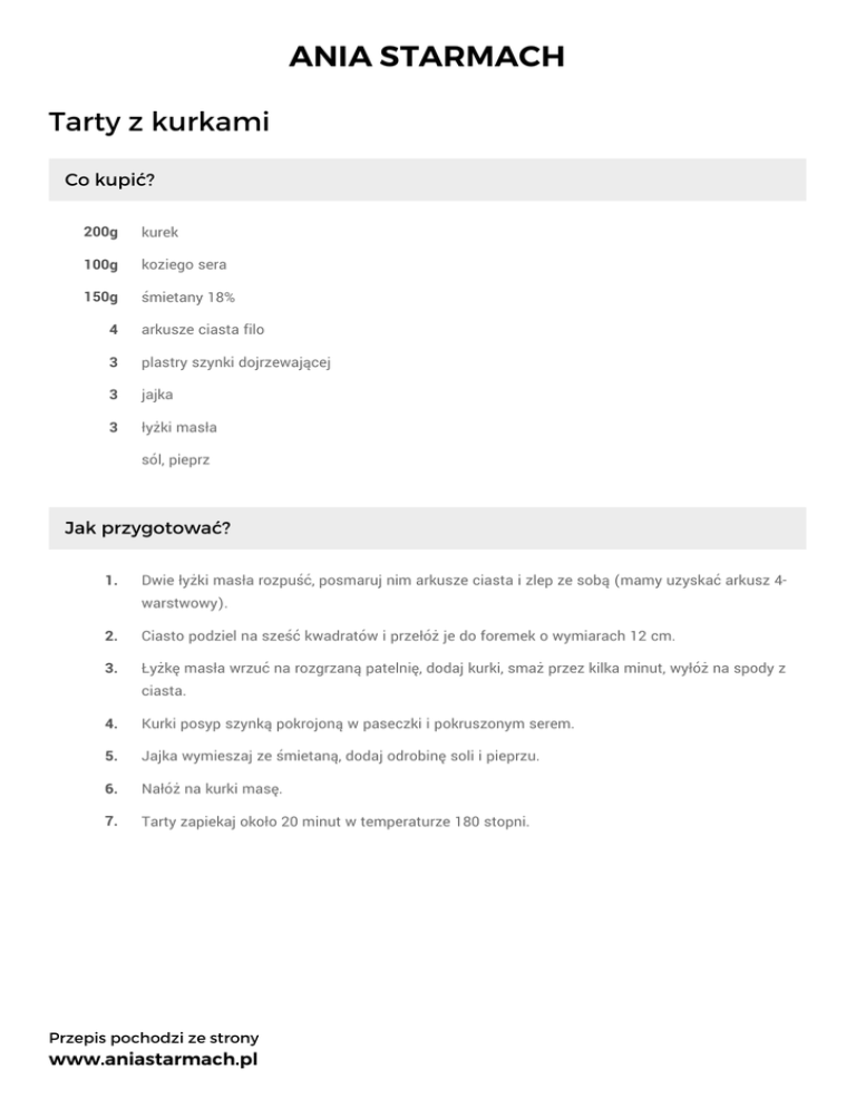 ANIA STARMACH Tarty z kurkami Co kupić? 200g kurek 100g koziego sera 150g śmietany 18% 4 arkusze ciasta filo 3 plastry szynki dojrzewającej 3 jajka 3 łyżki masła sól, pieprz Jak przygotować? 1. Dwie łyżki masła rozpuść, posmaruj nim arkusze ciasta i zlep ze sobą (mamy uzyskać arkusz 4warstwowy). 2. Ciasto podziel na sześć kwadratów i przełóż je do foremek o wymiarach 12 cm. 3. Łyżkę masła wrzuć na rozgrzaną patelnię, dodaj kurki, smaż przez kilka minut, wyłóż na spody z ciasta. 4. Kurki posyp szynką pokrojoną w paseczki i pokruszonym serem. 5. Jajka wymieszaj ze śmietaną, dodaj odrobinę soli i pieprzu. 6. Nałóż na kurki masę. 7. Tarty zapiekaj około 20 minut w temperaturze 180 stopni. Przepis pochodzi ze strony www.aniastarmach.pl
