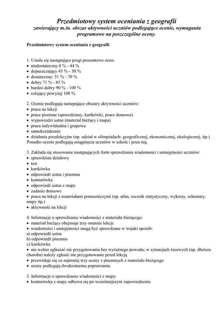 Przedmiotowy system oceniania z geografii zawierający m.in. obszar aktywności uczniów podlegające ocenie, wymagania programowe na poszczególne oceny. Przedmiotowy system oceniania z geografii 1. Ustala się następujące progi procentowe ocen: niedostateczny 0 % - 44 % dopuszczający 45 % - 50 % dostateczny: 51 % - 70 % dobry 71 % - 85 % bardzo dobry 90 % - 100 % celujący powyżej 100 % 2. Ocenie podlegają następujące obszary aktywności uczniów: praca na lekcji prace pisemne (sprawdziany, kartkówki, prace domowe) wypowiedzi ustne (materiał bieżący i mapa) praca indywidualna i grupowa samokształcenie działania pozalekcyjne (np. udział w olimpiadach: geograficznej, ekonomicznej, ekologicznej, itp.) Ponadto ocenie podlegają osiągnięcia uczniów w szkole i poza nią. 3. Zakłada się stosowanie następujących form sprawdzania wiadomości i umiejętności uczniów: sprawdzian działowy test kartkówka odpowiedź ustna i pisemna konturówka odpowiedź ustna z mapy zadanie domowe praca na lekcji z materiałami pomocniczymi (np. atlas, rocznik statystyczny, wykresy, schematy, mapy itp.) aktywność na lekcji 4. Informacje o sprawdzaniu wiadomości z materiału bieżącego: materiał bieżący obejmuje trzy ostatnie lekcje wiadomości i umiejętności mogą być sprawdzane w trojaki sposób: a) odpowiedź ustna b) odpowiedź pisemna c) kartkówka nie wolno zgłaszać nie przygotowania bez wyraźnego powodu; w sytuacjach losowych (np. dłuższa choroba) należy zgłosić nie przygotowanie przed lekcją przewiduje się co najmniej trzy oceny z pisemnych z materiału bieżącego oceny podlegają dwukrotnemu poprawianiu 5. Informacje o sprawdzaniu wiadomości z mapy: konturówka z mapy odbywa się po wcześniejszym zapowiedzeniu klasy pierwsze obowiązuje mapa fizyczna świata klasy drugie obowiązuje mapa polityczna świata klasy trzecie obowiązuje mapa fizyczna, administracyjna i gospodarcza Polski oceny z konturówki mogą być poprawiane ustnie lub pisemnie 6. Informacje o sprawdzianach sprawdzian poprzedzony jest lekcją powtórzeniową sprawdzian jest zapowiadany co najmniej tydzień przed terminem, a informacja o nim jest odnotowana w dzienniku lekcyjnym nie przekłada się sprawdzianów osoby nieobecne podczas sprawdzianu są zobowiązane do jego napisania na kolejnej lekcji (wyjątek: osoby, które były przez dłuższy czas nieobecne w szkole [np. 2 tygodnie] i nie zdążyły nadrobić materiału a uzyskały zgodę nauczyciela uczącego na pisanie w innym terminie) prace pisemne (sprawdziany, testy itp.) oddawane są najczęściej w ciągu dwóch tygodni, nie później jednak niż po miesiącu oceny niedostateczne ze sprawdzianów mogą być poprawiane w terminie dwóch tygodni od oddania sprawdzianu na tydzień przed wystawieniem oceny semestralnej i rocznej nie można poprawiać ocen niedostatecznych ze sprawdzianów 7. Formy zapisu informacji o postępach uczniów: sprawdzian - „S” - kolor czerwony odpowiedź - „O” kartkówka - „K” aktywność - „A” mapa - „M” praca na lekcji lub w domu - „Z” 8. Wymagania programowe: ocena dopuszczająca uczeń pamięta niezbędne fakty i nazwy posiada wiadomości i umiejętności niezbędne do dalszej nauki potrafi wykonać proste czynności poznawcze niezbędne do dalszej nauki rozwiązuje zadania typowe o niskim stopniu trudności z pomocą nauczyciela czyta proste wykresy, tabele z danymi statystycznymi wskazuje na mapie świata i Polski niezbędne do dalszej nauki obiekty geograficzne ocena dostateczna uczeń pamięta i wyjaśnia główne terminy, pojęcia i prawidłowości próbuje podawać przyczyny i skutki procesów i zjawisk geograficznych rozwiązuje zadania typowe o średnim stopniu trudności, interdyscyplinarne opisuje i próbuje wyjaśniać wykresy i tabele z danymi statystycznymi wskazuje na mapie świata i Polski podstawowe obiekty geograficzne ocena dobra uczeń wykonuje samodzielnie mniej typowe zadania praktyczne i teoretyczne posiada wiadomości umiarkowanie trudne do opanowania, przydatne, ale niezbędne w dalszej nauce wymagania rozszerzające stanowią pogłębienie i poszerzenie wymagań podstawowych wyjaśnia przyczyny i skutki procesów i zjawisk geograficznych potrafi wyprowadzać wnioski na podstawie analizy wykresów i danych statystycznych wskazuje na mapie świata i Polski większość ważnych obiektów geograficznych ocena bardzo dobra uczeń samodzielnie rozwiązuje zadania programowe, uzupełnia samodzielnie brakujące ogniwa wiedzy i potrafi je zastosować w nowych sytuacjach rozwiązuje zadania trudne, wymagające kreatywności potrafi oceniać i prognozować na podstawie danych statystycznych i wykresów wskazuje na mapie świata i Polski wszystkie ważne obiekty geograficzne ocena celująca uczeń potrafi wskazać luki w swej wiedzy i umiejętnościach, uzupełnia je, korzystając z różnych źródeł informacji samodzielnie tworzy nowe struktury wiedzy wykonuje zadania poza programowe ocenia i wartościuje procesy i zjawiska proponuje rozwiązania problemów wskazuje na mapie świata i Polski mniej ważne obiekty geograficzne
