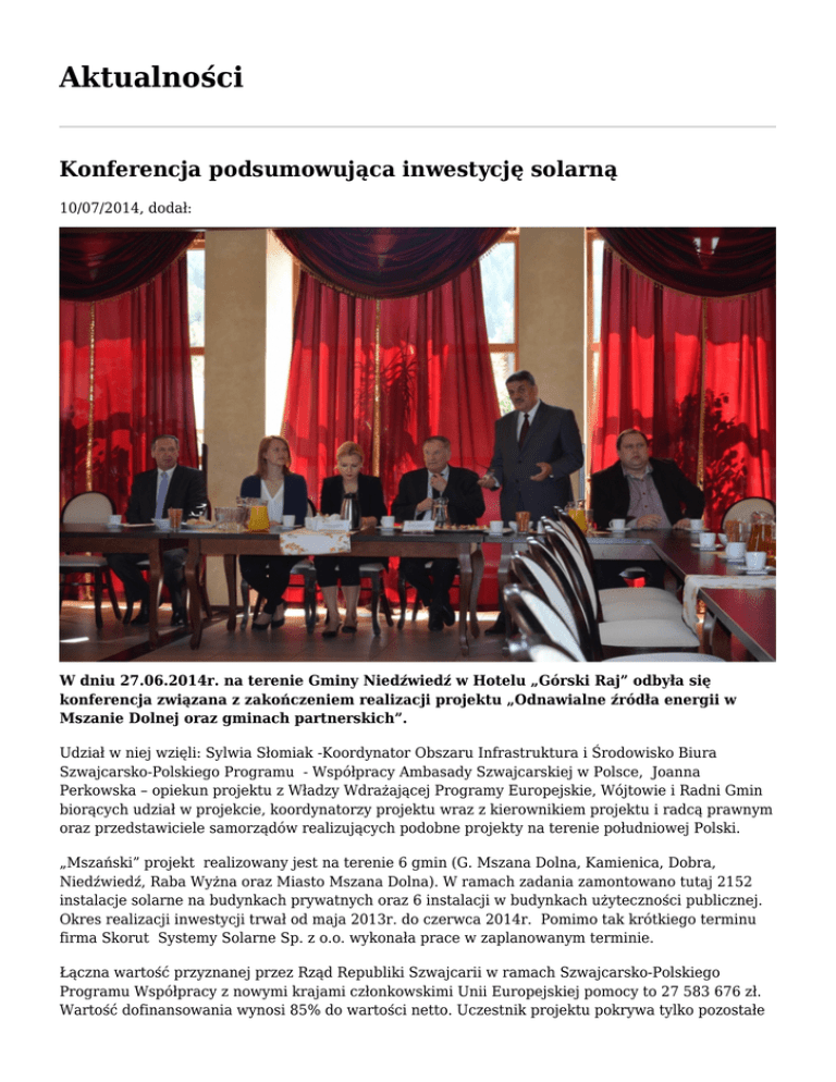 Aktualności Konferencja podsumowująca inwestycję solarną 10/07/2014, dodał: W dniu 27.06.2014r. na terenie Gminy Niedźwiedź w Hotelu „Górski Raj” odbyła się konferencja związana z zakończeniem realizacji projektu „Odnawialne źródła energii w Mszanie Dolnej oraz gminach partnerskich”. Udział w niej wzięli: Sylwia Słomiak -Koordynator Obszaru Infrastruktura i Środowisko Biura Szwajcarsko-Polskiego Programu - Współpracy Ambasady Szwajcarskiej w Polsce, Joanna Perkowska – opiekun projektu z Władzy Wdrażającej Programy Europejskie, Wójtowie i Radni Gmin biorących udział w projekcie, koordynatorzy projektu wraz z kierownikiem projektu i radcą prawnym oraz przedstawiciele samorządów realizujących podobne projekty na terenie południowej Polski. „Mszański” projekt realizowany jest na terenie 6 gmin (G. Mszana Dolna, Kamienica, Dobra, Niedźwiedź, Raba Wyżna oraz Miasto Mszana Dolna). W ramach zadania zamontowano tutaj 2152 instalacje solarne na budynkach prywatnych oraz 6 instalacji w budynkach użyteczności publicznej. Okres realizacji inwestycji trwał od maja 2013r. do czerwca 2014r. Pomimo tak krótkiego terminu firma Skorut Systemy Solarne Sp. z o.o. wykonała prace w zaplanowanym terminie. Łączna wartość przyznanej przez Rząd Republiki Szwajcarii w ramach Szwajcarsko-Polskiego Programu Współpracy z nowymi krajami członkowskimi Unii Europejskiej pomocy to 27 583 676 zł. Wartość dofinansowania wynosi 85% do wartości netto. Uczestnik projektu pokrywa tylko pozostałe 15% i wartość podatku VAT. Inwestycja na tym terenie rozpoczęła się podpisaniem umowy w dniu 24.04.2013r. Czerwcowa wizyta władz programu miała na celu podsumowanie 1 etapu realizacji robót, sprawdzenie jakości wykonywanych prac w budynkach publicznych, jak również poznanie opinii mieszkańców u których już zainstalowane zostały panele słoneczne – relacjonuje kierownik projektu Antoni Róg. Konferencja zakończyła się pełnym sukcesem – z zadowoleniem podkreśla Wójt Bolesław Żaba, lider projektu. Przedstawiciele Władzy Wdrażającej bardzo dobrze ocenili podejmowane działania podczas realizacji projektu. Szczególnie doceniono pracę zespołu koordynującego: Antoniego Roga jako Kierownika całego projektu, Beaty Paluszek – Koordynatora merytorycznego oraz r.pr. Krzysztofa Smagi sprawującego nadzór prawny nad projektem. Warto podkreślić iż dzięki wspólnej pracy wszystkich partnerów projektu i wzajemnej pomocy oraz zorganizowanej pracy wykonawcy Firmy Skorut Systemy Solarne Sp. z o.o. i Inspektora Nadzoru PW „Elma” udało się zamontować w tak krótkim czasie bardzo zróżnicowane zestawy solarne – informuje Antoni Róg. Realizacja programu nie była łatwa. Na początku tego roku pojawiły się plotki, że nałożono na nas kilka milionów kary za złamanie przepisów prawa zamówień publicznych. Rzeczywiście mieliśmy problem. Pod koniec roku Władza Wdrażająca wstrzymała nam wniosek o płatność pierwszej transzy do wyjaśnienia. Cały projekt przechodził kilka kontroli – Urzędu Zamówień Publicznych, Ministerstwa Rozwoju Regionalnego, Ambasady Szwajcarskiej, a nawet CBA. Tylko jedna z kontroli wskazała nam uchybienia – audytorzy wynajęci przez Władzę Wdrażającą zarzucili nam, że popełniliśmy błędy w przetargach i że powinniśmy te przetargi unieważnić. W takiej sytuacji regułą jest wstrzymanie rozliczenia do wyjaśnienia sprawy. Chwilę to trwało, ale w końcu nasze argumenty zostały uznane. Nie ma więc żadnych podstaw do mówienia o jakichś karach; to zwykłe sianie niepokoju. Cała sprawa znalazła szybkie rozwiązanie, także dzięki stanowczej postawie Wójta Janusza Potaczka i Wójta Bolesława Żaby. Najlepszą oceną programu jest liczba chętnych, którzy chcieliby w nim dalej uczestniczyć. Okazuje się, że „niedowiarki”, którzy z różnych powodów nie przystąpili do projektu, teraz chętnie by się do niego zapisali ponownie. Na początku musieliśmy prostować mnóstwo „bajek”, a to, że będzie podatek od słońca, że to się nie opłaca, że instalacje będą wybuchać lub zamarzać itp. Teraz, osoby te widzą, co straciły, jak wygodne jest życie sąsiadów, którzy codziennie mogą korzystać z ciepłej wody bez konieczności palenia w piecu. Stąd liczne zapisy na listę rezerwową. Dla tych właśnie osób są dobre informacje – w pierwszym przetargu zaoszczędziliśmy około 8 mln złotych – udało się uzyskać naprawdę bardzo dobre ceny. Do tego doszły różnice kursowe walut. Realizatorzy projektu złożyli wniosek, aby te pieniądze przerzucić na 2 etap projektu- w ten sposób do 2152 instalacji mogłoby dojść jeszcze około 1 100 domów. Już w styczniu wraz z Wójtem Bolesławem Żabą przeprowadziliśmy rozmowy w ambasadzie szwajcarskiej i uzyskaliśmy zapewnienie o pozostawieniu oszczędności do naszej dyspozycji na tych samych warunkach czyli dofinansowania 85% - relacjonuje kierownik projektu. W najbliższym czasie rozpocznie się montaż dodatkowych około 30 instalacji w każdej z Gmin, natomiast w przyszłych roku zamierzamy montować pozostałe instalacje. Najlepszym podsumowaniem programu są pozytywne opinie osób już korzystających z zamontowanych w ramach programu instalacji – z zadowoleniem podkreślają samorządowcy. Wskazują oni, że zmieniły się ich codzienne zwyczaje. Do tej pory musieli się wcześnie rano zrywać, żeby ogrzać wodę poprzez palenie w piecu węglem lub drzewem teraz mogą spokojnie mogą poświęcić ten czas na inne sprawy. To ogromna zmiana. Wystarczy kilka godzin w miarę słonecznej pogody aby zapewnić mieszkańcom zapas kilkuset litrów gorącej wody, często wystarczający na parę dni. Teraz wśród partnerów projektu krąży anegdota, że mieszkańcy wychodząc z kościoła po Mszy św. w niedzielę rozmawiają ze sobą o zamontowanych u nich solarach, a na powitanie pytają się wzajemni