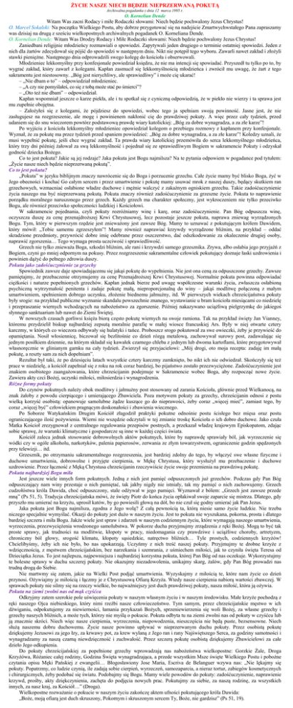 ŻYCIE NASZE NIECH BĘDZIE NIEPRZERWANĄ POKUTĄ Archiwalna pogadanka z dnia 12 marca 1995 r. O. Kornelian Dende Witam Was zacni Rodacy i miłe Rodaczki słowami: Niech będzie pochwalony Jezus Chrystus! O. Marcel Sokalski: Na początku Wielkiego Postu, aby dobrze przygotować się na nadejście Zmartwychwstałego Pana zapraszamy was dzisiaj na drugą z sześciu wielkopostnych archiwalnych pogadanek O. Korneliana Dende. O. Kornelian Dende: Witam Was Drodzy Rodacy i Miłe Rodaczki słowami: Niech będzie pochwalony Jezus Chrystus! Zaniedbani religijnie młodzieńcy rozmawiali o spowiedzi. Zapytywali jeden drugiego o terminie ostatniej spowiedzi. Jeden z nich dla żartów zdecydował się pójść do spowiedzi w następnym dniu. Nikt nie potępił tego wyboru. Zawarli nawet zakład i złożyli stawki pieniężne. Następnego dnia odprowadzili swego kolegę do kościoła i obserwowali. Młodzieniec lekkomyślny przy konfesjonale powiedział księdzu, że nie ma intencji się spowiadać. Przyszedł tu tylko po to, by wygrać zakład, który zawarł z kolegami. Kapłan zasmucił się lekkomyślnością młodzieńca i zwrócił mu uwagę, że żart z tego sakramentu jest niestosowny. „Bóg jest nierychliwy, ale sprawiedliwy” i może cię ukarać! – „Nie dbam o to” – odpowiedział młodzieniec. – „A czy nie pomyślałeś, co się z tobą może stać po śmierci”? – „Oto też nie dbam” – odpowiedział. Kapłan wspomniał jeszcze o karze piekła, ale i tu spotkał się z cyniczną odpowiedzią, że w piekło nie wierzy i ta sprawa jest mu zupełnie obojętna. – Założyłeś się z kolegami, że pójdziesz do spowiedzi, wobec tego ja spełniam swoją powinność. Jasne jest, że nie zasługujesz na rozgrzeszenie, ale mogę i powinienem nakłonić cię do prawdziwej pokuty. A więc przez cały tydzień, przed udaniem się do snu wieczorem powtórz podstawową prawdę wiary katolickiej: „Bóg za dobre wynagradza, a za złe karze”! Po wyjściu z kościoła lekkomyślny młodzieniec opowiedział kolegom o przebiegu rozmowy z kapłanem przy konfesjonale. Wyznał, że za pokutę ma przez tydzień przed spaniem powiedzieć: „Bóg za dobre wynagradza, a za złe karze”! Koledzy uznali, że musi wypełnić pokutę, jeśli chce wygrać zakład. Ta prawda wiary katolickiej przemówiła do serca lekkomyślnego młodzieńca, który trzy dni później żałował za swą lekkomyślność i pojednał się ze sprawiedliwym Bogiem w sakramencie Pokuty i odzyskał godność dziecka Bożego. Co to jest pokuta? Jakie są jej rodzaje? Jaka pokuta jest Bogu najmilsza? Na te pytania odpowiem w pogadance pod tytułem: „Życie nasze niech będzie nieprzerwaną pokutą”. Co to jest pokuta? „Pokuta” w języku biblijnym znaczy nawrócenie się do Boga i porzucenie grzechu. Całe życie mamy być blisko Boga, żyć w Jego obecności i kochać Go całym sercem i przez umartwienie i pokutę mamy usuwać mrok z naszej duszy, będący skutkiem ran grzechowych, wzmacniać osłabione władze duchowe i mężnie walczyć z zakaźnym ogniskiem grzechu. Takie zadośćuczynienie życia naszego ma być nieprzerwaną pokutą. Pokuta znaczy również zadośćuczynienie za grzeszne życie. Pokuta to naprawienie porządku moralnego naruszonego przez grzech. Każdy grzech ma charakter społeczny, jest wykroczeniem nie tylko przeciwko Bogu, ale również przeciwko społeczności ludzkiej i Kościołowi. W sakramencie pojednania, czyli pokuty rozróżniamy winę i karę, oraz zadośćuczynienie. Pan Bóg odpuszcza winę, oczyszcza duszę za cenę przenajdroższej Krwi Chrystusowej, lecz pozostaje jeszcze pokuta, naprawa zniewag wyrządzonych Bogu. Tym, który w pierwszym rzędzie jest znieważony jest zawsze Bóg. Mamy to uznawać z pokutującym królem Dawidem, który mówił: „Tobie samemu zgrzeszyłem”! Mamy również naprawiać krzywdy wyrządzone bliźnim, na przykład – oddać skradzione przedmioty, przywrócić dobre imię odebrane przez oszczerstwo, dać odszkodowanie za okaleczenie drugiej osoby, naprawić zgorszenia… Tego wymaga prosta uczciwość i sprawiedliwość. Grzech nie tylko znieważa Boga, szkodzi bliźnim, ale rani i krzywdzi samego grzesznika. Zrywa, albo osłabia jego przyjaźń z Bogiem, czyni go mniej odpornym na pokusy. Przez rozgrzeszenie sakramentalne człowiek pokutujący doznaje łaski uzdrowienia i powinien dążyć do pełnego zdrowia duszy. Pokuta jako zadośćuczynienie za grzechy Spowiednik zawsze daje spowiadającemu się jakąś pokutę do wypełnienia. Nie jest ona ceną za odpuszczone grzechy. Zawsze pamiętajmy, że przebaczenie otrzymujemy za cenę Przenajdroższej Krwi Chrystusowej. Normalnie pokuta powinna odpowiadać ciężkości i naturze popełnionych grzechów. Kapłan jednak bierze pod uwagę współczesne warunki życia, zwłaszcza osłabioną psychiczną wytrzymałość penitenta i zadaje pokutę małą, nieproporcjonalną do winy – jakąś modlitwę połączoną z małym umartwieniem, spełnieniem dobrego uczynku, złożenie biednemu jałmużny, itd. W pierwszych wiekach chrześcijaństwa pokuty były srogie: na przykład publiczne wyznanie skandalu powszechnie znanego, wystawianie u bram kościoła miesiącami co niedzielę i przepraszanie wiernych wchodzących na nabożeństwo za zgorszenie. Później nakazywano uciążliwą pielgrzymkę do jakiegoś słynnego sanktuarium lub nawet do Ziemi Świętej. W nowszych czasach gorliwsi księża biorą często pokutę wiernych na swoje ramiona. Tak na przykład święty Jan Vianney, któremu przydzielił biskup najbardziej zepsutą moralnie parafię w małej wiosce francuskiej Ars. Były w niej otwarte cztery karczmy, w których co wieczora odbywały się hulatyki i tańce. Proboszcz srogo pokutował za swe owieczki, żeby je przywieść do opamiętania. Nosił włosiennicę, biczował się bezlitośnie co dzień rózgą metalową, zachowywał surowy post, zadawalając się jednym posiłkiem dzienn