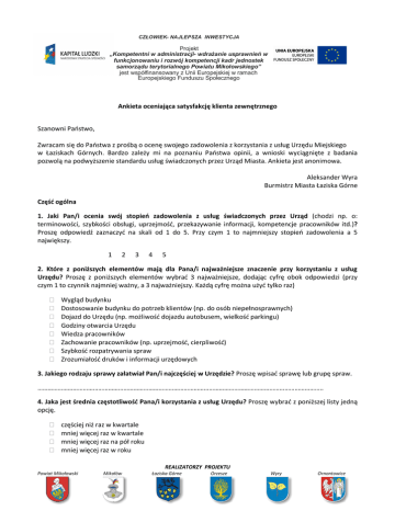 CZŁOWIEK- NAJLEPSZA INWESTYCJA Projekt „Kompetentni w administracji- wdrażanie usprawnień w funkcjonowaniu i rozwój kompetencji kadr jednostek samorządu terytorialnego Powiatu Mikołowskiego” jest współfinansowany z Unii Europejskiej w ramach Europejskiego Funduszu Społecznego Ankieta oceniająca satysfakcję klienta zewnętrznego Szanowni Państwo, Zwracam się do Państwa z prośbą o ocenę swojego zadowolenia z korzystania z usług Urzędu Miejskiego w Łaziskach Górnych. Bardzo zależy mi na poznaniu Państwa opinii, a wnioski wyciągnięte z badania pozwolą na podwyższenie standardu usług świadczonych przez Urząd Miasta. Ankieta jest anonimowa. Aleksander Wyra Burmistrz Miasta Łaziska Górne Część ogólna 1. Jaki Pan/i ocenia swój stopień zadowolenia z usług świadczonych przez Urząd (chodzi np. o: terminowości, szybkości obsługi, uprzejmość, przekazywanie informacji, kompetencje pracowników itd.)? Proszę odpowiedź zaznaczyć na skali od 1 do 5. Przy czym 1 to najmniejszy stopień zadowolenia a 5 największy. 1 2 3 4 5 2. Które z poniższych elementów mają dla Pana/i najważniejsze znaczenie przy korzystaniu z usług Urzędu? Proszę z poniższych elementów wybrać 3 najważniejsze, dodając cyfrę obok odpowiedzi (przy czym 1 to czynnik najmniej ważny, a 3 najważniejszy. Każdą cyfrę można użyć tylko raz) Wygląd budynku Dostosowanie budynku do potrzeb klientów (np. do osób niepełnosprawnych) Dojazd do Urzędu (np. możliwość dojazdu autobusem, wielkość parkingu) Godziny otwarcia Urzędu Wiedza pracowników Zachowanie pracowników (np. uprzejmość, cierpliwość) Szybkość rozpatrywania spraw Zrozumiałość druków i informacji urzędowych 3. Jakiego rodzaju sprawy załatwiał Pan/i najczęściej w Urzędzie? Proszę wpisać sprawę lub grupę spraw. …………………………………………………………………………………………………………………………………………………….. 4. Jaka jest średnia częstotliwość Pana/i korzystania z usług Urzędu? Proszę wybrać z poniższej listy jedną opcję. częściej niż raz w kwartale mniej więcej raz w kwartale mniej więcej raz na pół roku mniej więcej raz w roku REALIZATORZY PROJEKTU Powiat Mikołowski Mikołów Łaziska Górne Orzesze Wyry Ornontowice CZŁOWIEK- NAJLEPSZA INWESTYCJA Projekt „Kompetentni w administracji- wdrażanie usprawnień w funkcjonowaniu i rozwój kompetencji kadr jednostek samorządu terytorialnego Powiatu Mikołowskiego” jest współfinansowany z Unii Europejskiej w ramach Europejskiego Funduszu Społecznego rzadziej niż raz w roku 5. Czy w związku z załatwianiem spraw urzędowych musi Pan/i? Można wybrać z poniższej listy więcej niż jedną opcję. zwalniać się z pracy znaleźć opiekę dla dziecka rezygnować z dodatkowych zajęć/zainteresowań szukać osoby, która pomoże w załatwieniu spraw w Urzędzie jakie inne? …………………………………………………………………………….... wizyta w Urzędzie nie wymaga ode mnie dodatkowych zabiegów zupełnie niesatysfakcjon ujący raczej niesatysfakcjon ujący trudno powiedzieć Pytania/skala odpowiedzi raczej satysfakcjonują cy zdecydowanie satysfakcjonują cy Część A warunki świadczenia usług. Proszę zaznaczyć w każdym pytaniu, krzyżykiem jedną odpowiedź. 6. Jak ocenia Pan/i wygląd budynku Urzędu? 7. Jak ocenia Pan/i otoczenie zewnętrzne budynku (np. parkingi, miejsca dla rowerów, ławki)? 8. Jak ocenia Pan/i miejsca, w których załatwia się sprawy w Urzędzie (stoliki, miejsca siedzące, ksero itp.)? 9. Jak ocenia Pan/i oznakowanie wewnątrz Urzędu (np. tabliczki) wskazujące poszczególne miejsca załatwiania spraw? 10. Jak ocenia Pan/i godziny otwarcia Urzędu? 11. Jak ocenia Pani/i łatwość dojazdu do Urzędu (autobusem, samochodem itp.)? Pytania/skala odpowiedzi raczej satysfakcjonując y zdecydowanie satysfakcjonując y zupełnie niesatysfakcjonu jący raczej niesatysfakcjonu jący trudno powiedzieć Część B pracownicy Urzędu. Proszę zaznaczyć w każdym pytaniu, krzyżykiem jedną odpowiedź. 12. Jak ocenia Pan/i kompletność i rzetelność otrzymanych informacji, potrzebnych do załatwienia sprawy lub/i pomocy w rozwiązaniu problemu? 13. Jak ocenia Pan/i zrozumienie i pomoc okazywaną klientowi ze strony pracowników Urzędu? 14. Jak ocenia Pan/i szybkość reakcji pracowników Urzędu w razie problemów (uwag, zapytań, reklamacji, skarg)? REALIZATORZY PROJEKTU Powiat Mikołowski Mikołów Łaziska Górne Orzesze Wyry Ornontowice CZŁOWIEK- NAJLEPSZA INWESTYCJA Projekt „Kompetentni w administracji- wdrażanie usprawnień w funkcjonowaniu i rozwój kompetencji kadr jednostek samorządu terytorialnego Powiatu Mikołowskiego” jest współfinansowany z Unii Europejskiej w ramach Europejskiego Funduszu Społecznego 15. Jak ocenia Pan/i niezawodność usług – terminowość realizacji? Pytania/skala odpowiedzi raczej satysfakcjonując y zdecydowanie satysfakcjonując y zupełnie niesatysfakcjonuj ący raczej niesatysfakcjonuj ący trudno powiedzieć Część C komunikacja. Proszę zaznaczyć w każdym pytaniu, krzyżykiem jedną odpowiedź. 16. Jak ocenia Pan/i komunikację Urzędu z klientami (kompletność informacji, dostęp do informacji)? 17. Jak ocenia Pan/i zrozumiałość języka, jakim komunikują się z Panią/Panem pracownicy Urzędu? 18. Jak ocenia Pan/i dostępność pracowników wyższego szczebla: kierowników, naczelników itd.? 19. Jak ocenia Pan/i dostęp do zasad załatwiania spraw urzędowych oraz informację o nich? 20. Jak ocenia Pan/i tablice informacyjne (treść, wygląd, dostępność informacji)? 21. Jak ocenia Pan/i strony WWW Urzędu (treść, wygląd, dostępność informacji) 22. Jak ocenia Pan/i strony BIP – Biuletyny Informacji publicznej (treść, wygląd, dostępność informacji)? 23. Jak ocenia Pan/i możliwość zasięgnięcia informacji za pomo