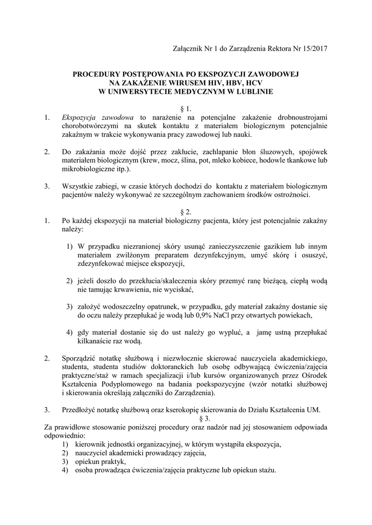 Załącznik Nr 1 do Zarządzenia Rektora Nr 15/2017 PROCEDURY POSTĘPOWANIA PO EKSPOZYCJI ZAWODOWEJ NA ZAKAŻENIE WIRUSEM HIV, HBV, HCV W UNIWERSYTECIE MEDYCZNYM W LUBLINIE 1. § 1. Ekspozycja zawodowa to narażenie na potencjalne zakażenie drobnoustrojami chorobotwórczymi na skutek kontaktu z materiałem biologicznym potencjalnie zakaźnym w trakcie wykonywania pracy zawodowej lub nauki. 2. Do zakażania może dojść przez zakłucie, zachlapanie błon śluzowych, spojówek materiałem biologicznym (krew, mocz, ślina, pot, mleko kobiece, hodowle tkankowe lub mikrobiologiczne itp.). 3. Wszystkie zabiegi, w czasie których dochodzi do kontaktu z materiałem biologicznym pacjentów należy wykonywać ze szczególnym zachowaniem środków ostrożności. 1. § 2. Po każdej ekspozycji na materiał biologiczny pacjenta, który jest potencjalnie zakaźny należy: 1) W przypadku niezranionej skóry usunąć zanieczyszczenie gazikiem lub innym materiałem zwilżonym preparatem dezynfekcyjnym, umyć skórę i osuszyć, zdezynfekować miejsce ekspozycji, 2) jeżeli doszło do przekłucia/skaleczenia skóry przemyć ranę bieżącą, ciepłą wodą nie tamując krwawienia, nie wyciskać, 3) założyć wodoszczelny opatrunek, w przypadku, gdy materiał zakaźny dostanie się do oczu należy przepłukać je wodą lub 0,9% NaCl przy otwartych powiekach, 4) gdy materiał dostanie się do ust należy go wypluć, a jamę ustną przepłukać kilkanaście raz wodą. 2. Sporządzić notatkę służbową i niezwłocznie skierować nauczyciela akademickiego, studenta, studenta studiów doktoranckich lub osobę odbywającą ćwiczenia/zajęcia praktyczne/staż w ramach specjalizacji i/lub kursów organizowanych przez Ośrodek Kształcenia Podyplomowego na badania poekspozycyjne (wzór notatki służbowej i skierowania określają załączniki do Zarządzenia). Przedłożyć notatkę służbową oraz kserokopię skierowania do Działu Kształcenia UM. § 3. Za prawidłowe stosowanie poniższej procedury oraz nadzór nad jej stosowaniem odpowiada odpowiednio: 1) kierownik jednostki organizacyjnej, w którym wystąpiła ekspozycja, 2) nauczyciel akademicki prowadzący zajęcia, 3) opiekun praktyk, 4) osoba prowadząca ćwiczenia/zajęcia praktyczne lub opiekun stażu. 3.
