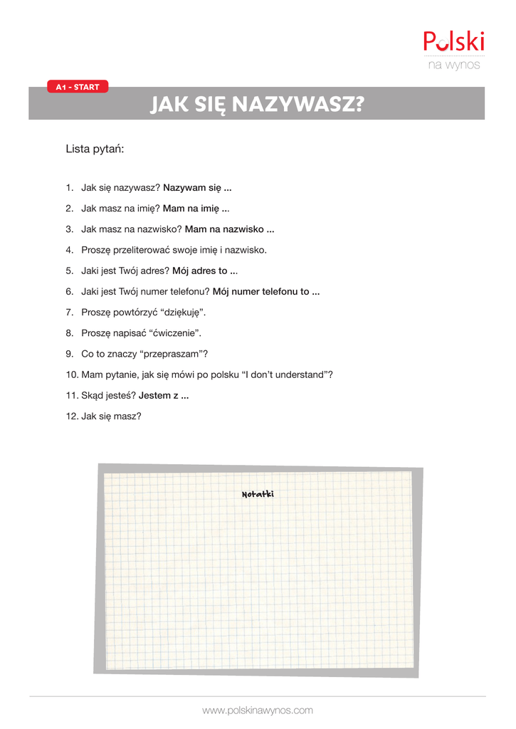 na wynos A1 - START JAK SIĘ NAZYWASZ? czerwiec Lista pytań: 1. Jak się nazywasz? Nazywam się ... 2. Jak masz na imię? Mam na imię ... 3. Jak masz na nazwisko? Mam na nazwisko ... 4. Proszę przeliterować swoje imię i nazwisko. 5. Jaki jest Twój adres? Mój adres to ... 6. Jaki jest Twój numer telefonu? Mój numer telefonu to ... 7. Proszę powtórzyć “dziękuję”. 8. Proszę napisać “ćwiczenie”. 9. Co to znaczy “przepraszam”? 10.Mam pytanie, jak się mówi po polsku “I don’t understand”? 11.Skąd jesteś? Jestem z ... 12.Jak się masz? Notatki www.polskinawynos.com