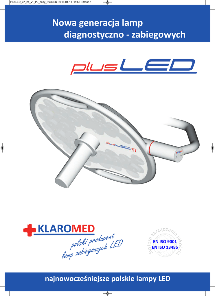 PlusLED_37_24_v1_PL_ceny_PlusLED 2016-04-11 11:52 Strona 1 ądzani a rz akością aj t n e c u d o r polski p wych LED o g e i b a z lamp S y st e m z Nowa generacja lamp diagnostyczno - zabiegowych EN ISO 9001 EN ISO 13485 najnowocześniejsze polskie lampy LED PlusLED_37_24_v1_PL_ceny_PlusLED 2016-04-11 11:52 Strona 2 Cechy lamp plusLED Wychodząc naprzeciw potrzebom jakie stawia nowoczesna chirurgia i każda z jej specjalności stworzyliśmy innowacyjne rozwiązanie jakim są lampy plusLED. Lampy dostarczają precyzyjnie światło wszędzie tam gdzie jest ono niezbędne. Homogeniczny charakter światła podnosi komfort pracy chirurga w każdym miejscu pola operacyjnego. Lampy plusLED cechuje niesłychanie niska emisja ciepła w kierunku pola operacyjnego. Podstawowym zadaniem lamp diagnostyczno - zabiegowych plusLED jest dokładne odwzorowanie spektrum pola operacyjnego a w szczególności kolorystyki czerwonej. Lampy diagnostyczno - zabiegowe plusLED doskonale odwzorowują kolory, współczynnik Ra wynosi 93. Najdrobniejsze niuanse struktury tkanki można dostrzec dzięki współczynnikowi barwy czerwonej - R9 równym 90. Wartość wpołczynnika R9 powyżej 90 znacznie ułatwia chirurgom i polepsza rozpoznawanie szczegółów. Spektrum kolorów pola operacyjnego jest renderowane w sposób naturalny. Delikatne i precyzyjne światło lampy plusLED jest przyjazne i bardzo komfortowe dla oczu operatora. Zastosowane w konstrukcji lampy operacyjnej plusLED białe diody LED są diodami piątej generacji o imponującej żywotności 50 000 godzin. Lampy plusLED są najlepszymi na rynku lampami w tej technologii. 2 PlusLED_37_24_v1_PL_ceny_PlusLED 2016-04-11 11:52 Strona 3 Sposób rozmieszczenia i umieszczenia poszczególnych diod LED wyposażonych w soczewki na matrycy w oprawie lampy emitujących jednorodne wiązki światła eliminuje cienie w polu operacyjnym. Takie rozwiązanie gwarantuje także homogenne oświetlenie pola operacyjnego o ciepłym, białym świetle i temperaturze barwowej 4 300 K. W trosce o zachowanie najwyższych standardów lampy diagnostyczno zabiegowe plusLED mogą posiadać inną temperaturę barwową. Inne wartości temperatury barwowej dostępne są opcjonalnie i ustalane w ścisłej współpracy z użytkownikiem i uwzględnieniem jego preferencji. 3 700 K 4 300 K 5 200 K Podstawową zaletą lamp diagnostyczno zabiegowych pluLED jest dwufunkcyjny, centralny uchwyt sterylny pozwalający operatorowi regulować nie tylko średnicę pola oświetlanego, ale także jego intensywność natężenia oświetlenia. To nowość w zakresie ergonomii pracy chirurga z zachowaniem jego sterylnej strefy obsługi. Nowa rodzina lamp plusLED cechuje łatwość obsługi, optymalnie dobrane natężenie oświetlenia i jego precyzyjna regulacja. Dzięki ergonomicznej konstrukcji pozycjonowanie lampy oświetlenie pola operacyjnego można wykonywać jedną ręką za pomocą centralnego uchwytu. Lampa plusLED 37 i 24 jest dostępna jako lampa mobilna, naścienna i sufitowa. 3 PlusLED_37_24_v1_PL_ceny_PlusLED 2016-04-11 11:52 Strona 4 Parametry techniczne lamp plusLED plusLED 37 w wersji sufitowej Nr kat. K00180 plusLED 37 w wersji mobilnej Nr kat. K00182 plusLED 37 w wersji naściennej Nr kat. K00181 Parametr plusLED 37 Ilość diod LED Dane ogólne Żywotność diod LED Średnica oprawy oświetleniowej Natężenie oświetlenia Ec w odległości 1 m Regulacja natężenia Parametry świetlne Średnica pola operacyjnego d10 Współczynnik odwzorowania barw Ra Współczynnik odwzorowania barw R9 Klasa ochrony IP wersja z inną temperaturą barwową światła dostępna jako opcja wersje z innym napięciem zasilania dostępne na zamówienie. Wszystkie wartości zgodne z EN 60601-2-41. Wszystkie podane parametry światła ± 10 %. EN ISO 9001 · EN ISO 13485 100 000 lx 60 000 lx 50 000 lx 220 mm 220 mm 220 mm 10 do 100 % 93 - - 1 000 mm - - 20 W (20 VA) 17 W (17 VA) +/- 40° < 0,5 °C ~230V, 50 Hz2 47 W (47 VA) 2 PL/04.04.2016 © KLAROMED Sp. z o. o. Wszelkie prawa zastrzeżone. 5% regulowane Napięcie zasilania Pobór mocy 340 mm 1 700 mm Przyrost temperatury w obrębie głowy Napięcie znamionowe oprawy >50 000 h 24 plusLED 24 eco 4 300 K (4 800 K1) Wgłębność oświetlenia (L1 + L2) przy 20% Ec Zakres regulcji w pionie plusLED 24 90 Temperatura barwowa Tc Oświetlenie endoskopowe 1 110 000 lx 220 do 300 mm Wgłębność oświetlenia (L1 + L2) przy 60% Ec Pozostałe parametry 37 plusLED 37 eco 30 W (30 VA) Dystrybutor: Odkryj rozwiązania KLAROMED on-line 24 V 42 KLAROMED Sp. z o. o. ul. Sobieskiego 123 05-070 Sulejówek tel. +48 22 299 30 40 fax +48 22 783 16 41 [email protected] Wszystkie informacje zawarte w tym dokumencie mogą ulec zmianie bez wcześniejszego powiadomienia. www.klaromed.pl