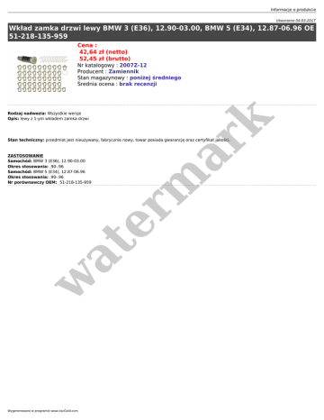 Informacje o produkcie Utworzono 04-03-2017 Wkład zamka drzwi lewy BMW 3 (E36), 12.90-03.00, BMW 5 (E34), 12.87-06.96 OE 51-218-135-959 Cena : 42,64 zł (netto) 52,45 zł (brutto) Rodzaj nadwozia: Wszystkie wersje Opis: lewy z 1-ym wkładem zamka drzwi er m ar k Nr katalogowy : 2007Z-12 Producent : Zamiennik Stan magazynowy : poniżej średniego Średnia ocena : brak recenzji Stan techniczny: przedmiot jest nieużywany, fabrycznie nowy, towar posiada gwarancję oraz certyfikat jakości. w at ZASTOSOWANIE Samochód: BMW 3 (E36), 12.90-03.00 Okres stosowania: .90-.96 Samochód: BMW 5 (E34), 12.87-06.96 Okres stosowania: .90-.96 Nr porównawczy OEM: 51-218-135-959 Wygenerowano w programie www.oscGold.com