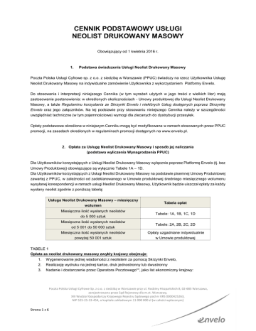 CENNIK PODSTAWOWY USŁUGI NEOLIST DRUKOWANY MASOWY Obowiązujący od 1 kwietnia 2016 r. 1. Podstawa świadczenia Usługi Neolist Drukowany Masowy Poczta Polska Usługi Cyfrowe sp. z o.o. z siedzibą w Warszawie (PPUC) świadczy na rzecz Użytkownika Usługę Neolist Drukowany Masowy na indywidualne zamówienie Użytkownika z wykorzystaniem Platformy Envelo. Do stosowania i interpretacji niniejszego Cennika (w tym wyrażeń użytych w jego treści z wielkich liter) mają zastosowanie postanowienia: w określonych okolicznościach - Umowy produktowej dla Usługi Neolist Drukowany Masowy, a także Regulaminu korzystania ze Skrzynki Envelo i niektórych Usług dostępnych poprzez Skrzynkę Envelo oraz jego załączników. Na tej podstawie przy stosowaniu niniejszego Cennika należy w szczególności uwzględniać techniczne (w tym pojemnościowe) wymogi dla zlecanych do dystrybucji przesyłek. Opłaty podstawowe określone w niniejszym Cenniku mogą być modyfikowane w ramach stosowanych przez PPUC promocji, na zasadach określonych w regulaminach promocji dostępnych na www.envelo.pl. 2. Opłata za Usługę Neolist Drukowany Masowy i sposób jej naliczania (podstawa wyliczenia Wynagrodzenia PPUC) Dla Użytkowników korzystających z Usługi Neolist Drukowany Masowy wyłącznie poprzez Platformę Envelo (tj. bez Umowy Produktowej) obowiązujące są wyłącznie Tabele 1A – 1D. Dla Użytkowników korzystających z Usługi Neolist Drukowany Masowy na podstawie pisemnej Umowy Produktowej zawartej z PPUC, w zależności od zadeklarowanego w Umowie produktowej średniego miesięcznego wolumenu wysyłanej korespondencji w ramach usługi Neolist Drukowany Masowy, Użytkownik będzie uiszczał opłaty za każdy wysłany neolist zgodnie z poniższą tabelą: Usługa Neolist Drukowany Masowy – miesięczny wolumen Miesięczna ilość wysłanych neolistów do 5 000 sztuk Miesięczna ilość wysłanych neolistów od 5 001 do 50 000 sztuk Tabela opłat Tabele: 1A, 1B, 1C, 1D Tabele: 2A, 2B, 2C, 2D Miesięczna ilość wysłanych neolistów Opłaty uzgadniane indywidualnie powyżej 50 001 sztuk w Umowie produktowej TABELE 1 Opłata za neolist drukowany masowy zwykły krajowy obejmuje: 1. Wygenerowanie jednej wiadomości z neolistem za pomocą Skrzynki Envelo, 2. 3. Realizację wydruku na jednej kartce, druk jednostronny lub dwustronny Nadanie i dostarczenie przez Operatora Pocztowego**, jako list ekonomiczny krajowy: Poczta Polska Usługi Cyfrowe Sp. z o.o. z siedzibą w Warszawie przy ul. Rodziny Hiszpańskich 8, 02-685 Warszawa, zarejestrowana przez Sąd Rejonowy dla m.st. Warszawy, XIII Wydział Gospodarczy Krajowego Rejestru Sądowego pod nr KRS 0000425263, NIP 525-25-33-454, o kapitale zakładowym 11 000 000 zł (w całości wpłaconym) Strona 1 z 6 Tabela 1A: Nazwa Usługi 4. Cena Kwota Cena netto VAT brutto neolist drukowany masowy wydruk czarno-biały 1,54 zł 0,35 zł 1,89 zł neolist drukowany masowy wydruk kolorowy 1,94 zł 0,45 zł 2,39 zł Możliwość skorzystania ze wskazanych opcji za dodatkową opłatą: Tabela 1B: neolist drukowany masowy – odrębne opcje płatne dodatkowo doliczane do cen z Tabeli 1A Cena netto Kwota VAT Cena brutto List priorytetowy krajowy 1,63 zł 0,37 zł 2,00 zł List ekonomiczny przesyłka zagraniczna 4,07 zł 0,93 zł 5,00 zł List priorytetowy przesyłka zagraniczna 5,69 zł 1,31 zł 7,00 zł Każda dodatkowa kartka, wydruk czarno-biały, druk jednostronny lub 0,12 zł 0,03 zł 0,15 zł wydruk kolorowy, druk jednostronny lub dwustronny, maksymalnie 5 dodatkowych kartek 0,53 zł 0,12 zł 0,65 zł Dopłaty do przesyłek zawierających więcej niż 6 Cena Kwota Cena kartek w jednej przesyłce. netto VAT brutto 0,74 zł 0,17 zł 0,91 zł 0,95 zł 0,22 zł 1,17 zł Dopłata do przesyłki krajowej o łącznej liczbie kartek od 69 do 98 szt. 1,65 zł 0,38 zł 2,03 zł Dopłata do przesyłki zagranicznej o łącznej liczbie kartek od 7 do 14 szt. 5,03 zł 1,16 zł 6,19 zł Dopłata do przesyłki zagranicznej o łącznej liczbie kartek od 15 do 68 szt. 5,14 zł 1,18 zł 6,32 zł 6,64 zł 1,53 zł 8,17 zł dwustronny, maksymalnie 5 dodatkowych kartek Każda dodatkowa kartka, Dopłata do przesyłki krajowej o łącznej liczbie kartek od 7 do 14 szt. Dopłata do przesyłki krajowej o łącznej liczbie kartek od 15 do 68 szt. Dopłata do przesyłki zagranicznej o łącznej liczbie kartek od 69 do 98 szt. Opłata za neolist drukowany masowy polecony krajowy obejmuje: 1. Wygenerowanie jednej wiadomości z neolistem za pomocą Skrzynki Envelo, 2. 3. Realizację wydruku na jednej kartce, druk jednostronny lub dwustronny Nadanie i dostarczenie przez Operatora Pocztowego**, jako list rejestrowany ekonomiczny krajowy: Poczta Polska Usługi Cyfrowe Sp. z o.o. z siedzibą w Warszawie przy ul. Rodziny Hiszpańskich 8, 02-685 Warszawa, zarejestrowana przez Sąd Rejonowy dla m.st. Warszawy, XIII Wydział Gospodarczy Krajowego Rejestru Sądowego pod nr KRS 0000425263, NIP 525-25-33-454, o kapitale zakładowym 11 000 000 zł (w całości wpłaconym) Strona 2 z 6 Tabela 1C: Nazwa Usługi 4. Cena Kwota Cena netto VAT brutto neolist drukowany masowy wydruk czarno-biały 4,23 zł 0,97 zł 5,20 zł neolist drukowany masowy wydruk kolorowy 4,76 zł 1,09 zł 5,85 zł Kwota Cena Możliwość skorzystania ze wskazanych opcji za dodatkową opłatą: Tabela 1D: neolist drukowany masowy – odrębne opcje płatne Cena dodatkowo doliczane do cen z Tabeli 1C netto VAT brutto List priorytetowy krajowy 3,09 zł 0,71 zł 3,80 zł Usługa zwrotne potwierdzenie odbioru dla przesyłek krajowych (ZPO) 1,63 zł 0,37 zł 2,00 zł List priorytetowy przesyłka zagraniczna* 16,10 zł 3,70 zł 19,80 zł Usługa zwrotne potwierdzenie odbioru dla przesyłek zagranicznych (ZPO) 3,25 zł 0,75 zł 4,00 zł 0,12 zł 0,03 zł 0,15 zł 0,53 zł 0,12 zł 0,65 zł Dopłaty do przesyłek zawierających więcej niż 6 Cena Kwota Cena kartek w jednej przesyłce. netto VAT brutto 0,74 zł 0,17 zł 0,91 zł Dopłata do przesy