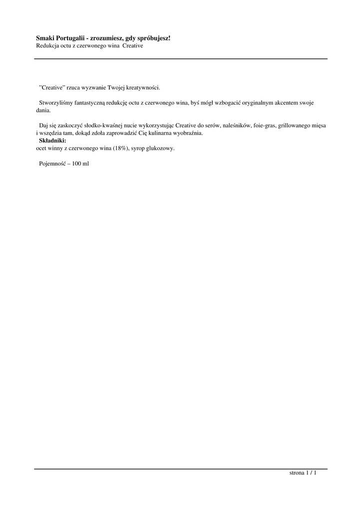 Smaki Portugalii - zrozumiesz, gdy spróbujesz! Redukcja octu z czerwonego wina Creative ”Creative” rzuca wyzwanie Twojej kreatywności. Stworzyliśmy fantastyczną redukcję octu z czerwonego wina, byś mógł wzbogacić oryginalnym akcentem swoje dania. Daj się zaskoczyć słodko-kwaśnej nucie wykorzystując Creative do serów, naleśników, foie-gras, grillowanego mięsa i wszędzia tam, dokąd zdoła zaprowadzić Cię kulinarna wyobraźnia. Składniki: ocet winny z czerwonego wina (18%), syrop glukozowy. Pojemność – 100 ml strona 1 / 1