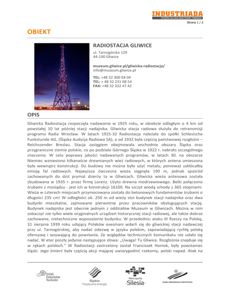 Strona 1 / 2 OBIEKT RADIOSTACJA GLIWICE ul. Tarnogórska 129 44-100 Gliwice muzeum.gliwice.pl/gliwicka-radiostacja/ [email protected] TEL: +48 32 300 04 04 TEL: + 48 32 231 08 54 FAX: +48 32 332 47 42 OPIS Gliwicka Radiostacja rozpoczęła nadawanie w 1925 roku, w obiekcie odległym o 4 km od powstałej 10 lat później stacji nadajnika. Gliwicka stacja radiowa służyła do retransmisji programu Radia Wrocław. W latach 1925-32 Radiostacja należała do spółki Schlesische Funkstunde AG, (Śląska Audycja Radiowa SA), a od 1932 była częścią państwowej rozgłośni – Reichssender Breslau. Stacja zasięgiem obejmowała wschodnie obszary Śląska oraz przygraniczne ziemie polskie, co po podziale Górnego Śląska w 1922 r. nabrało szczególnego znaczenia. W celu poprawy jakości nadawanych programów, w latach 30. na obszarze Niemiec wzniesiono kilkanaście drewnianych wież radiowych, w których antena umieszona była wewnątrz konstrukcji. Do budowy nie można było użyć metalu, ponieważ zakłócałby emisję fal radiowych. Najwyższa ówczesna wieża sięgnęła 190 m, jednak spośród zachowanych do dziś prymat dzierży ta w Gliwicach. Gliwicka wieża antenowa została zbudowana w 1935 r. przez firmę Lorenz. Użyto drewna modrzewiowego. Belki połączono śrubami z mosiądzu - jest ich w konstrukcji 16100. Na szczyt wiodą schody z 365 stopniami. Wieża w czterech miejscach przymocowana została do betonowych fundamentów śrubami o długości 235 cm! W odległości ok. 250 m od wieży stoi budynek stacji nadajnika oraz dwa budynki mieszkalne, zajmowane pierwotnie przez pracowników obsługujących stację. Budynek nadajnika jest obecnie jednym z oddziałów Muzeum w Gliwicach. Można w nim zobaczyć nie tylko wiele oryginalnych urządzeń historycznej stacji radiowej, ale także dobrze zachowane, nietechniczne wyposażenie budynku. W przededniu ataku III Rzeszy na Polskę, 31 sierpnia 1939 roku udający Polaków esesmani wdarli się do gliwickiej stacji nadawczej przy ul. Tarnogórskiej, aby nadać odezwę w języku polskim, zapowiadającą rychłą polską ofensywę i wzywającą do powstania. Ze względów technicznych komunikatu nie udało się nadać. W eter poszły jedynie następujące słowa: „Uwaga! Tu Gliwice. Rozgłośnia znajduje się w rękach polskich.” W Radiostacji zastrzelony został Franciszek Honiok, były powstaniec śląski. Jego śmierć była częścią akcji mającej uwiarygodnić rzekomy, polski napad. Atak na Strona 2 / 2 gliwicką Radiostację był fragmentem planu, który obejmował szereg prowokacji granicznych nie tylko na Górnym Śląsku, ale także na Pomorzu i w Wielkopolsce. Prowokacje te wykorzystano w propagandowych komunikatach radiowych i prasowych. Stały się uzasadnieniem agresji III Rzeszy wobec Polski, którą obarczono winą za rozpoczęcie wojny. Obecnie wieża antenowa wraz z trzema budynkami, które razem tworzą zabytkowy kompleks Radiostacji, stanowi własność miasta. Budynek nadajnika od 2005 roku jest oddziałem Muzeum w Gliwicach. Można w nim zobaczyć oryginalne wyposażenie stacji, a także film o prowokacji gliwickiej. Radiostacja Gliwice znajduje się na Szlaku Zabytków Techniki. Kronika Szlakowa Gliwickie Muzeum znajduje się przy wieży radiostacji, która stanowi najwyższą wolno stojącą drewnianą konstrukcję w Europie. Budowę wieży ukończono 75 lat temu. Obiekt wybudowany został z bali z impregnowanego drewna modrzewiowego, łączonego przy pomocy ponad 16 tys. mosiężnych śrub. Co ciekawe, w konstrukcji nie użyto ani jednego stalowego gwoździa. PROGRAM 11.06.2016 15:00 - 18:00 15:00 - 18:00 15:00 - 19:30 15:00 - 20:00 15:00 - 20:00 17:00 - 18:00 Radiostacja w szczegółach – gra terenowa Kolorowanki i quiz Uwaga! Tu Gliwice – emisja filmu Magiczne oko. Pierwsze odbiorniki radiowe przeznaczone dla masowego odbiorcy – wystawa Radioreaktywacja – warsztaty i pokazy Akademickiego Klubu Krótkofalowców SP9PDF Budujemy wieżę – warsztaty