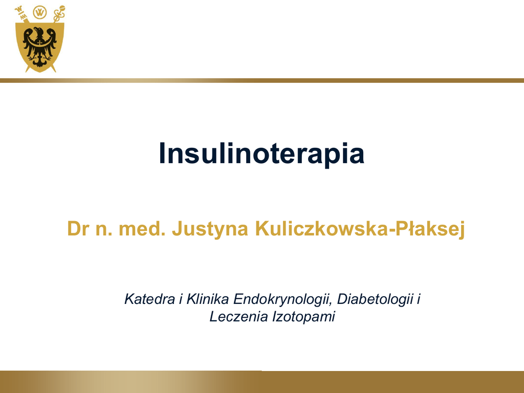 Insulinoterapia Dr n. med. Justyna Kuliczkowska-Płaksej Katedra i Klinika Endokrynologii, Diabetologii i Leczenia Izotopami Rys historyczny odkrycie insuliny - 1922 r. Frederick Banting (Nobel) i Charles Best • 1958 r. – ustalenie sekwencji aminokwasowej insuliny (Frederick Sanger, Nobel) • 1963 r. – synteza chemiczna insuliny ostatnie modyfikacje wydłużenie działania przez zastosowanie zawiesiny produkcja przez zmodyfikowane genetycznie bakterie (E. coli) i drożdże syntetyczne analogi ludzkiej insuliny • Rodzaje insulin krótkodziałające o przedłużonym działaniu mieszanki dwufazowe analogi insuliny ludzkiej szybkodziałające długodziałające mieszanki insulin analogowych Krótkodziałające podawane: podskórnie, dożylnie, domięśniowo wszystkie typy cukrzycy i sytuacje wymagające szybkiego ↓ glikemii podaż 30 min. przed posiłkiem szczyt działania po 2-3 h czas działania 6-8 h O przedłużonym działaniu insulina izofanowa (NPH) podawana tylko podskórnie opóźniony początek działania – po 90 min. szczyt działania po 4-6 h czas działania 20 h Mieszanki dwufazowe zawierające insulinę ludzką insulina krótkodziałająca + insulina izofanowa podawane podskórnie podaż 30 min. przed posiłkiem głównie – cukrzyca typu 2, dwa wstrzyknięcia (śniadanie, kolacja) Dostępne preparaty dwufazowych mieszanek insulin Nazwa preparatu Komponenta krótkodziałająca (%) Komponenta długodziałająca (%) Gensulin M30 Gensulin M40 Gensulin M50 Humulin M3 Insuman Comb 25 Mixtard 30 Mixtard 40 Mixtard 50 Polhumin Mix-2 Polhumin Mix-3 Polhumin Mix-4 Polhumin Mix-5 30 40 50 30 25 30 40 50 20 30 40 50 70 60 50 70 75 70 60 50 80 70 60 50 Szybkodziałające analogi szybsze wchłanianie szybszy początek i krótszy czas działania podaż podskórnie tuż przed posiłkiem (≤ 15 min. przed posiłkiem) (wyjątkowo w trakcie lub po posiłku) • • • • preparaty analogów insuliny Insulina lispro Insulina aspart Insulina glulizynowa www.endotext.org Szybkodziałające analogi Insulina lispro pierwszy dostępny analog (1996 r.) zamiana miejsc 2 aminokwasów: lizyny w poz. 28 i proliny w poz. 29 regionu B Insulina aspart zastąpienie proliny w poz. 29 regionu B kwasem asparaginowym Insulina glulizynowa kwas asparaginowy w poz. 3 regionu B zastąpiono lizyną oraz lizynę w poz. 29 regionu B kwasem glutaminowym początek działania 15 min. po podaniu podskórnym szczyt działania po 30-60 min. (aspart po 1-3 h) zanik działania po 3-5 h Porównanie analogów z insuliną krótkodziałającą • szybsze wchłanianie analogów i wyższe stężenia → lepsza kontrola glikemii poposiłkowej • mniejsza częstość hipoglikemii nocnych • możliwość wstrzykiwania tuż przed, w trakcie, po posiłku → większa elastyczność i komfort życia • nie wykazano istotnej statystycznie różnicy w zmniejszeniu ryzyka incydentów sercowonaczyniowych lub zapobieganiu wystąpienia powikłań cukrzycy • wada – zbyt krótkie działanie Długodziałające analogi insuliny stała szybkość wchłaniania brak szczytu działania czas działania 24 h można podawać raz dziennie nie wolno podawać dożylnie !!! insulina glarginowa insulina detemir Degludec – dostępna w Wlk Brytanii www.endotext.org Insulina glarginowa zamiana kwasu asparaginowego na glicynę w poz. 21 łańcucha A i dołączenie dwóch cząsteczek argininy do C-końca łańcucha B brak szczytu działania czas działania 24 h raz na dobę o dowolnej porze (codziennie ta sama) Insulina detemir przyłączenie do lizyny w poz. 29 łańcucha B bocznego łańcucha kwasu mirystynowego (długołańcuchowy kwas tłuszczowy) oraz usunięcie treoniny z poz. 30 łańcucha B raz lub dwa razy na dobę brak szczytu działania podaż zawsze o tej samej porze Porównanie analogów długodziałających z NPH NPH - zbyt krótki czas działania, szczyt działania powoduje zmienne stężenie w ciągu doby analogi długodziałające - porównywalne ↓ HbA1C przy mniejszej częstości hipoglikemii nocnych Mieszanki insulin analogowych insulina lispro/aspart + insulina lispro/aspart w zawiesinie cukrzyca typu 2, zazwyczaj dwa wstrzyknięcia (śniadanie, kolacja) mogą być podawane tuż przed posiłkiem Mieszanki insulin analogowych Nazwa handlowa Skład Pocz. dział. (min.) Szczyt dział. (h) Dł. dział. (h) Humalog Mix 25 25% lispro w rozwtorze obojętnym/75% lispro w zawiesinie 15 1-2/4-8 10-16 Humalog Mix 50 50% lispro w roztworze obojetnym/50% lispro w zawiesinie 15 1-2/4-8 10-16 NovoMix 30 30% aspart w roztworze obojętnym/70% aspart w zawiesinie 15 1-2/4-8 10-16 NovoMix 50 50% aspart w roztworze obojętnym/50% aspart w zawiesinie 15 1-2/4-8 10-16 Novomix 70 (niedostępny w Polsce) 70% aspart w roztworze obojętnym/30% aspart w zawiesinie 15 1-2/4-8 10-16 Wskazania do insulinoterapii lek pierwszego rzutu: cukrzyca typu 1 LADA cukrzyca w mukowiscydozie ciąża cukrzyca związana z endokrynopatiami i lekami diabetogennymi (glikokortykosteroidy) życzenie pacjenta LADA + otyłość/nadwaga – korzystne kojarzenie insuliny z metforminą Wskazania do insulinoterapii w cukrzycy typu 2 czasowa insulinoterapia (możliwość powrotu do typowego algorytmu): • glikemia≥300 mg/dl + objawy hiperglikemii • uraz, choroba (ciężka infekcja) lub leki (glikokortykosteroidy) wywołujące znaczną hiperglikemię • zabiegi chirurgiczne - okres okołooperacyjny • ostry zespół wieńcowy/angioplastyka tętnic wieńcowych • udar mózgu • inne schorzenia wymagające hospitalizacji na oddziale intensywnej opieki medycznej • ciąża i okres karmienia piersią Wskazania do insulinoterapii trwała insulinoterapia w cukrzycy typu 2 • wtórna nieskuteczność leków doustnych (HbA1C > 7% mimo max. dawek 2-3 leków przeciwcukrzycowych) mimo intensyfikacji terapii behawioralnej • nietolerancja doustnych leków przeciwcukrzycowych leczenie skojarzone (leki doustne/inkretyny + insulina) w cukrzycy typu 2 kilkakrotne stwierdzenie utr