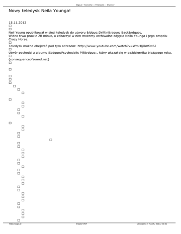 Gigs.pl - Koncerty :: Festiwale :: Imprezy Nowy teledysk Neila Younga! 15.11.2012 Neil Young opublikował w sieci teledysk do utworu “Driftin’ Back”. Wideo trwa prawie 28 minut, a zobaczyć w nim możemy archiwalne zdjęcia Neila Younga i jego zespołu Crazy Horse. Teledysk można obejrzeć pod tym adresem: http://www.youtube.com/watch?v=WmHljOmSw6I Utwór pochodzi z albumu „Psychedelic Pill”, który ukazał się w październiku bieżącego roku. (consequenceofsound.net) http://gigs.pl Kreator PDF Utworzono 4 March, 2017, 05:41 Gigs.pl - Koncerty :: Festiwale :: Imprezy http://gigs.pl Kreator PDF Utworzono 4 March, 2017, 05:41
