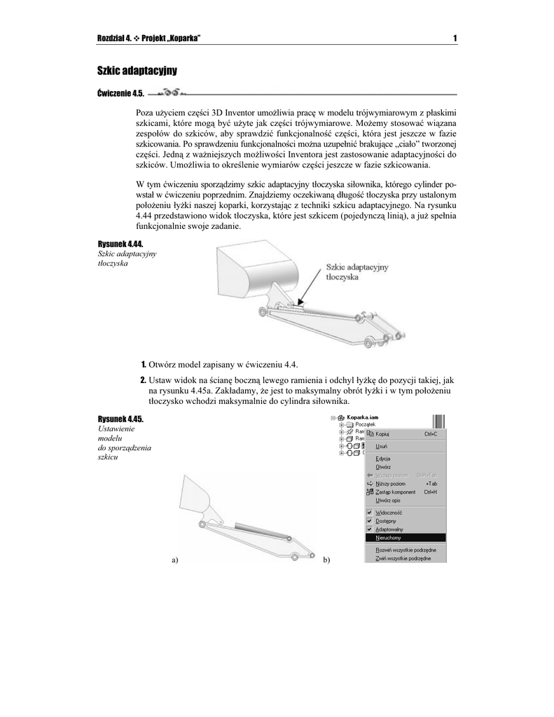 Rozdział 4. Projekt „Koparka” 1 Szkic adaptacyjny Ćwiczenie 4.5. Poza użyciem części 3D Inventor umożliwia pracę w modelu trójwymiarowym z płaskimi szkicami, które mogą być użyte jak części trójwymiarowe. Możemy stosować wiązana zespołów do szkiców, aby sprawdzić funkcjonalność części, która jest jeszcze w fazie szkicowania. Po sprawdzeniu funkcjonalności można uzupełnić brakujące „ciało” tworzonej części. Jedną z ważniejszych możliwości Inventora jest zastosowanie adaptacyjności do szkiców. Umożliwia to określenie wymiarów części jeszcze w fazie szkicowania. W tym ćwiczeniu sporządzimy szkic adaptacyjny tłoczyska siłownika, którego cylinder powstał w ćwiczeniu poprzednim. Znajdziemy oczekiwaną długość tłoczyska przy ustalonym położeniu łyżki naszej koparki, korzystając z techniki szkicu adaptacyjnego. Na rysunku 4.44 przedstawiono widok tłoczyska, które jest szkicem (pojedynczą linią), a już spełnia funkcjonalnie swoje zadanie. Rysunek 4.44. Szkic adaptacyjny tłoczyska 1. Otwórz model zapisany w ćwiczeniu 4.4. 2. Ustaw widok na ścianę boczną lewego ramienia i odchyl łyżkę do pozycji takiej, jak na rysunku 4.45a. Zakładamy, że jest to maksymalny obrót łyżki i w tym położeniu tłoczysko wchodzi maksymalnie do cylindra siłownika. Rysunek 4.45. Ustawienie modelu do sporządzenia szkicu a) b) 2 Inventor. Ćwiczenia praktyczne 3. Zablokuj położenie łyżki, co ułatwi nam określenie długości tłoczyska. Kliknij prawym przyciskiem w przeglądarce wpis Łyżka i w menu kursora wybierz pozycję Nieruchomy (Grounded), jak na rysunku 4.45b. 4. Utwórz nowy komponent o nazwie Tłoczysko, postępując podobnie jak poprzednio przy tworzeniu nowych części. Wskaż położenie nowej części nad modelem koparki. 5. Narysuj szkic tłoczyska składający się z jednej krótkiej linii, jak na rysunku 4.46a. Rysunek 4.46. Szkic tłoczyska Nasz szkic nie ma żadnego wymiaru. Po narysowaniu linii zakończ szkic. Ustaw cały model w widoku izometrycznym, jak na rysunku 4.46b. Aby szkic zachowywał się jak model trójwymiarowy, wprowadzimy do niego oś konstrukcyjną, która będzie stanowić oś obrotu dla zamocowania szkicu w końcówce łyżki. 6. Wstaw oś konstrukcyjną. Kliknij przycisk Oś konstrukcyjna (Work Axis) znajdujący się wśród narzędzi do tworzenia elementów kształtujących. Następnie kliknij punkt końcowy szkicu oznaczony cyfrą 1 na rysunku 4.46b, a na koniec kliknij wpis Szkic1 (Sketch1) w przeglądarce. Program utworzy oś konstrukcyjną, jak na rysunku 4.47a. Rysunek 4.47. Oś konstrukcyjna i włączenie adaptacyjności szkicu a) b) 7. Włącz adaptacyjność dla tego szkicu. Należy kliknąć prawym przyciskiem wpis Szkic1 (Sketch1), a w przeglądarce i w menu wybrać pozycję Adaptacyjny (Adaptive), jak na rysunku 4.47b. Oznaczenie adaptacyjności zostanie automatycznie zastosowane do całej części Tłoczysko. Nasza część została ukończona. Teraz należy ustawić tłoczysko we właściwym miejscu, korzystając z wiązań zespołów. Zastosujemy trzy wiązania zestawiające. Pierwsze wiązanie ustawi oś konstrukcyjną w osi końcówki łyżki, drugie wiązanie ustawi szkic w osi cylindra, a trzecie wiązanie zestawi punkt końcowy szkicu z powierzchnią dna cylindra, co spowoduje dopasowanie długości szkicu. Rozdział 4. Projekt „Koparka” 3 8. Zakończ modelowanie części i przejdź do poziomu zespołu głównego. Kliknij przycisk Powrót (Return), znajdujący się nad ekranem graficznym. Program zakończy edycję części i powróci do poziomu zespołu głównego. 9. Zastosuj wiązania. Wprowadź pierwsze wiązanie zestawiające oś konstrukcyjną szkicu, oznaczoną cyfrą 1 na rysunku 4.48a, z osią końcówki łyżki, oznaczoną cyfrą 2 na rysunku 4.48a. Wprowadź drugie wiązanie zestawiające linię szkicu, oznaczoną cyfrą 3 na rysunku 4.48b z osią cylindra, oznaczoną cyfrą 4 na rysunku 4.48b. Rysunek 4.48. Dwa pierwsze wiązania ustawiające szkic względem pozostałych komponentów Po zastosowaniu tych wiązań położenie szkicu tłoczyska będzie takie, jak na rysunku 4.49a. Rysunek 4.49. Obiekty dla trzeciego wiązania Do utworzenia trzeciego wiązania konieczne będzie wyłączenie renderingu, aby łatwiej było wskazać dno cylindra. Przełączenia sposobu wyświetlania można dokonać w każdej chwili, także podczas działania innego polecenia. Wprowadź trzecie wiązanie zestawiające punkt końcowy linii szkicu, oznaczony cyfrą 1 na rysunku 4.49a, z powierzchnią dna cylindra wyróżnioną i oznaczoną cyfrą 2 na rysunku 4.49b. Aby wybrać punkt końcowy, należy kliknąć w okolicy końca linii szkicu i nacisnąć prawy przycisk myszki, a następnie w menu wybrać pozycję Wybierz ukryte (Select Other) i przełączać strzałki, aż program wyróżni na czerwono punkt końcowy linii. Zatwierdzenie wyboru nastąpi przez wskazanie prostokąta znajdującego się między strzałkami. Aby wybrać powierzchnię dna cylindra, należy kliknąć punkt oznaczony cyfrą 2 na rysunku 4.49b, tak aby punkt wyboru znajdował się w obrębie krawędzi dna cylindra. Program domyślnie wyznaczy oś cylindra, lecz należy nacisnąć prawy przycisk myszki, a następnie w menu wybrać pozycję Wybierz ukryte (Select Other) i przełączać strzałki, aż program wyróżni na czerwono powierzchnię dna cylindra. Zatwierdzenie wyboru nastąpi przez wskazanie prostokąta znajdującego się między strzałkami. 4 Inventor. Ćwiczenia praktyczne Po zatwierdzeniu wiązań program wydłuży linię szkicu, adaptując jej długość do narzuconych warunków geometrycznych, jak na rysunku 4.50. Rysunek 4.50. Długość szkicu po dopasowaniu adaptacyjnym Można już powrócić do wyświetlania modelu w trybie renderingu oraz wyłączyć widoczność osi konstrukcyjnej szkicu tłoczyska. 10. Zapisz projekt. Zakończyliśmy ćwiczenie. Sterowanie wiązaniami i wykrywanie kol