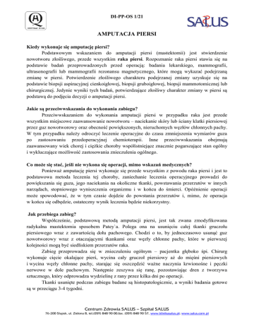 DI-PP-OS 1/21 AMPUTACJA PIERSI Kiedy wykonuje się amputację piersi? Podstawowym wskazaniem do amputacji piersi (mastektomii) jest stwierdzenie nowotworu złośliwego, przede wszystkim raka piersi. Rozpoznanie raka piersi stawia się na podstawie badań przeprowadzonych przed operacją: badania lekarskiego, mammografii, ultrasonografii lub mammografii rezonansu magnetycznego, które mogą wykazać podejrzaną zmianę w piersi. Potwierdzenie złośliwego charakteru podejrzanej zmiany uzyskuje się na podstawie biopsji aspiracyjnej cienkoigłowej, biopsji gruboigłowej, biopsji mammotomicznej lub chirurgicznej. Jedynie wyniki tych badań, potwierdzające złośliwy charakter zmiany w piersi są podstawą do podjęcia decyzji o amputacji piersi. Jakie są przeciwwskazania do wykonania zabiegu? Przeciwwskazaniem do wykonania amputacji piersi w przypadku raka jest przede wszystkim miejscowe zaawansowanie nowotworu – naciekanie skóry lub ściany klatki piersiowej przez guz nowotworowy oraz obecność powiększonych, nieruchomych węzłów chłonnych pachy. W tym przypadku należy odroczyć leczenie operacyjne do czasu zmniejszenia wymiarów guza po zastosowaniu przedoperacyjnej chemioterapii. Inne przeciwwskazania obejmują zaawansowany wiek chorej i ciężkie choroby współistniejące znacznie pogarszające stan ogólny i wykluczające możliwość zastosowania znieczulenia ogólnego. Co może się stać, jeśli nie wykona się operacji, mimo wskazań medycznych? Ponieważ amputację piersi wykonuje się przede wszystkim z powodu raka piersi i jest to podstawowa metoda leczenia tej choroby, zaniechanie leczenia operacyjnego prowadzi do powiększania się guza, jego naciekania na okoliczne tkanki, powstawania przerzutów w innych narządach, stopniowego wyniszczenia organizmu i w końcu do śmierci. Opóźnienie operacji może spowodować, że w tym czasie dojdzie do powstania przerzutów i, mimo, że operacja w końcu się odbędzie, ostateczny wynik leczenia będzie niekorzystny. Jak przebiega zabieg? Współcześnie, podstawową metodą amputacji piersi, jest tak zwana zmodyfikowana radykalna mastektomia sposobem Patey`a. Polega ona na usunięciu całej tkanki gruczołu piersiowego wraz z zawartością dołu pachowego. Chodzi o to, by jednoczasowo usunąć guz nowotworowy wraz z otaczającymi tkankami oraz węzły chłonne pachy, które w pierwszej kolejności mogą być siedliskiem przerzutów raka. Zabieg przeprowadza się w znieczuleniu ogólnym – pacjentka głęboko śpi. Chirurg wykonuje cięcie okalające pierś, wycina cały gruczoł piersiowy aż do mięśni piersiowych i wycina węzły chłonne pachy, starając się oszczędzić ważne naczynia krwionośne i pęczki nerwowe w dole pachowym. Następnie zeszywa się ranę, pozostawiając dren z tworzywa sztucznego, który odprowadza wydzielinę z rany przez kilka dni po operacji. Tkanki usunięte podczas zabiegu badane są histopatologicznie, a wyniki badania gotowe są w przeciągu 3-4 tygodni. Centrum Zdrowia SALUS – Szpital SALUS 76-200 Słupsk, ul. Zielona 8, tel.(059) 848 90 00,fax. (059) 848 90 57, www.klinikasalus.pl; www.salus.com.pl DI-PP-OS 1/21 Przebieg pooperacyjny. Po zabiegu operacyjnym pacjentka najczęściej powraca na swoją salę, jedynie w wyjątkowej sytuacji wymagać może dłuższego pobytu na sali pooperacyjnej lub w oddziale intensywnej opieki medycznej. Po zbiegu pacjentami opiekuje się pielęgniarka dyżurna, do niej należy zwracać się w przypadku dolegliwości, bólów, chęci wstania z łóżka itp. Ponadto w oddziale szpitalnym jest lekarz dyżurny, który interweniuje w nagłych przypadkach. W przypadkach niepowikłanych pacjentka może pić i jeść już w ciągu pierwszych 24 godzin po zabiegu operacyjnym Następnego dnia po operacji pacjentka powinna zacząć siadać na łóżku, a następnie wstawać i chodzić, choć zwykle pierwszy spacer po zabiegu powinien odbyć się pod opieką pielęgniarki lub członka rodziny. Ponadto już w tym dniu należy rozpoczynać ćwiczenia rehabilitacyjne w celu usprawniania kończyny górnej po stronie operowanej i zachowania prawidłowej postawy ciała po amputacji piersi. Pobyt w szpitalu po operacji trwa zazwyczaj 3-4 doby. Codziennie odbywa się wizyta chirurga, który przeprowadzał zabieg, zmieniane są opatrunki i kontrolowany jest przebieg gojenia się rany. Przed wyjściem do domu najczęściej usuwany jest dren z rany pooperacyjnej, choć zdarza się, że pacjentki wypisywane są do domu z drenem i jest on usuwany w poradni ambulatoryjnie. W takim przypadku pacjentka jest instruowana, jak obchodzić się z drenem w domu. W dniu wypisu pacjentka otrzymuje kartę informacyjną, recepty na potrzebne leki, dodatkowe ustne zalecenia od operatora oraz w razie potrzeby zwolnienie z pracy. Ponadto skierowanie do poradni rehabilitacyjnej w celu kontynuowania procesu rehabilitacji. Ma też wyznaczony termin kontrolnej wizyty u lekarza, który ją operował. Jak postępować po wyjściu ze szpitala? Przed operacją pacjentka powinna zapewnić sobie transport do domu – nie powinna prowadzić samochodu ani jechać środkami transportu publicznego. Powinna mieć zapewnioną opiekę bliskich w ciągu pierwszej doby po wypisaniu. Należy zrealizować przepisane recepty i przyjmować leki zgodnie z zaleceniami lekarza. Opatrunki należy zmieniać codziennie przemywając rany środkami odkażającymi (woda utleniona, octenisept, spirytus) i utrzymywać je w czystości. Można brać prysznic obmywając okolicę rany delikatnie i osuszać ją po kąpieli czystym ręcznikiem. W przypadku zaczerwienienia, bólu i obrzęku rany pooperacyjnej oraz gorączki, należy skontaktować się z lekarzem. Po około 9-10 dniach w poradni chirurgicznej zdejmuje się szwy i kontroluje gojenie. Regułą jest, że po usunięciu drenu, w ranie zbiera się płyn surowiczy, który co kilka dni musi być usuwany przez punkcję. Po kilku punkcjach płyn przestaje się zbierać i ran