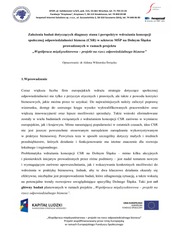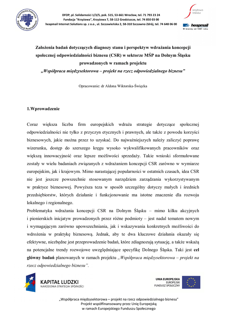 DFOP, pl. Solidarności 1/3/5, pok. 515, 53-661 Wrocław, tel. 71 793 23 24 Fundacja "Krzyżowa", Krzyżowa 7, 58-112 Grodziszcze, tel. 74 850 03 00 heapmail Internet Solutions sp. z o.o., ul. Szczawieńska 2, 58-310 Szczawno Zdrój, tel. 74 648 06 00 Założenia badań dotyczących diagnozy stanu i perspektyw wdrażania koncepcji społecznej odpowiedzialności biznesu (CSR) w sektorze MŚP na Dolnym Śląsku prowadzonych w ramach projektu „Współpraca międzysektorowa – projekt na rzecz odpowiedzialnego biznesu” Opracowanie: dr Aldona Wiktorska-Święcka 1.Wprowadzenie Coraz większa liczba firm europejskich wdraża strategie dotyczące społecznej odpowiedzialności nie tylko z przyczyn etycznych i prawnych, ale także z powodu korzyści biznesowych, jakie można przez to uzyskać. Do najważniejszych należy zaliczyć poprawę wizerunku, dostęp do szerszego kręgu wysoko wykwalifikowanych pracowników oraz większą innowacyjność oraz lepsze możliwości sprzedaży. Takie wnioski sformułowane zostały w wielu badaniach związanych z wdrażaniem koncepcji CSR zarówno w wymiarze europejskim, jak i krajowym. Mimo narastającej popularności w ostatnich czasach, idea CSR nie jest jeszcze powszechnie stosowanym narzędziem zarządzania wykorzystywanym w praktyce biznesowej. Powyższa teza w sposób szczególny dotyczy małych i średnich przedsiębiorstw, których działanie i funkcjonowanie ma istotne znaczenie dla rozwoju lokalnego i regionalnego. Problematyka wdrażania koncepcji CSR na Dolnym Śląsku – mimo kilku akcyjnych i pionierskich inicjatyw prowadzonych przez różne podmioty – jest nadal tematem nowym i wymagającym zarówno upowszechniania, jak i wskazywania konkretnych możliwości do wdrożenia w praktykę biznesową. Jednak, aby te dwa kluczowe działania okazały się efektywne, niezbędne jest przeprowadzenie badań, które zdiagnozują sytuację, a także wskażą na potencjalne trendy rozwojowe uwzględniające specyfikę Dolnego Śląska. Taki jest cel główny badań planowanych w ramach projektu „Współpraca międzysektorowa – projekt na rzecz odpowiedzialnego biznesu”. „Współpraca międzysektorowa – projekt na rzecz odpowiedzialnego biznesu” Projekt współfinansowany przez Unię Europejską w ramach Europejskiego Funduszu Społecznego DFOP, pl. Solidarności 1/3/5, pok. 515, 53-661 Wrocław, tel. 71 793 23 24 Fundacja "Krzyżowa", Krzyżowa 7, 58-112 Grodziszcze, tel. 74 850 03 00 heapmail Internet Solutions sp. z o.o., ul. Szczawieńska 2, 58-310 Szczawno Zdrój, tel. 74 648 06 00 2. Podstawowe założenia i harmonogram badań Planowane dla celów projektu badanie składać się będzie z dwóch etapów i opierać na dwóch ogólnych metodologiach ankietowych. Najpierw zostanie przeprowadzone badanie polegające na kwerendzie danych zastanych w kontekście regionu Dolnego Śląska i MŚP (styczeń – luty 2011), które następnie zostanie pogłębione dzięki badaniom ankietowym (część A: badanie rzeczywistych potrzeb MŚP w kontekście prowadzenia działań CSR: luty-marzec 2011 oraz część B: badania fokusowe na grupie 50 przedstawicieli MŚP i organizacji pozarządowych w kontekście identyfikacji obszarów wdrażania i upowszechniania inicjatyw CSR: marzeckwiecień 2011). Takie postępowanie umożliwi – po opracowaniu wniosków i sformułowaniu rekomendacji – na opracowanie innowacyjnego narzędzia oraz opracowanie strategii wdrażania koncepcji CSR uwzględniających zarówno stan i potrzeby kluczowych interesariuszy projektu, jak i specyfikę rozwoju regionalnego Dolnego Śląska. 3. Założenia merytoryczne i narzędzia planowanych badań Pierwszy etap badań (kwerenda danych zastanych) będzie polegał na dotarciu i twórczej refleksji dotyczącej wiedzy związanej z przedmiotem badań. W tym celu weryfikacji poddane zostaną informacje udostępniane publicznie, uwzględniające zarówno tradycyjne źródła wiedzy (publikacje), jak i nowe (Internet), odnoszące się do treści teoretyczno-modelowych (wiedza naukowa), jak i pragmatycznych (wiedza empiryczna). Drugi etap postępowania – badania ankietowe – prowadzone będą z udziałem przedstawicieli sektora MŚP na Dolnym Śląsku. W tym celu opracowane zostanie narzędzie, które – za pośrednictwem organizacji pracodawców w regionie (m.in. Dolnośląska Izba Gospodarcza, Zachodniej Izby Gospodarczej, Związków Pracodawców RP) – zostanie przekazane grupie badawczej (ok. 100 podmiotów). Kwestionariusz uwzględniał będzie kluczowe z punktu widzenia istoty CSR obszary badania i będzie miał na celu: ocenę poglądów i świadomości dotyczącej koncepcji CSR w miejscu pracy; „Współpraca międzysektorowa – projekt na rzecz odpowiedzialnego biznesu” Projekt współfinansowany przez Unię Europejską w ramach Europejskiego Funduszu Społecznego DFOP, pl. Solidarności 1/3/5, pok. 515, 53-661 Wrocław, tel. 71 793 23 24 Fundacja "Krzyżowa", Krzyżowa 7, 58-112 Grodziszcze, tel. 74 850 03 00 heapmail Internet Solutions sp. z o.o., ul. Szczawieńska 2, 58-310 Szczawno Zdrój, tel. 74 648 06 00 stwierdzenie stopnia powszechności CSR oraz praktyk w sektorze biznesowym, jak również długości czasu ich stosowania; poznanie poglądów firm na temat faktycznych i postrzeganych korzyści dla ich działalności, płynących z realizacji podejścia ukierunkowanego na CSR; rozpoznanie głównych przeszkód i barier, które uniemożliwiają firmom podejmowanie działań na rzecz wdrażania koncepcji CSR. W związku z tym w ramach badania zostaną zadane pytania dotyczące głównych trudności, jakich firmy mogą doświadczać w tym zakresie oraz poproszone o zaproponowanie praktycznych sposobów pokonania tych problemów. Drugie badanie pogłębione – panel fokusowy - zostanie przeprowadzone z udziałem firm reprezentujących MŚP oraz organizacji pozarządowych działających na Dolnym Śląsku (grupa 50 osób) i będzie miało na celu stwierdzenie, s