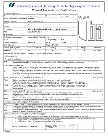 [ logo uczelni ] Wydział Budownictwa i Architektury Kierunek studiów Forma studiów Poziom stacjonarna pierwszy Tytuł zawodowy absolwenta inżynier Obszary studiów nauk technicznych Profil ogólnoakademicki Moduł Przedmiot WZK - Historia sztuki, kultury i wzornictwa Kod WBiA/B/S1/A/02-c Specjalność Jednostka prowadzą ca Katedra Sztuk Wizualnych ECTS 1,0 ECTS (formy) 1,0 Forma zaliczenia zaliczenie Język polski Blok obieralny 2 Grupa obieralna Forma dydaktyczna Kod Semestr Godziny ECTS Waga Zaliczenie W 1 15 1,0 1,00 zaliczenie wykłady Nauczyciel odpowiedzialny Ciesielski Wojciech ([email protected]) Inni nauczyciele Wymagania wstępne W-1 Student powinien dysponowaćpodstawową wiedzą z zakresu historii sztuki i kultury. Powinien posiadaćopanowane podstawowe umiejętności pisania tekstów analityczych oraz samodzielnego zdobywania informacji. Cele modułu/przedmiotu C-1 Celem przedmiotu jest poszerzenie ogólnego obrazu historii sztuki. Premiowane jest indywidualne poznawanie dziejów artystycznych i aktywne uczestnictwo w kulturze. Właściwe zrozumienie historycznych formacji sztuki umożliwia lepsze odczytywanie współczesnej, tym samym umożliwia stworzenie bezpośredniego zwią zku między własną pracą , a obrazem kultury i sztuki w całości. Przedmiot umożliwia wypracowanie krytycznych narzędzi obserwacji współczesnej kultury oraz kształtowania przejrzystego i konsekwentnego, indywidualnego stanowiska wobec wyzwań współczesności. Treści programowe z podziałem na formy zajęć Liczba godzin T-W-1 Ogólne przybliżenie zagadnień, problematyki i najnowszych teorii historii sztuki. T-W-2 Wybrane zjawiska, artyści i zagadnienia sztuki współczesnej XXI i XX wieku. Trickster jako strategia artystyczna, Artysta jako współkreator zmiany społecznej, Relacja artysty z władzą – obywatel aktywny. Artysta jako krytyk kultury i sztuki, Postawy tautologiczne - autorefleksyjne w sztuce, Rynek sztuki sztuka jako towar i narzędzie propagandy, Poszerzanie granic sztuki. Nowoczesnośćw polskiej sztuce międzywojnia. 1 Obcią żenie pracą studenta - formy aktywności A-W-1 A-W-2 14 Liczba godzin Uczestnictwo na wykładach, student powinien dysponowaćwystarczają cą wiedzą by swobodnie poruszaćsię w problemtyce sztuki współczesnej i w sposób otwarty dostrzegaćróżne aspekty jej funkcjonowania. Praca własna, Kolokwium sprawdzajace zdobytą wiedzę, zarówno pod względem faktograficznym jak i umiejętnego wyrażania własnej opinii oraz analizy dzieła sztuki współczesnej. 15 15 Metody nauczania / narzędzia dydaktyczne M-1 M-2 M-3 Wykłady - seria wykładów podejmują cych wybrane zagadnienai z zakresu historii sztuki designu i kultury. Kolokwium - test sprawdzają cy posiadaną wiedzę oraz umiejętnośćkrytycznego odnoszenia się do zadanych problemów, samodzielnego wyrażania opinii i umiejetnego motywowania dokonywanych wyborów. Praca pisemna - samodzielna praca, która rozwija umiejętnośćkrytycznego myślenia, analizy faktów oraz wygłaszania opinii popartych uzasadnionymi argumentami. Sposoby oceny (F - formują ca, P - podsumowują ca) S-1 F Aktywność- aktywne uczestnictwo studenta na zajęciach, także obecnośćstudenta na zajęciach. S-2 P Praca pisemna - samodzielna praca, która rozwija umiejętnośćkrytycznego myślenia, analizy faktów oraz wygłaszania opinii popartych uzasadnionymi argumentami. S-3 P Kolokwium - ocena czą stkowa wpływają ca na ocenę końcową Zamierzone efekty kształcenia Wiedza Odniesienie do efektów kształcenia dla kierunku studiów Odniesienie do efektów zdefiniowanych dla obszaru kształcenia Odniesienie do efektów kształcenia prowadzą cych do uzyskania tytułu zawodowego inżyniera Cel przedmiotu Treści programowe Metody nauczania Sposób oceny [ logo uczelni ] Wydział Budownictwa i Architektury B_1A_S1/A/02-c_W01 Student ma elementarną wiedzę z zakresu historii sztuki, w pogłębionym zakresie zna powyższe zagadnienia w odniesieniu do w. XIX., a przede wszystkim do wieków XX. i XXI.; T-W-1 T-W-2 C-1 M-1 S-1 S-2 S-3 M-1 S-1 S-2 S-3 Umiejętności Inne kompetencje społeczne i personalne B_1A_S1/A/02-c_K01 Student jest zdolny krytycznie odnosićsię do własnych oraz cudzych działań projektowych; dostrzega etyczne problemy we własnej oraz cudzej twórczości; będą c zdolnym do elementarnej refleksji na temat rzeczywistości społeczno-gospodarczej, w sposób zdystansowany i świadomy analizuje zjawiska rynkowe Efekt Ocena T-W-1 B_1A_K01 B_1A_K02 T1A_K01 T1A_K02 InzA_K01 T-W-2 C-1 Kryterium oceny Wiedza B_1A_S1/A/02-c_W01 2,0 3,0 3,5 4,0 4,5 5,0 Student nie dysponuje podstawową wiedzą z zakresu prowadzonych zajęć. Student dysponuje elementarnymi informacjami z zakresu prowadzonych zajęć. Student dysponuje elementarnymi informacjami z zakresu prowadzonych zajęc oraz potrafi wykorzystaćtę wiedzę w sposób przemyślany. Student dysponuje podstawową wiedzą z zakresu prowadzonych zajęć, potrafi wykorzystaćposiadane informacje oraz prowadzićdyskusję w obrębie wiedzy przekazanej na zajęciach. Student dysponuje podstawową wiedzą z zakresu prowadzonych zajęć, potrafi wykorzystaćkreatywnie posiadane informacje oraz prowadzićdyskusję w odniesieniu do wiedzy posiadanej także z innych źródeł. Student dysponuje szeroką wiedzą z zakresu prowadzonych zajęć, potrafi w efektywny i przemyślany sposób prezentować, analizowaćoraz prowadzićdyskusję w odniesieniu do wiedzy, posiadanej także z innych źródeł. Umiejętności Inne kompetencje społeczne i personalne B_1A_S1/A/02-c_K01 2,0 3,0 3,5 4,0 4,5 5,0 Student nie dysponuje podstawową wiedzą z zakresu prowadzonych zajęć. Student dysponuje elementarnymi informacjami z zakresu prowadzonych zajęć. Student dysponuje elementarnymi informacjami z zakresu prowadzonych zajęćoraz potrafi wykorzystac tę wiedzę w sposób przemyślany. Student dysponuje podstawową wiedzą z zakresu prowadzonych zajęć, potraf