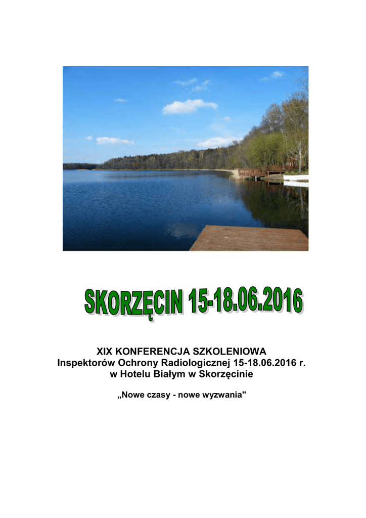 XIX KONFERENCJA SZKOLENIOWA Inspektorów Ochrony Radiologicznej 15-18.06.2016 r. w Hotelu Białym w Skorzęcinie „Nowe czasy - nowe wyzwania" PROGRAM XIX spotkania Inspektorów Ochrony Radiologicznej 15–18.06.2016 r. Hotel Biały w Skorzęcinie 15.06.2016 ŚRODA godz.18.30 godz.19.00 Przyjazd do Skorzęcina KOLACJA 16.06.2016 CZWARTEK godz. 8.30 – 9.30 ŚNIADANIE godz. 9.50 –10.00 Otwarcie zjazdu przez Dyrektor WCO prof. dr hab. Juliana Malickiego i Prezesa SIOR Marię Kubicką godz.10.00 - 11.20 SESJA I „Istotne zmiany w ochronie radiologicznej” Przewodniczą sesji: Maria Kubicka, Julian Malicki godz. 10.10 –10.25 „Potencjalne zmiany w kształceniu przed- i podyplomowym fizyków medycznych i elektroradiologów w Polsce" Julian Malicki - Wielkopolskie Centrum Onkologii – Poznań godz. 10.25 –10.40 „Ochrona radiologiczna w medycynie nuklearnej " Leszek Królicki, Agata Sackiewicz – Warszawa godz. 10.40–10.55 „Ochrona fizyczna źródeł promieniotwórczych" Monika Skotniczna – Państwowa Agencja Atomistyki Departament Ochrony Radiologicznej – Warszawa godz. 10.55–11.10 „Dyrektywa BSS w zakresie postępowania awaryjnego" Krzysztof Dąbrowski– Państwowa Agencja Atomistyki Centrum ds. Zdarzeń Radiacyjnych – Warszawa godz.11.10 –11.25 „Bezpieczeństwo jądrowe i ochrona radiologiczna w Programie polskiej energetyki jądrowej" Kamil Adamczyk – Ministerstwo Energii, Departament Energii Jądrowej - Warszawa godz.11.30 –11.45 PRZERWA KAWOWA godz.11.45 –13.45 SESJA II „Promieniowanie nie jedno ma imię…” Przewodniczą sesji: Kinga Kapecka, Janusz Barczyk, godz.11.45 – 12.05 „IOR na terenie niekontrolowanym” Wiesław Gorączko – Politechnika Poznańska, Laboratorium Radioizotopowe – Poznań godz.12.05 –12.25 „Energia jądrowa wczoraj i dziś" Grzegorz Jezierski – Politechnika Opolska – Opole godz.12.25 –12.45 „Nowa DYREKTYWA UE a narażenie medyczne w Polsce” Dorota Wróblewska godz.12.45 –13.05 „Terapia protonowa” Maciej Budzanowski – Instytut Fizyki Jądrowej - Kraków godz.13.05 –13.20 „Terapia protonowa” Andrzej Woźniak – NZOZ Medyczna Spółka NUBRAPOL LTD Sp. z o.o. "Oddział w Polsce" – Jastrzębie Zdrój godz.13.30 –14.30 OBIAD godz.14.45 – 16.00 SESJA III - SESJA DZIELONA „A może byśmy tak coś policzyli?” Przewodniczą sesji: Jerzy Wojnarowicz i Jerzy Zandberg godz. 14.30 –15.45 „Zaprojektujmy razem osłony dla pracowni akceleratorowej, HDR lub symulatora (do wyboru)” Jerzy Zandberg – Warszawa [GRUPA I, sala nr 1] godz. 14.30 –15.45 „Określenie potrzeby pracy na podstawie zezwolenia lub zgłoszenia. Obliczenia dawki obciążającej” Jerzy Wojnarowicz – Warszawa [GRUPA II, sala nr 2] godz. 15.45 –17.00 „Zaprojektujmy razem osłony dla pracowni badań nieniszczących, rtg lub izotopowej (do wyboru)” Jerzy Zandberg – Warszawa [GRUPA I, sala nr 1] godz. 15.45 –17.00 „Kwalifikacja odpadów promieniotwórczych” Jerzy Wojnarowicz – Warszawa [GRUPA II, sala nr 2] godz.17.00 godz.19.00 17.06.2016 PIĄTEK Walne zebranie Członków SIOR KOLACJA godz. 8.00 – 9.30 ŚNIADANIE godz.10.00 – 16.00 c.d. SESJA III - SESJA DZIELONA „A może byśmy tak coś policzyli?” Przewodniczą sesji: Jerzy Wojnarowicz i Jerzy Zandberg godz. 10.00 –11.30 „Zaprojektujmy razem osłony dla pracowni akceleratorowej, HDR lub symulatora (do wyboru)” Jerzy Zandberg – Warszawa [GRUPA II, sala nr 1] godz. 10.00 –11.30 „Określenie potrzeby pracy na podstawie zezwolenia lub zgłoszenia. Obliczenia dawki obciążającej” Jerzy Wojnarowicz – Warszawa [GRUPA II, sala nr 2] godz.11.40-12.00 PRZERWA KAWOWA godz. 12.00 –14.00 „Zaprojektujmy razem osłony dla pracowni badań nieniszczących, rtg lub izotopowej (do wyboru)” Jerzy Zandberg – Warszawa [GRUPA I, sala nr 1] godz. 12.00 –14.00 „Kwalifikacja odpadów promieniotwórczych” Jerzy Wojnarowicz – Warszawa [GRUPA I, sala nr 2] godz. 14.00 – 15.00 OBIAD godz.15.00-13.30 SESJA IV „Co nowego w przepisach transportowych panel dyskusyjny” Przewodniczą sesji: Janusz Barczyk i Jerzy Wojnarowicz godz. 15.30 – 17.30 „Aktualności, problemy, dyskusja” Janusz Barczyk, Jerzy Wojnarowicz i Jerzy Zandberg godzina 18.00 godz.18.30 ZAKOŃCZENIE KONFERENCJI KOLACJA 18.06.2016 SOBOTA godz. 8.00- 9.30 ŚNIADANIE Sesja plakatowa odbywać się będzie nieprzerwanie w czasie trwania Konferencji. Autorzy proszeni są o zawieszenie pod Posterem informacji dla zainteresowanych o możliwości kontaktu bezpośredniego (nr tel., e-mail, nr pokoju itp.)