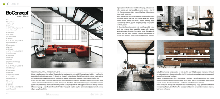 10 meble Inspirowany życiem i atmosferą wielkich miast BoConcept projektuje, produkuje i sprzedaje meble i dodatki dla ludzi, którzy kochają dobre, nowoczesne wzornictwo i miejski styl życia: dynamiczny, podlegający ciągłym zmianom, indywidualny, a jednocześnie cenią komfort, wygodę, prostotę i jakość. Meble i dodatki BoConcept charakteryzuje: modularność — meble można dostosować do indywidualnych oczekiwań, nowoczesne, proste wzornictwo, wysoka jakość wykonania, znakomite naturalne materiały, duński design — połączenie doskonałego wyglądu z funkcjonalnością i komfortem, optymalne rozwiązania pozwalające na wykorzystanie nawet małej przestrzeni. Co roku, na jesieni BoConcept wprowadza na rynek nową kolekcję produktów w trzech różnych liniach stylistycznych; kolekcje odzwierciedlają najnowsze trendy w światowym wzornictwie dostosowane do zmieniających się oczekiwań i potrzeb odbiorców. Wszystkie propozycje firmy można zobaczyć w bezpłatnym katalogu, na stronie internetowej oraz w salonach, które na przełomie sierpnia i września przechodzą gruntowną modernizację. Salony: BoConcept Warszawa ul. Młocińska 5/7 01-065 Warszawa tel. 22/ 636 77 70, fax 22/ 636 65 59 [email protected] BoConcept Gdynia ul. Jana z Kolna 2 (przy Placu Kaszubskim) 81-348 Gdynia tel. 58/ 763 40 44, fax 58/ 763 40 45 [email protected] BoConcept Katowice ul. Dworska 12 40-584 Katowice tel. 32/ 257 24 78, fax 32/ 257 24 79 [email protected] BoConcept Kraków Diamante Plaza ul. Dekerta 24 (skrzyżowanie z ul. Klimeckiego) 30-703 Kraków tel. 12/ 290 04 04, fax 12/ 290 04 05 [email protected] BoConcept Domoteka ul. Malborska 41 03-286 Warszawa – Targówek tel. 22/ 720 46 78 [email protected] BoConcept Wrocław ul. Krakowska 31 50-424 Wrocław tel. 71/ 792 52 13, fax 71/ 792 52 12 [email protected] 152 Miejskie wzornictwo BoConcept BoConcept to najbardziej znana na świecie duńska sieć sklepów z meblami i artykułami wyposażenia wnętrz. Posiada 355 salonów firmowych i studiów w 51 krajach na całym świecie, wśród nich znajduje się 6 sklepów w Polsce: 2 w Warszawie oraz w Katowicach, Krakowie, Wrocławiu i Gdyni. BoConcept projektuje, produkuje i sprzedaje meble dla ludzi, którzy kochają nowoczesne wzornictwo i miejski styl życia: dynamiczny, podlegający ciągłym zmianom, indywidualny, a jednocześnie ceniący komfort i relaks. BoConcept oferuje meble i dodatki do wyposażenia wnętrz mieszkalnych. Asortyment charakteryzuje: modularność — meble można dostosować do indywidualnych potrzeb i oczekiwań, nowoczesne wzornictwo w miejskim stylu, wysoka jakość wykonania, duński design — połączenie doskonałego wyglądu z funkcjonalnością i komfortem, optymalne rozwiązania pozwalające na wykorzystanie nawet małej przestrzeni. Od Szanghaju po Sztokholm. Od Waszyngtonu po Wisbaden. Od Madrytu po Monachium. Od Katowic po Kopenhagę — ponad 245 salonów firmowych i 110 studiów BoConcept w 51 krajach na wszystkich kontynentach, w najbardziej ruchliwych, gwarnych, modnych i stylowych miastach świata. IAinfoarchitekta.pl Katalog BoConcept prezentuje inspirujące aranżacje oraz meble i dodatki z nowej kolekcji. Zawiera także wiele informacji użytecznych przy podejmowaniu decyzji o wyborze wyposażenia domu. Ponad 160 stronnicowe luksusowe wydawnictwo jest dostępne w salonach BoConcept lub można je zamówić przez Internet. Na wiosnę 2009 BoConcept rozszerzył ofertę o usługi projektowe w domu klienta — wykwalifikowani projektanci wnętrz i doradcy klienta dokonują pomiaru pomieszczeń, przygotowują projekt aranżacji wnętrza, doradzają jakie wybrać meble i dodatki, pomagają w wyborze kolorystyki. Usługę można zarezerwować za pośrednictwem strony internetowej www.boconcept.pl. W Polsce pierwszy salon BoConcept został otwarty w 2000 roku. Obecnie w naszym kraju znajduje się 6 salonów: 2 w Warszawie oraz w Katowicach, Krakowie, Gdyni i Wrocławiu. Plany na przyszłość zakładają rozwój sieci sprzedaży w innych dużych miastach tj. Łodzi, Poznaniu czy Szczecinie.
