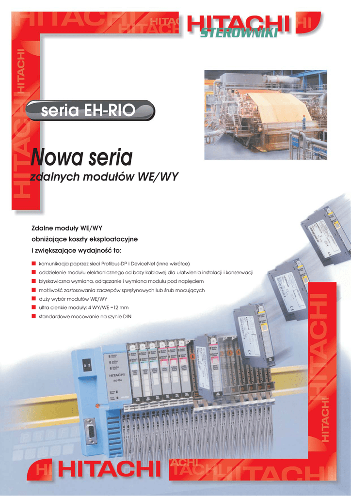 seria EH-RIO Nowa seria zdalnych modułów WE/WY Zdalne moduły WE/WY obniżające koszty eksploatacyjne i zwiększające wydajność to: komunikacja poprzez sieci Profibus-DP i DeviceNet (inne wkrótce) oddzielenie modułu elektronicznego od bazy kablowej dla ułatwienia instalacji i konserwacji błyskawiczna wymiana, odłączanie i wymiana modułu pod napięciem możliwość zastosowania zaczepów sprężynowych lub śrub mocujących duży wybór modułów WE/WY ultra cienkie moduły: 4 WY/WE =12 mm standardowe mocowanie na szynie DIN seria EH-RIO Funkcjonalnie, modułowo zaprojektowane, łatwe w obsłudze. Seria EH-RIO zdalnych modułów WE/WY pozwala funkcjonalnie przekazywać sygnały WE/WYw aplikacji. Używając EH-RIO można precyzyjnie planować i rozwijać moduły lokalizując je tam gdzie są potrzebne blisko czujników i urządzeń wykonawczych. Jest to wysoce opłacalne. Poprzez montowanie modułów w skrzynkach rozdzielczych, na maszynie lub w jej pobliżu minimalizuje się okablowanie jak również potrzebę dalszej kontroli i budowy szafek rozdzielczych. W dzisiejszym modularnym procesie produkcji takie rozwiązanie jest szczególnie korzystne podczas a k t u a l i z a c j i z c e n t ra l i zowa n e g o s ys te m u automatyzacji. Koncepcja projektu: Montaż Każdy moduł WE/WY składa się z trzech komponentów: 1 Płyta montażowa - umożliwia montaż modułów i wyjmowalnych łączników blokowych, zapewnia połączenie między płytką montażową i zewnętrzną dystrybucją mocy. 2 Wymienialny blok łącznikowy zapewnia 8 do 12 oddzielnych łączy do podłączania w terenie. Istnieje możliwość wyboru między zaciskami śrubowymi i sprężystymi. 3 Moduł WE/WY zamienia sygnały zewnętrzne w sygnały s teru jące. Kontrolki LED Moduły WE/WY są montowane na standardowej szynie DIN zapewniając łatwą instalację poprzez prostopadłe wciśnięcie modułu bez użycia dodatkowych narzędzi. Moduły mogą być instalowane oddzielnie lub jako kompletny wcześniej złożony system. Błyskawiczna wymiana modułu Rozdzielenie modułu elektronicznego od wymienialnego bloku stwarza możliwości wymiany bloków elektroniki bez odłączania napięcia i bez konieczności powtórnego okablowania modułu WE/WY. Łatwość używania Wymienialna łączówka i moduły elektroniki umieszczone są w podstawie montażowej ze słyszalnym klikiem, dając pewność że są prawidłowo zainstalowane. Połączenie może być rozłączone tak samo łatwo, bez konieczności zmian w okablowaniu czy zakłócania systemu seria EH-RIO RIO-DNA RIO-DNP RIO-PBA DeviceNet Adapter DeviceNet Interfejs Profibus-DP Adapter 63 moduły 12 modułów 63 moduły 125 kbit/s (500m max) 250 kbit/s (250m max) 500 kbit/s (100m max) 24 VDC 125 kbit/s (500m max) 250 kbit/s (250m max) 500 kbit/s (100m max) 24 VDC Zabezpieczenie przed niewłaściwą polaryzacją napięcia na wejściu 3 czerwone/zielone wskaźniki stanu: - stan łącznika - stan łącznika sieciowego - stan płyty montażowej 2 zielone wskaźniki zasilania: - zasilanie systemu (płyta bazowa 5V) - zasilanie zewnętrzne (z zewn. zasil. 24V) Zabezpieczenie przed niewłaściwą polaryzacją napięcia na wejściu 3 czerwone/zielone wskaźniki stanu: - stan łącznika - stan łącznika sieciowego - stan płyty montażowej 2 zielone wskaźniki zasilania: - zasilanie systemu (płyta bazowa 5V) - zasilanie zewnętrzne (z zewn. zasil. 24V) Wydajność prądowa 1A max przy 5VDC ±5% 1A max przy 5VDC ±0,5% Rozmiary (wys x szer x głęb) 76,2 x 54,9 x 133,4 (mm) 76,2 x 25,4 x 133,4 (mm) MODUŁ KOMUNIKACYJNY Możliwości rozszerzania WE/WY Szybkość transmisji Zasilanie Zabezpieczenie przepięciowe od strony zasilania Wskaźniki PŁYTA MONTAŻOWA RIO-BSP / -BSP3 płyta montażowa z wymienialnymi łączówkami i zapinkami sprężynowymi / zasilanie trójfazowe RIO-BSC / -BSC3 płyta montażowa z wymienialnymi łączówkami i zapinkami śrubowymi / zasilanie trójfazowe RIO-BSP, -BSP3 RIO-BSC, -BSC3 Końcówka mocy Napięcie zasilania Prąd zasilania Rozmiary (wys x szer x głęb) 9,6 kbit/s - 12Mbit/s 24 VDC Zabezpieczenie przed niewłaściwą polaryzacją napięcia na wejściu 3 czerwone/zielone wskaźniki stanu: - stan łącznika - stan łącznika Profibus-DP - stan płyty montażowej 2 zielone wskaźniki zasilania: - zasilanie systemu (płyta bazowa 5V) - zasilanie zewnętrzne (z zewn. zasil. 24V) 1A max przy 5VDC ±5% (4,75 - 5,25) 76,2 x 54,9 x 133,4 (mm) Końcówki Zapinki sprężynowe Zapinki śrubowe 28,8VDC, 120/240VAC 10A max 65,0 x 12,0 x 133,4 (mm) MODUŁY WY DC RIO-YTP2 2cyfr. wyjścia, 24V DC, pol. +/-, zabezp. przeciwzwarciowe RIOYTP4 4 cyfr. wyjścia, 24V DC, pol. +/-, zabezp. przeciwzwarciowe Wyjścia RIO-YTP2 RIO-YTP4 2 (1 grupa z 2) logika + 4 (1 grupa z 4) logika + Napięcia stałe 10V DC min, 24V DC znam, 28,8V DC max. Opóźnienie sygnału wyjścia OFF do ON ON do OFF 0,1ms max. 0,1ms max. RIO-XDP2 / RIO-XD2 2cyfr. wejścia, 24V DC, pol. +/RIO-XDP4 / RIO-XD4 4 cyfr. wejścia, 24V DC, pol. +/- Prąd wyjścia Max. 1.0 A na wyjście Max. 2.0 A na moduł Liczba wejść w module Wskaźniki RIO-YTP2 2 zielone / stan modułu / stan sieci 2 żółte wskaźniki stanu wyjścia 2 czerwone wskaźniki stanu błędu wyjścia MODUŁY WE DC Wskaźniki RIO-YTP4 2 zielone / stan modułu / stan sieci 4 żółte wskaźniki stanu wyjścia 4 czerwone wskaźniki stanu błędu wyjścia Pobór prądu 75mA max. przy 5V DC Źródło zasilania DC Napięcie zasilania Zakres napięcia Prąd zasilania RIO-YTP2 RIO-YTP4 Rozmiary (wys x szer x głęb) 24V DC 10 - 28,8V DC 8 mA 16 mA 56,0 x 12,0 x 75,5 (mm) RIO-XDP2, -D2 RIO-XDP4, -XD4 2 (1 grupa z 2) pol. + (RIO-XD2 pol.-) 4 (1 grupa z 4) pol. + (RIO-XD4 pol.) ZAŁ - Napięcie stałe 10V DC min, 24V DC znam, 28,8V DC max. Wejście filtru czasu Przeł. z OFF do ON Przeł. z ON do OFF 0-65ms (1 ms nastaw początkowy) 0-65ms (1 ms nastaw początkowy) Wskaźniki RIO-XD2, -XDP2 RIO-XDP4, -XD4 Pobór prądu 2 zielone / stan modu