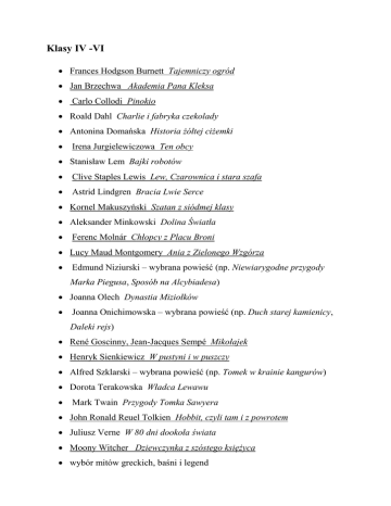 Klasy IV -VI Frances Hodgson Burnett Tajemniczy ogród Jan Brzechwa Akademia Pana Kleksa Carlo Collodi Pinokio Roald Dahl Charlie i fabryka czekolady Antonina Domańska Historia żółtej ciżemki Irena Jurgielewiczowa Ten obcy Stanisław Lem Bajki robotów Clive Staples Lewis Lew, Czarownica i stara szafa Astrid Lindgren Bracia Lwie Serce Kornel Makuszyński Szatan z siódmej klasy Aleksander Minkowski Dolina Światła Ferenc Molnár Chłopcy z Placu Broni Lucy Maud Montgomery Ania z Zielonego Wzgórza Edmund Niziurski – wybrana powieść (np. Niewiarygodne przygody Marka Piegusa, Sposób na Alcybiadesa) Joanna Olech Dynastia Miziołków Joanna Onichimowska – wybrana powieść (np. Duch starej kamienicy, Daleki rejs) René Goscinny, Jean-Jacques Sempé Mikołajek Henryk Sienkiewicz W pustyni i w puszczy Alfred Szklarski – wybrana powieść (np. Tomek w krainie kangurów) Dorota Terakowska Władca Lewawu Mark Twain Przygody Tomka Sawyera John Ronald Reuel Tolkien Hobbit, czyli tam i z powrotem Juliusz Verne W 80 dni dookoła świata Moony Witcher Dziewczynka z szóstego księżyca wybór mitów greckich, baśni i legend