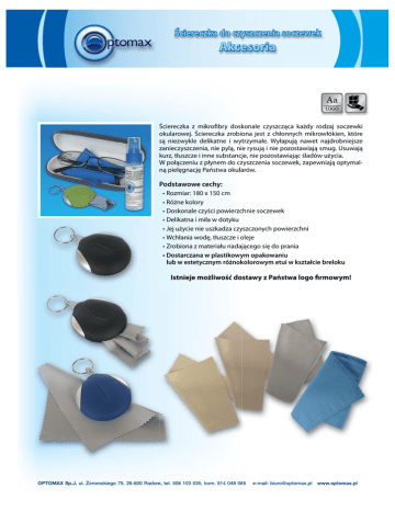 Ściereczka do czyszczenia soczewek Akcesoria Aa LOGO Ściereczka z mikrofibry doskonale czyszcząca każdy rodzaj soczewki okularowej. Ściereczka zrobiona jest z chłonnych mikrowłókien, które są niezwykle delikatne i wytrzymałe. Wyłapują nawet najdrobniejsze zanieczyszczenia, nie pylą, nie rysują i nie pozostawiają smug. Usuwają kurz, tłuszcze i inne substancje, nie pozostawiając śladów użycia. W połączeniu z płynem do czyszczenia soczewek, zapewniają optymalną pielęgnację Państwa okularów. Podstawowe cechy: tRozmiar: 180 x 150 cm tRóżne kolory tDoskonale czyści powierzchnie soczewek tDelikatna i miła w dotyku tJej użycie nie uszkadza czyszczonych powierzchni tWchłania wodę, tłuszcze i oleje tZrobiona z materiału nadającego się do prania tDostarczana w plastikowym opakowaniu lub w estetycznym różnokolorowym etui w kształcie breloku Istnieje możliwość dostawy z Państwa logo firmowym! OPTOMAX Sp.J. www.optomax.pl