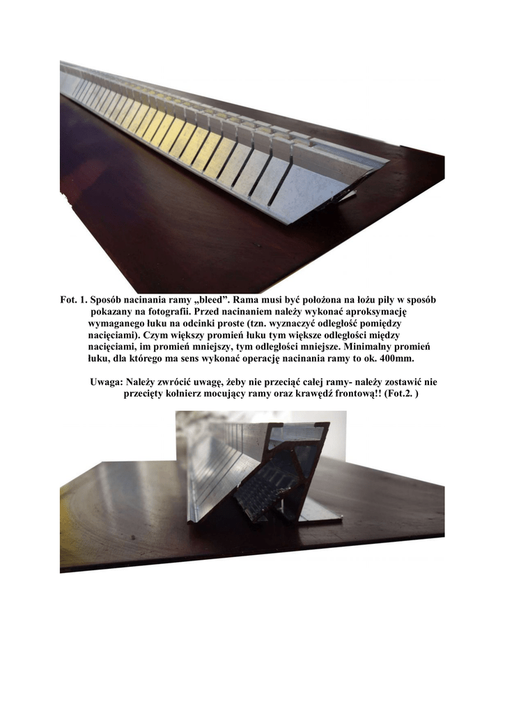 Fot. 1. Sposób nacinania ramy „bleed”. Rama musi być położona na łożu piły w sposób pokazany na fotografii. Przed nacinaniem należy wykonać aproksymację wymaganego łuku na odcinki proste (tzn. wyznaczyć odległość pomiędzy nacięciami). Czym większy promień łuku tym większe odległości między nacięciami, im promień mniejszy, tym odległości mniejsze. Minimalny promień łuku, dla którego ma sens wykonać operację nacinania ramy to ok. 400mm. Uwaga: Należy zwrócić uwagę, żeby nie przeciąć całej ramy- należy zostawić nie przecięty kołnierz mocujący ramy oraz krawędź frontową!! (Fot.2. ) Fot.3. Przed kształtowaniem ramy do wymaganego kształtu należy wyciąć szablon (ze sklejki ok. 4mm lub PVC). Szablon może się składać z kilku połączonych ze sobą części. Na wyciętym szablonie formuje się wcześniej ponacinaną ramę napinającą. Żeby rama zachowała swój kształt po uformowaniu, należy wsunąć w prowadnice ramy płaskownik 15x2mm i przyspawać go punktowo do ramy ( Fot.5. ) w taki sposób, żeby rama się nie odkształcała. Na Fot.6. jest widoczna rama od wnętrza kasetonu, już po zespawaniu. Fot. 7. Widok po napięciu tkaniny winylowej (należy mieć na uwadze, że im mniejszy promień łuku, tym więcej klipów wchodzi do ramy). Klipy należy ciąć na wymiar nie większy niż długość prostego odcinka ramy. Uwagi: Ramę napinającą należy formować jako pierwszy element kasetonu! Dopiero po pospawaniu ramy można formować tył kasetonu ! Napinanie tkaniny winylowej jest ostatnim etapem!