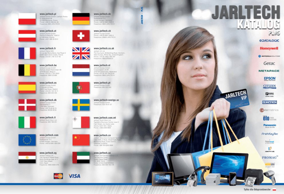 www.jarltech.de Jarltech Europe GmbH / Jarltech Polska ul. Globusowa 38 02-436 Warszawa, Polska Phone: +48 22 / 863 84-26 Freephone: 800 JARLTECH Jarltech Europe GmbH Raiffeisenstr. 5-7 61250 Usingen, Germany Phone: +49 (0) 6081 / 600 - 0 Freephone: 0800 JARLTECH www.jarltech.at www.jarltech.ch Jarltech Austria GmbH Hertha-Firnberg-Str. 10/4/1/1 A-1100 Wien, Austria Phone: +43-1 485 26 05 0 Jarltech Europe GmbH Phone: +49 (0) 6081 / 600 - 0 Freephone: 00800 JARLTECH www.jarltech.fr www.jarltech.co.uk Jarltech France SAS 34 rue des Renouillères, Axe Pleyel 4 93287 Saint Denis Cedex, France Phone: +33 (0)1 / 48 13 27 40 Jarltech UK Ltd. The Courtyard, 30 Worthing Road, Horsham, West Sussex, RH12 1SL, United Kingdom Phone: +44 (0) 1403 / 793 797 Freephone: 0800 876 68 07 www.jarltech.be www.jarltech.nl Jarltech Europe GmbH Avenue Joseph Wybranlaan 40 1070 Brussel, Belgium Phone: +32 (0) 2 / 331 29 81 Freephone: 0800 20 999 Jarltech Europe GmbH Croesinckplein 24-26 2722 EA Zoetermeer, Nederland Phone: +31 (0) 79 / 750 23 05 Freephone: 0800 JARLTECH www.jarltech.es www.jarltech.pt Jarltech Europe GmbH C/ Escudo 4-6 Bajo 28231 Las Rozas, Madrid Phone: +34 (91) 123 10 11 Freephone: 800 033 330 Jarltech Europe GmbH Freephone: 800 033 330 www.jarltech.dk www.jarltech-sverige.se Jarltech Europe GmbH Havneparken 2 7100 Vejle, Denmark Phone: +45 75 85 83 74 Freephone: 80 88 49 64 Jarltech Europe GmbH Freephone: 020-79 41 07 Jarltech Europe GmbH Raiffeisenstr. 5-7 61250 Usingen, Germany Phone: +49 (0) 6081 600-200 F O R A L L Y•+• www.jarltech.com G R Jarltech South West Ltd. Freephone: 800 789 251 A N T www.jarltech.it JARLTECH - PL#5 www.jarltech.pl KATALOG PL#5 www.jarltech.com.mt Jarltech South West Ltd. Tagliaferro Business Centre, Level 2 High Street, c/w Gaiety Lane Sliema, SLM 1551, Malta Phone: +356 2258 0600 www.jarltech.cn Jarltech (Shenzhen) Computer Systems Co., Ltd 3403-3404, A Block, World Trade Plaza, #9 Fuhong Road, Futian District, Shenzhen (518033) Phone: +86 755 8355 0906 www.jarltech.eg www.jarltech.ae Jarltech Trading Ltd. 13/2 Zahraa El Maadi Road, Nerko Buildings Appt. # 11 11431 New Maadi, Cairo, Egypt Freephone: 0800 0000 479 Jarltech Gulf General Trading L.L.C. The Fairmont Dubai Sheikh Zayed Road P.O. BOX 73310 Dubai, United Arab Emirates Freephone: 800 035 702 476 Tylko dla Odsprzedawców »Jarltech Update« – the name says it all! With our print medium, we keep you up-to-date on market and product news, interesting case studies and current promotional activities. JARLTECH Web-App for your iPhone Find all product details and availability, your individual reseller prices and much more in a single app! 323 NOWOŚCI W TYM WYDANIU Datalogic Epson •QuickScan QD2400: Czytnik kodów 2D w atrakcyjnej cenie •TM-C3500: Drukarka atramentowa oferująca wydruk kolorowych etykiet na żądanie •Touch TD1100: Idealne rozwiązanie do skanowania z bliskiej odległości •PowerScan PD9500: Skaner przemysłowy z systemem naprowadzającym •PowerScan DPM 8590: Barcode reader for direct part marking applications Skaner wykorzystujący technologię Direct Part Marking •TM-T88V-DT & TM-T70II-DT: Wielofunkcyjna drukarka z wbudowanym procesorem •TM-P60II: Drukarka przenośna wykorzystująca rozwiązanie ePOS-Print •TM-L90-i: Niezależne drukowanie z dowolnego urządzenia mobilnego bez sterowników Honeywell Citizen •Dolphin 70e Black: Połączenie terminala mobilnego i smartfona •CL-S321: Ultra kompaktowa biurkowa drukarka etykiet •Granit 1910i/1911i: Wytrzymały skaner przemysłowy typu imager •CL-S6621: Niewielkich rozmiarów drukarka o dużej szerokości druku •Thor VM2: Terminal wózkowy polecany do magazynów i centrów dystrybucyjnych Zebra Motorola •GT800: Uniwersalna biurkowa drukarka etykiet •LI 2208: Uniwersalny skaner typu linear imager •Seria iMZ: Przenośne drukarki kompatybilne z systemami iOS, Android, Windows •MC67: Wytrzymały terminal mobilny pracujący w szerokim zakresie temperatur •105SLPlus: Drukarka etykiet zapewniająca niezawodny druk wysokonakładowy •ET1: Kompaktowy tablet klasy korporacyjnej z Androidem •Seria ZXP 1 i ZXP 7: Niezawodne drukarki kart plastikowych •Rozwiązania sieciowe: kontrolery WLAN i punkty dostępowe Glancetron Getac •Z710: Niewielki tablet klasy rugged do pracy w ekstremalnych temperaturach •PS336: Ekstremalnie wytrzymały terminal mobilny z IP68 Metapace •S-61 & S-62: Wszechstronne skanery 2D typu area imager w atrakcyjnej cenie •GT19open: Wysokiej klasy monitor dotykowy do zabudowy •K600: Atrakcyjny cenowo terminal POS •K700: Terminal dotykowy w konkurencyjnej cenie Elo Touch Solutions •IDS: Przekątne ekranu nawet do 70" i moduły komputerowe z procesorem Core i •Retail Tablet: Wytrzymały tablet kasjerski z IP54 •S-3: Niedrogi skaner bezprzewodowy 1D typu linear imager •15M1 VuPoint: Terminal dotykowy dedykowany służbie zdrowia •T-3 Upgrade: Faster, on-board USB, Wi-Fi option PrehKeyTec •Drukarki etykiet: Teraz jeszcze większy wybór Join the Conversation Stay in touch with us and visit us today on Facebook and Twitter. Learn about insights in our company, latest product news and much more as a FAN on Facebook or FOLLOW US on Twitter! •HospiTouch: Innowacyjna klawiatura do zastosowań w placówkach medycznych i laboratoryjnych www.facebook.com/jarltech www.twitter.com/jarltech Freephone: (800) JARLTECH ALL-IN-ONE TOUCH COMPUTER WITH A COMPETITIVE PRICE K700 • Complete POS system with a 15" Touch screen • Intel Atom 2550 processor with 1.86 GHz; 2 GB RAM • IP64-certified front panel, ideal for hospitality WITAMY Szanowni Partnerzy, przed Państwem najnowszy katalog Jarltech. Znajdą w nim Państwo zarówno ostatnie nowości jak i bestsellery wiodących producentów sprzętu POS i Auto-ID. W tym miejscu pragnę również z dumą podkreślić, że dzięki bliskiej współpracy z naszymi dostawcami, nasz najnowszy katalog jest bardziej atrakcyjny i wszechstronny niż 
