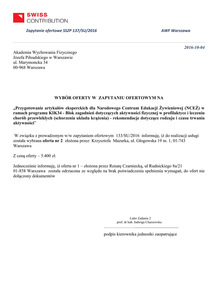 Zapytanie ofertowe SSZP 137/SU/2016 AWF Warszawa 2016-10-04 Akademia Wychowania Fizycznego Józefa Piłsudskiego w Warszawie ul. Marymoncka 34 00-968 Warszawa WYBÓR OFERTY W ZAPYTANIU OFERTOWYM NA „Przygotowanie artykułów eksperckich dla Narodowego Centrum Edukacji Żywieniowej (NCEŻ) w ramach programu KIK34 - Blok zagadnień dotyczących aktywności fizycznej w profilaktyce i leczeniu chorób przewlekłych (schorzenia układu krążenia) - rekomendacje dotyczące rodzaju i czasu trwania aktywności” W związku z prowadzonym w/w zapytaniem ofertowym 133/SU/2016 informuję, iż do realizacji usługi została wybrana oferta nr 2 złożona przez: Krzysztofa Mazurka, ul. Głogowska 19 m. 1, 01-743 Warszawa Z ceną oferty – 5.400 zł. Jednocześnie informuję, iż oferta nr 1 – złożona przez Renatę Czarniecką, ul Rudnickiego 8a/21 01-858 Warszawa została odrzucona ze względu na brak poświadczenia spełnienia wymagań, do ofert nie dołączony dokumentów Lider Zadania 2 prof. dr hab. Jadwiga Charzewska …………………........................................ podpis kierownika jednostki zaopatrujące