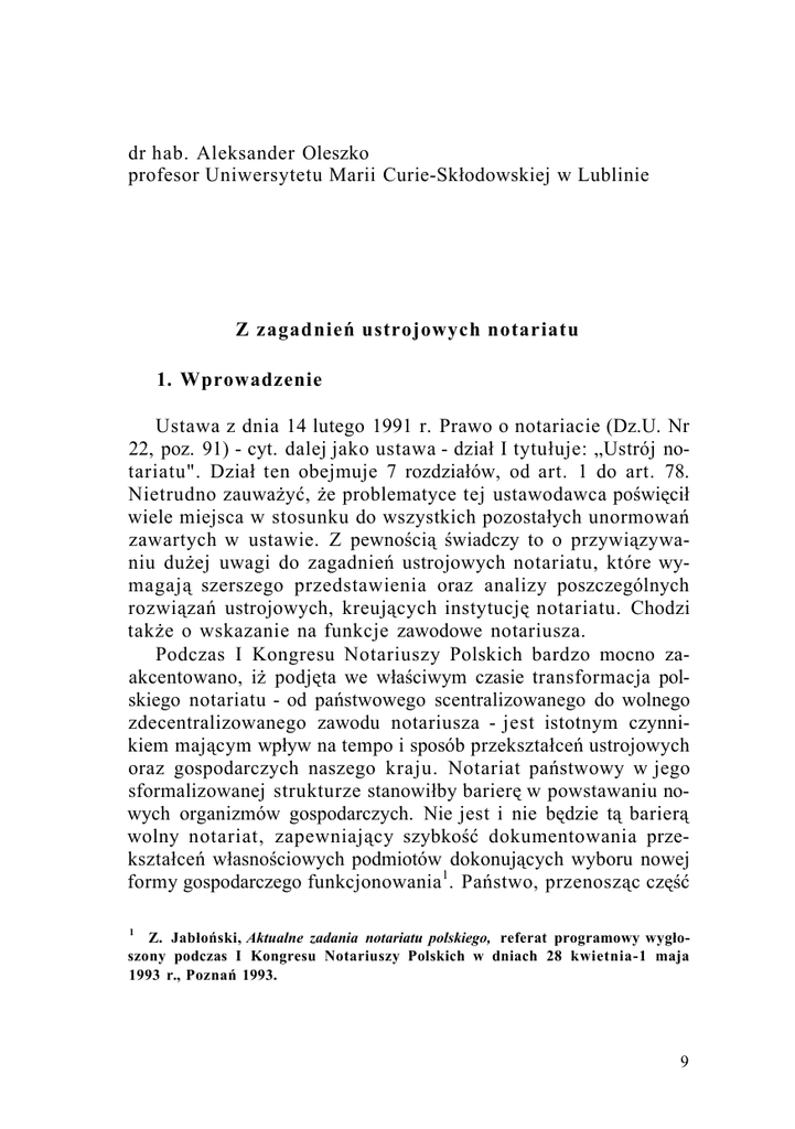 dr hab. Aleksander Oleszko profesor Uniwersytetu Marii Curie-Skłodowskiej w Lublinie Z zagadnień ustrojowych notariatu 1. Wprowadzenie Ustawa z dnia 14 lutego 1991 r. Prawo o notariacie (Dz.U. Nr 22, poz. 91) - cyt. dalej jako ustawa - dział I tytułuje: „Ustrój notariatu". Dział ten obejmuje 7 rozdziałów, od art. 1 do art. 78. Nietrudno zauważyć, że problematyce tej ustawodawca poświęcił wiele miejsca w stosunku do wszystkich pozostałych unormowań zawartych w ustawie. Z pewnością świadczy to o przywiązywaniu dużej uwagi do zagadnień ustrojowych notariatu, które wymagają szerszego przedstawienia oraz analizy poszczególnych rozwiązań ustrojowych, kreujących instytucję notariatu. Chodzi także o wskazanie na funkcje zawodowe notariusza. Podczas I Kongresu Notariuszy Polskich bardzo mocno zaakcentowano, iż podjęta we właściwym czasie transformacja polskiego notariatu - od państwowego scentralizowanego do wolnego zdecentralizowanego zawodu notariusza - jest istotnym czynnikiem mającym wpływ na tempo i sposób przekształceń ustrojowych oraz gospodarczych naszego kraju. Notariat państwowy w jego sformalizowanej strukturze stanowiłby barierę w powstawaniu nowych organizmów gospodarczych. Nie jest i nie będzie tą barierą wolny notariat, zapewniający szybkość dokumentowania przekształceń własnościowych podmiotów dokonujących wyboru nowej formy gospodarczego funkcjonowania1. Państwo, przenosząc część 1 Z. Jabłoński, Aktualne zadania notariatu polskiego, referat programowy wygłoszony podczas I Kongresu Notariuszy Polskich w dniach 28 kwietnia-1 maja 1993 r., Poznań 1993. 9 REJENT Nr 9 - wrzesień 1993 r. swoich kompetencji na notariusza, ma na celu, ażeby świadczone określone posługi publiczne odbywały się w najkorzystniejszych warunkach dla ich skuteczności i bezpieczeństwa 2 . Można zatem stwierdzić, że wśród unormowań odnoszących się do ustroju notariatu, najistotniejszą rolę pełnią postanowienia ustawy, które regulują sposób i zakres „prywatyzacji" notariatu. Chociaż na gruncie naszego prawa cywilnego wyrażana jest zasada swobody formy 3 co do składania oświadczeń woli (art. 60 k.c.), to jednak ustawodawca (państwo) przewiduje wymóg zachowania form pisemnych kwalifikowanych dla określonych czynności prawnych, z uwagi na sposób ich sporządzenia. Zostały one ustanowione zarówno w interesie publicznym, jak i prywatnym, dla zrealizowania różnych funkcji, np. takich, jak: pewność co do tego, że czynność została dokonana, ochrona działającego podmiotu przed nieprzemyślanymi jego własnymi decyzjami, oparta na założeniu, że zachowanie określonej formy wymaga zwykle dodatkowego wysiłku i czasu, jawność czynności prawnych w stosunku do osób trzecich i ochrona ich interesów, zabezpieczenie interesu społecznego przez ułatwienie kontroli nad czynnościami prawnymi, uzyskanie fachowej porady, zabezpieczenie dowodów4. Realizacja zachowania wymogu dla danej formy i jej sporządzenia możliwa jest albo przez wyspecjalizowany aparat państwowy, jakim były państwowe biura notarialne, albo przez powołane ustawowo w przewidzianym trybie określone osoby, jakimi są notariusze oraz prowadzone przez nich kancelarie notarialne (art. 10 w zw. z art. 4 ustawy). Jest to zatem kwestia wyboru przez ustawodawcę drogi wykonania oraz zabezpieczenia sposobu realizacji przymusu dokumentacji. Celem dalszych rozważań jest wskazanie na dwa - jak się 2 3 Z. Jabłoński, Aktualne zadania .... Z. Radwański, Zarys części ogólnej prawa cywilnego , Warszawa 1979, s. 173. 4 Z. Radwański, Zarys ... , s. 174; zob. także E. Drozd, Przeniesienie własności nieruchomości, Warszawa-Kraków 1974, s. 138 i n. 10 Z zagadnień ustrojowych notariatu wydaje - podstawowe elementy, które determinują zakres i sposób „prywatyzacji" notariatu, a zarazem kształtują ustrój notariatu. Chodzi mianowicie o wskazanie na elementy kształtujące charakter prawny notariatu oraz właściwe nadanie treści sformułowaniu, że notariusz jest osobą zaufania publicznego. Innymi słowy wymaga rozważenia, czy prywatyzacja notariatu oznacza tylko, że notariusz jest osobą prywatną, która dokonuje przewidziane prawem czynności notarialne, a więc w określonym zakresie świadczy usługi notarialne, analogicznie jak inne zawody prawnicze świadczące usługi (np. adwokat, radca prawny poza stosunkiem służbowym pracy, czy inne powołane w tym celu podmioty gospodarcze), czy też notariat ma także, i w jakim zakresie, charakter publiczny, wyróżniający go spośród innych zawodów prawniczych, nie będąc organem państwowym. 2. Pozycja i charakter notariatu Zmiany ustrojowe notariatu związane z jego prywatyzacją stanowią szersze zagadnienie prywatyzacji zadań publicznych państwa 5 . Zapoczątkowane zostały ustawą z 1989 r.6, która działalność notariatu ujęła w dwie formy organizacyjne, w postaci utrzymania dotychczasowych pbn oraz powołania indywidualnych kancelarii (art. 1 § 1). Zorganizowany został, chociaż w bardzo ograniczonym zakresie, samorząd notarialny (art. 41 - 47). Zachowano jednak całkowity zwierzchni nadzór ministra sprawiedliwości nad działalnością notariusza oraz pbn (art. 6). Kształtowanie zasad nowego ustroju politycznego oraz ekonomicznego po 1989 r. pozwoliło ustawodawcy uczynić dalszy 5 Nie podzielam stanowiska przyjmującego, iż w ramach prywatyzacji notariatu państwo przeniosło część swoich władczych kompetencji na notariusza, tak Z. Jabłoński, Aktualne zadania ... . Chodzi oczywiście o wykonywanie określonych zadań publicznych państwa. Zob. J. Filipek, Stosunek administracyjnoprawny, Kraków 1968, s. 46 i n.; W. Dawidowicz, Polskie prawo administracyjne, Warszawa 1980, s. 45 i n.; S. Biernat, Prywatyzacja zadań publicznych (Zarys problematyki), PiP 1993, nr 5, s. 3 i n. oraz cyt. tam literatura. 6 Ustawa z dnia 24 maja 1989 r. - Prawo o notariacie (Dz.U