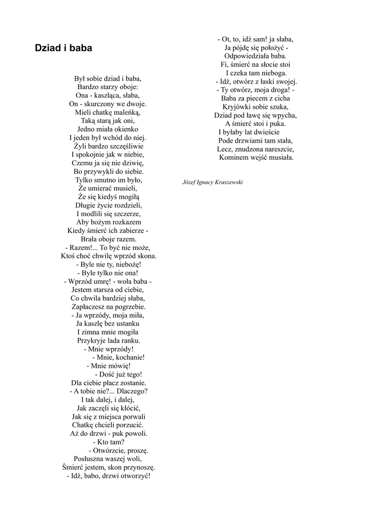 Dziad i baba Był sobie dziad i baba, Bardzo starzy oboje: Ona - kaszląca, słaba, On - skurczony we dwoje. Mieli chatkę maleńką, Taką starą jak oni, Jedno miała okienko I jeden był wchód do niej. Żyli bardzo szczęśliwie I spokojnie jak w niebie, Czemu ja się nie dziwię, Bo przywykli do siebie. Tylko smutno im było, Że umierać musieli, Że się kiedyś mogiłą Długie życie rozdzieli, I modlili się szczerze, Aby bożym rozkazem Kiedy śmierć ich zabierze Brała oboje razem. - Razem!... To być nie może, Ktoś choć chwilę wprzód skona. - Byle nie ty, niebożę! - Byle tylko nie ona! - Wprzód umrę! - woła baba Jestem starsza od ciebie, Co chwila bardziej słaba, Zapłaczesz na pogrzebie. - Ja wprzódy, moja miła, Ja kaszlę bez ustanku I zimna mnie mogiła Przykryje lada ranku. - Mnie wprzódy! - Mnie, kochanie! - Mnie mówię! - Dość już tego! Dla ciebie płacz zostanie. - A tobie nie?... Dlaczego? I tak dalej, i dalej, Jak zaczęli się kłócić, Jak się z miejsca porwali Chatkę chcieli porzucić. Aż do drzwi - puk powoli. - Kto tam? - Otwórzcie, proszę. Posłuszna waszej woli, Śmierć jestem, skon przynoszę. - Idź, babo, drzwi otworzyć! - Ot, to, idź sam! ja słaba, Ja pójdę się położyć Odpowiedziała baba. Fi, śmierć na słocie stoi I czeka tam nieboga. - Idź, otwórz z łaski swojej. - Ty otwórz, moja droga! Baba za piecem z cicha Kryjówki sobie szuka, Dziad pod ławę się wpycha, A śmierć stoi i puka. I byłaby lat dwieście Pode drzwiami tam stała, Lecz, znudzona nareszcie, Kominem wejść musiała. Józef Ignacy Kraszewski