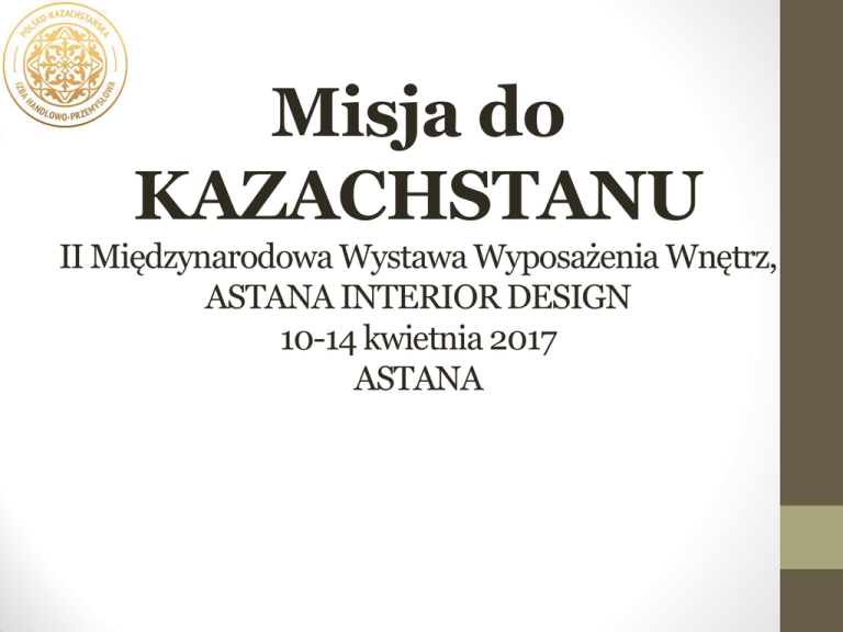 Misja do KAZACHSTANU II Międzynarodowa Wystawa Wyposażenia Wnętrz, ASTANA INTERIOR DESIGN 10-14 kwietnia 2017 ASTANA INFORMACJE O IZBIE Polsko Kazachstańska Izba Handlowo - Przemysłowa istnieje od 2008r. Cele Izby: pomoc w nawiązywaniu wzajemnych kontaktów pomiędzy firmami i instytucjami, w Polsce i na rynku w Kazachstanie, reprezentowanie interesów firm wobec władz Republiki Kazachstanu, udzielanie informacji, doradztwo, organizowanie współpracy gospodarczej w tym misji, organizowanie targów, seminariów, wystaw i innych imprez promocyjnych. Izba współpracuje z polskimi i kazachskimi placówkami dyplomatycznymi, organami administracji rządowej, samorządowej i gospodarczej w Polsce i w Kazachstanie. Zasiadamy w Polsko-Kazachstańskiej Komisji Międzyrządowej ds. Współpracy Gospodarczej. Szanowni Państwo! • Serdecznie zapraszamy do udziału w misji gospodarczej do Kazachstanu w dniach 10-14 kwietnia 2017. • Misja odbędzie się podczas trwania międzynarodowych targów branży wyposażenia wnętrz II edycji Kazachstańskiej Międzynarodowej Wystawy „ASTANA INTERIOR DESIGN” 2017. „ASTANA INTERIOR DESIGN” w Astanie to: • Design podłóg: kamień, ceramika, parkiet, panele podłogowe, drewno, mozaika, nowe materiały podłogowe; • Design mebli: meble mieszkalne, biurowe, kuchenne, zabudowane meble, meble ekologiczne, HORECA; • Wystrój architektoniczny i tekstylia: tekstylia do wyposażenia wnętrz, firany i zasłony, obrazy, kominki; • Oświetlenie: żyrandole, lampy stojące, przyrządy oświetleniowe itd.; • Design łazienki: ceramika, technika sanitarna, ścienne i podłogowe pokrycia, meble, dodatki i akcesoria montażowe; • Nowe technologie: najnowsze technologie, 3 D – drukarki itd.; „ASTANA INTERIOR DESIGN”: • Ponad 7000 odwiedzających • Państwa uczestniczące: Kazachstan, Rosja, Białoruś, Ukraina, Niemcy, Zjednoczone Emiraty Arabskie, Włochy. Patronat nad imprezą • Firma "ЭкспоКомфорт" • Magazyn wyposażenia wnętrz klasy biznesowej “INSIDE INTERIOR” PAKIET PLATYNOWY • Przelot na trasie WARSZAWA-ASTANA-WARSZAWA; • Zakwaterowanie w hotelu *** w pokojach jednoosobowych wraz ze śniadaniami; • Catering wg programu; tłumacz; usługi logistyczne; • Karty wstępu na targi „ASTANA INTERIOR DESIGN”; • Udział w spotkaniach matchmakingowych i branżowych; • Spotkania dedykowane dla firmy z wybranymi partnerami kazachskimi • Udział w spotkaniach oficjalnych zorganizowanych przez Izbę w Kazachstanie • Udział w spotkaniach z instytucjami otoczenia biznesu • Prezentację swoich materiałów reklamowych na stoisku WPHI; • Możliwość odbywania rozmów handlowych na stoisku targowym WPHI. PAKIET ZŁOTY • Przelot na trasie WARSZAWA-ASTANA-WARSZAWA; • Zakwaterowanie w hotelu *** w pokojach jednoosobowych wraz ze śniadaniami; • Catering wg programu; tłumacza; usługi logistyczne; • Karty wstępu na targi „ASTANA INTERIOR DESIGN”; • Udział w spotkaniach matchmakingowych i branżowych; • Prezentację swoich materiałów reklamowych na stoisku WPHI; • Możliwość odbywania rozmów handlowych na stoisku targowym WPHI. PAKIET SREBRNY • Prezentacja materiałów reklamowych firmy na stoisku WPHI; • Prezentacja firmy na targach przez profesjonalną dedykowaną hostessę; • Przedstawienie firmy przez hostessę na stoiskach wystawienniczych; • Pozyskanie przez hostessę kontaktów handlowych spośród firm wystawienniczych; PAKIET BRĄZOWY • Prezentacja materiałów reklamowych firmy na stoisku WPHI; Kontakt: Polsko-Kazachstańska Izba Handlowo-Przemysłowa ul. Trębacka 4, 00-074 Warszawa tel/fax: + 48 22 630 97 82 tel: + 48 22 630 96 53 Ewelina Gądek [email protected] tel: +48 501 510 904